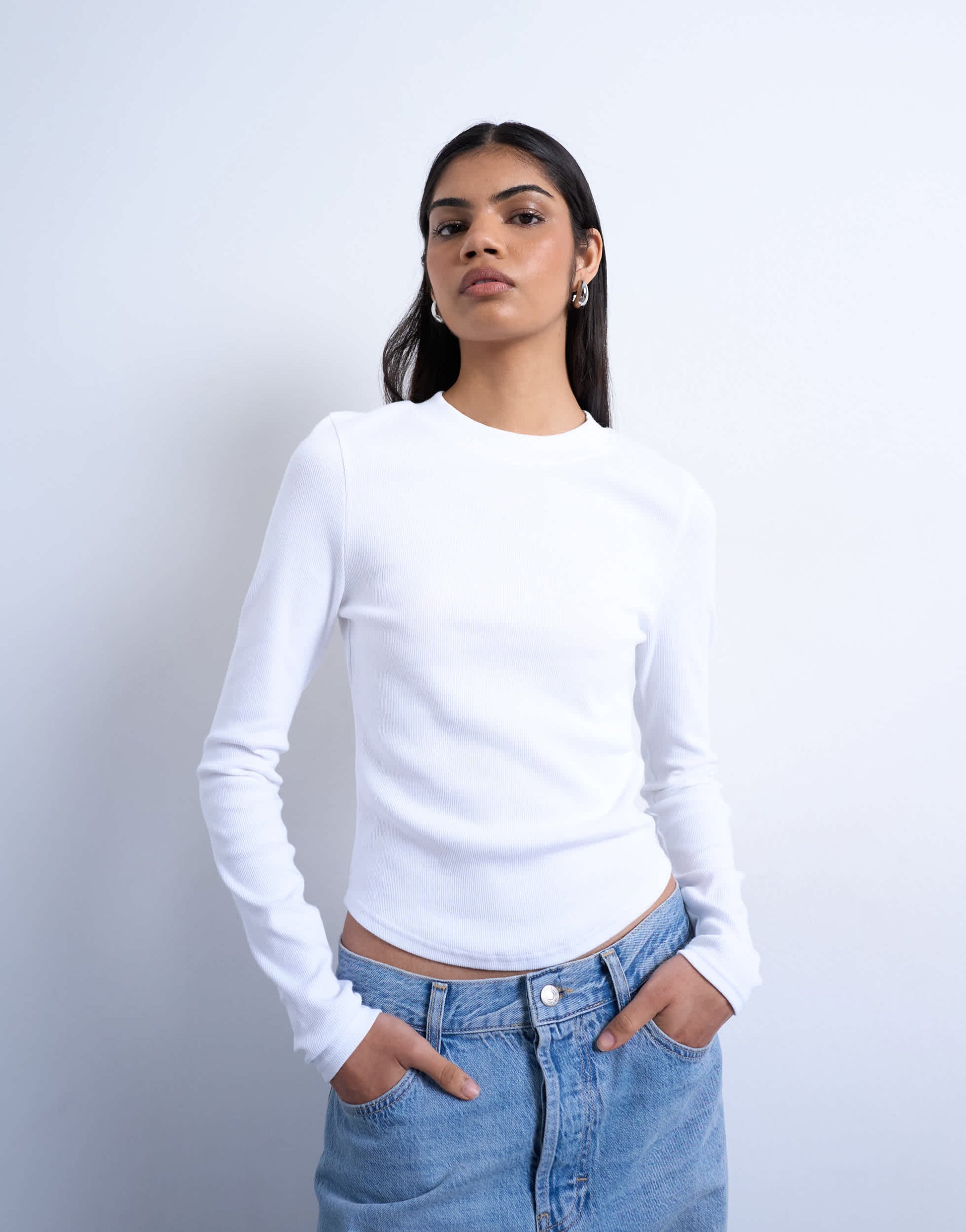 Oberteile von TopshopDieses Oberteil aus geripptem Jersey in Weiß besticht durch seinen Rundhalsausschnitt, die langen Ärmel und den abgerundeten Saum. Der schmale Schnitt sorgt für eine elegante Silhouette.