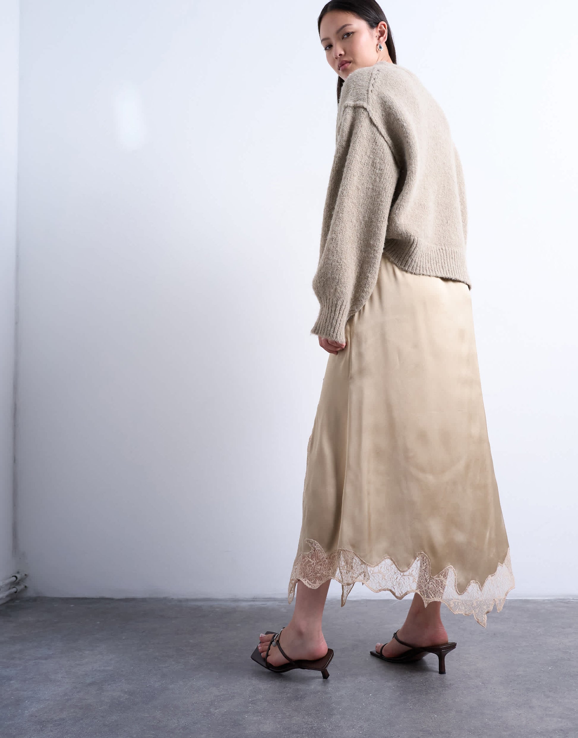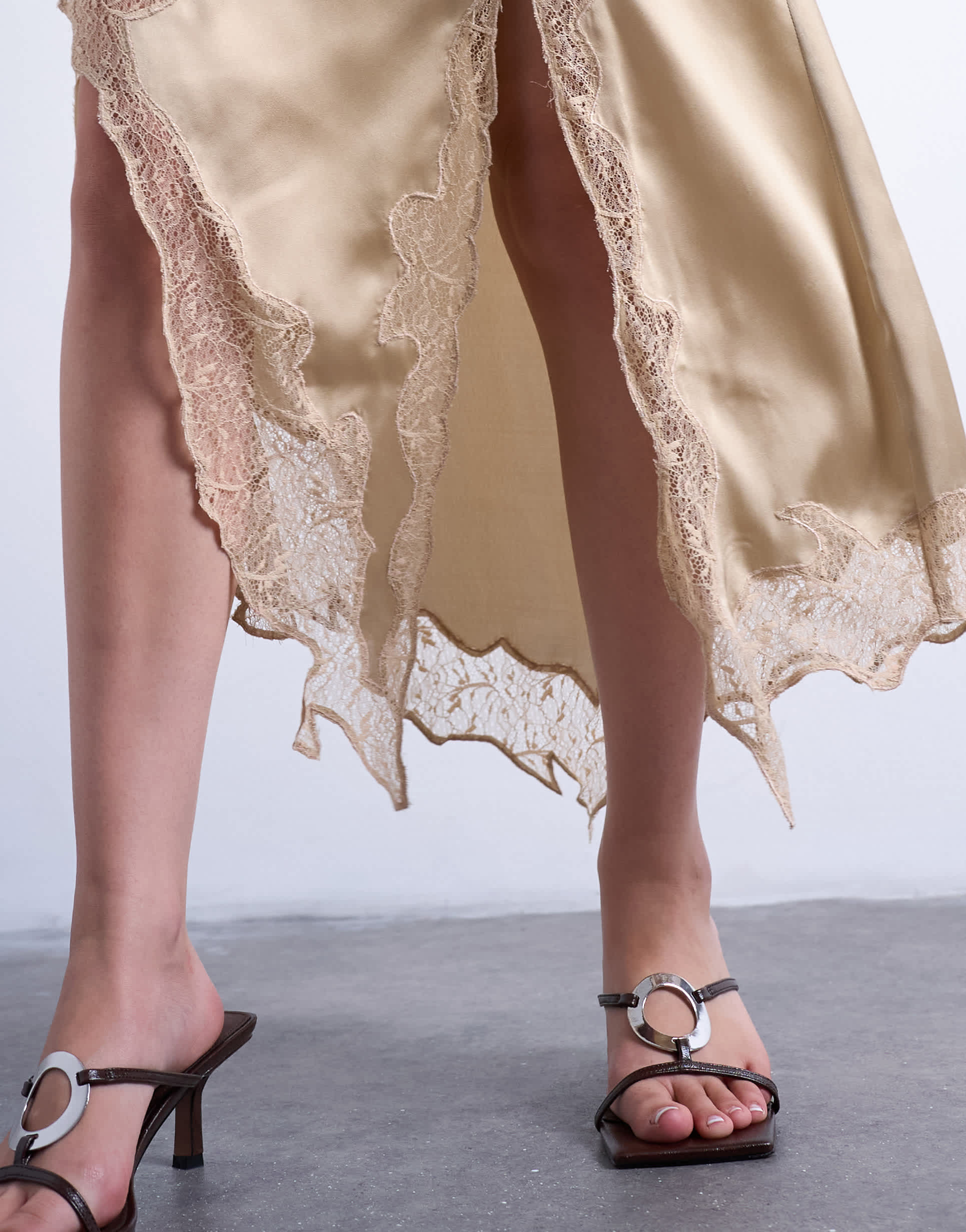 Röcke von TopshopDieser Rock ist aus einem glänzenden Stoff in Satinoptik gefertigt. Er hat einen hohen Bund, Spitzeneinsätze, einen seitlichen Reißverschluss, einen asymmetrischen Saum und ist normal geschnitten.