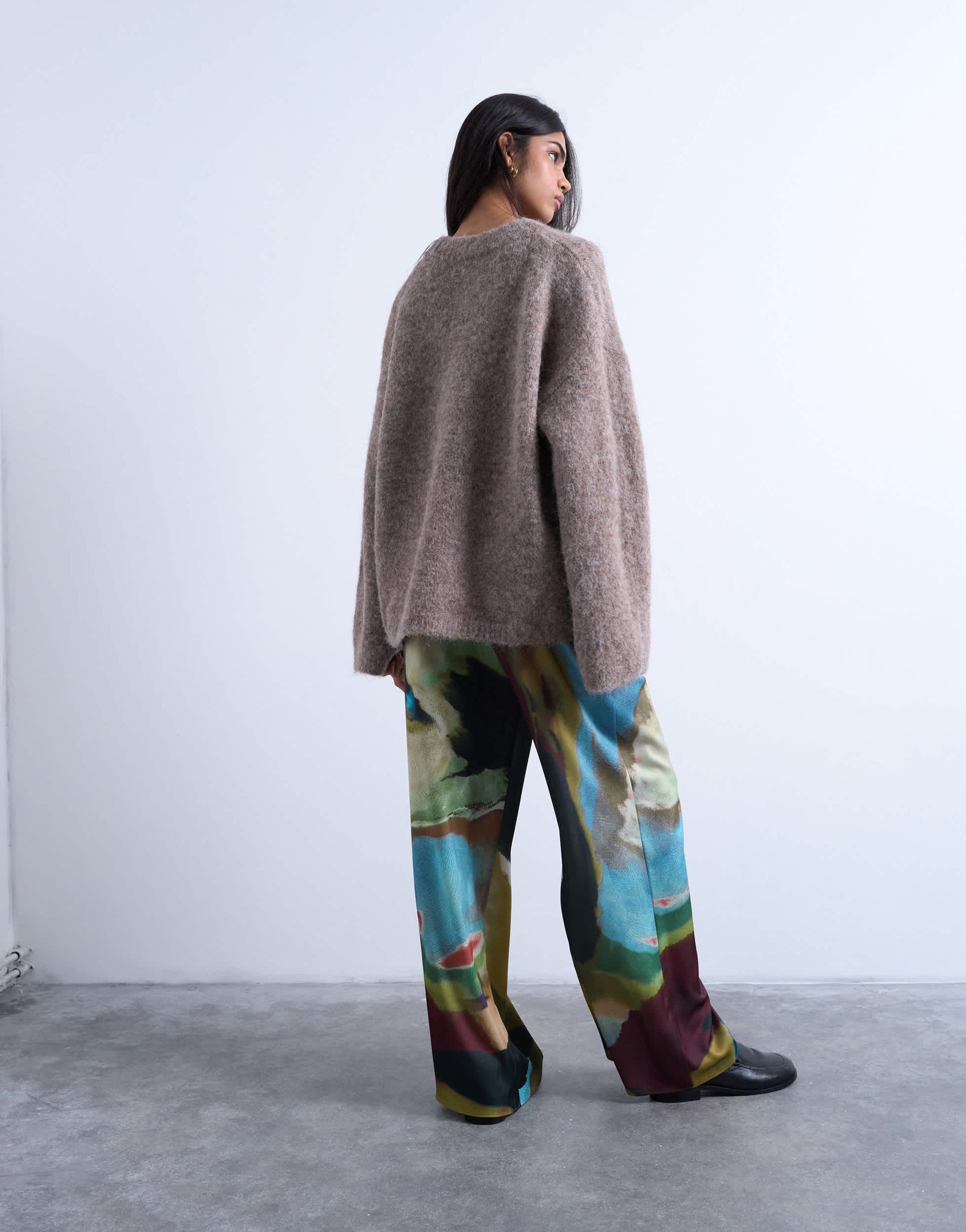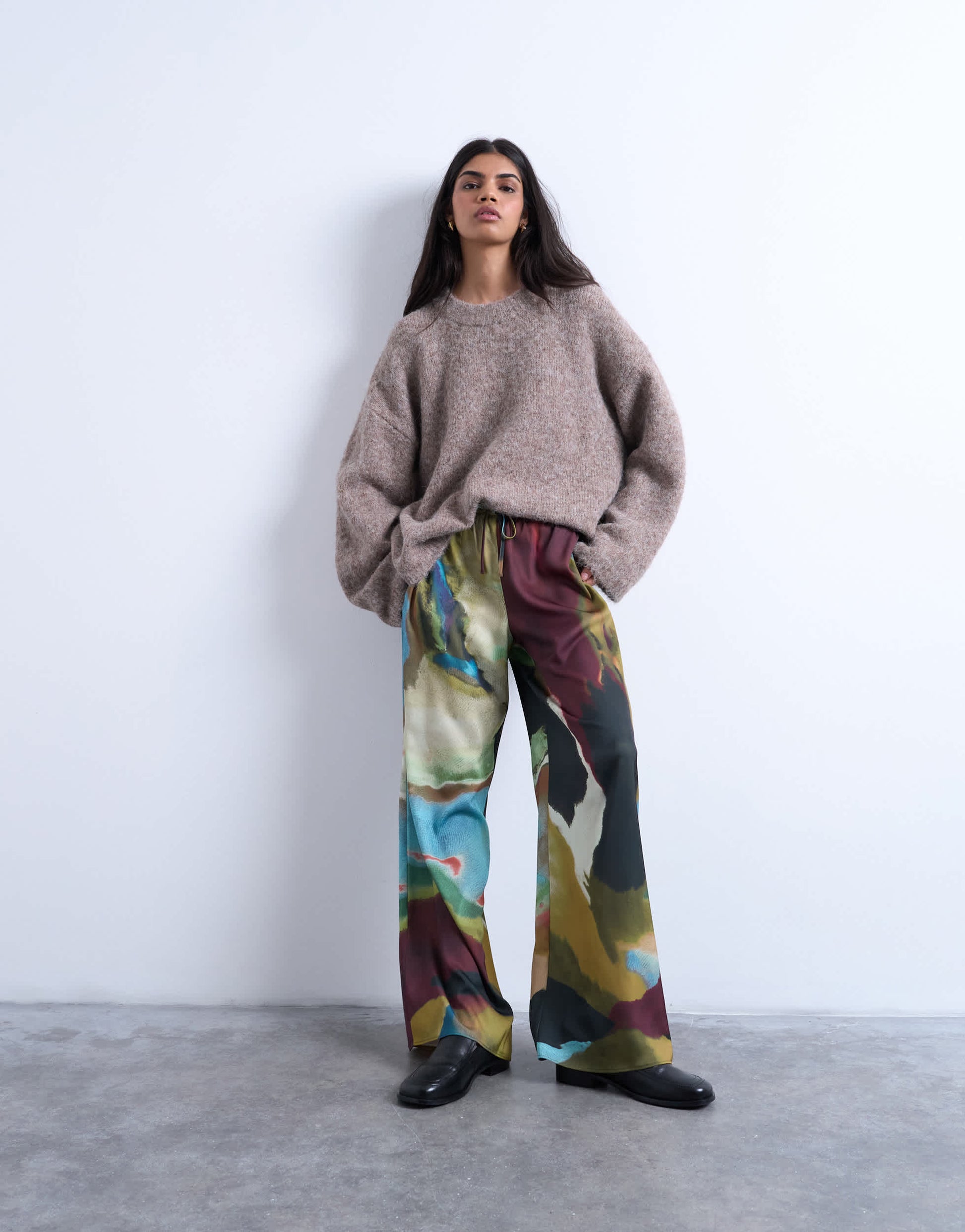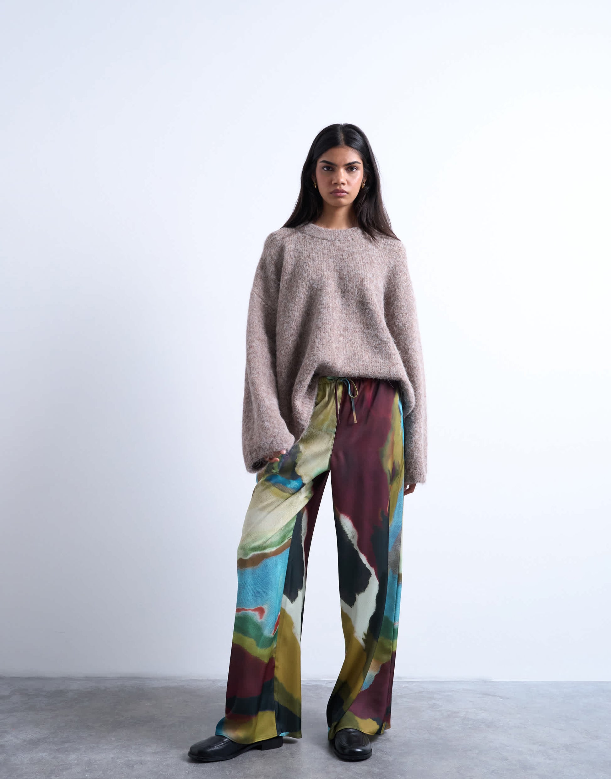 Hosen und Leggings von Topshop- Diese Hose ist aus einem glänzenden, satinartigen Stoff gefertigt und mit einem abstrakten Muster versehen. Sie hat einen hohen Bund, einen Kordelzug, Seitentaschen und ein weites Bein.