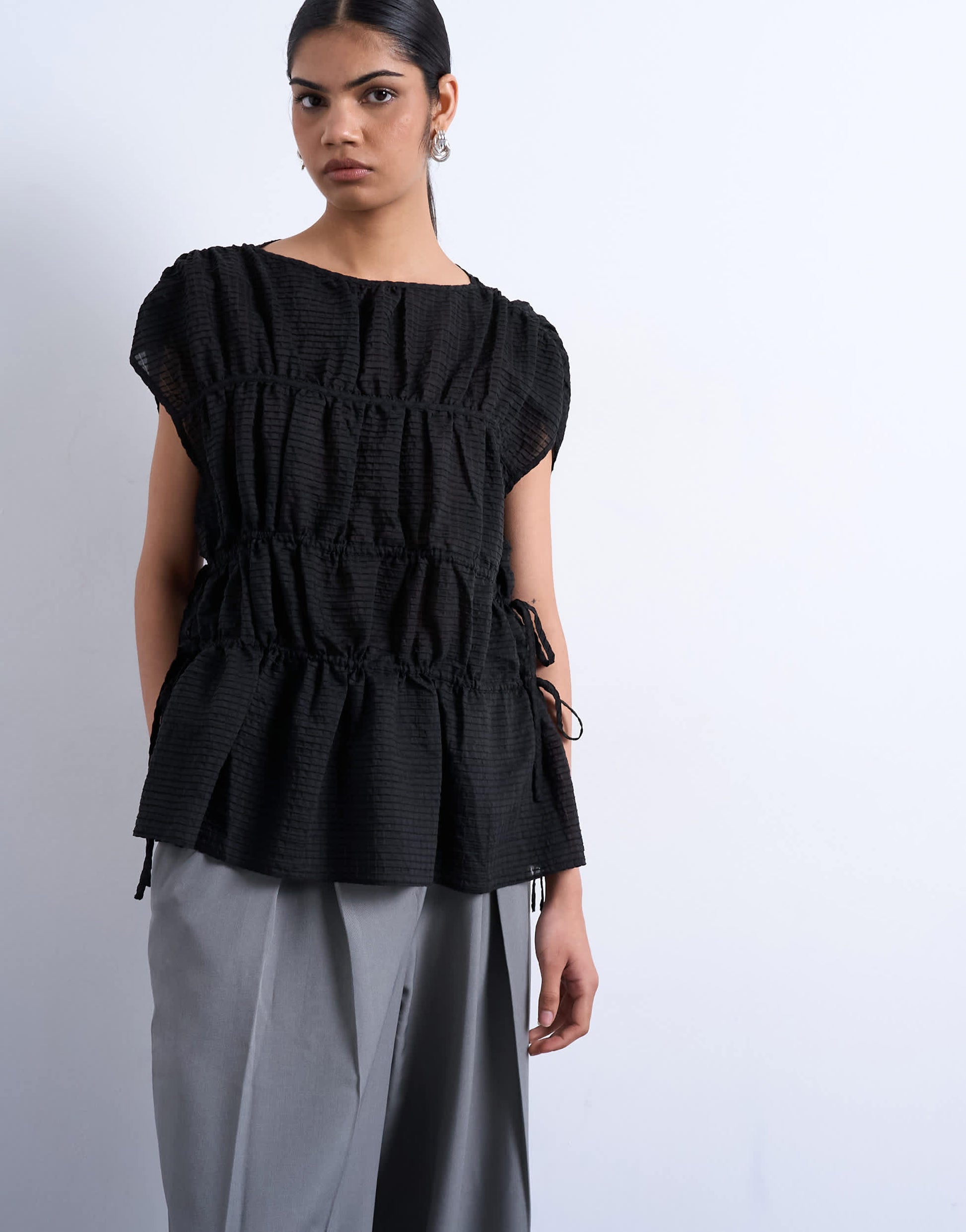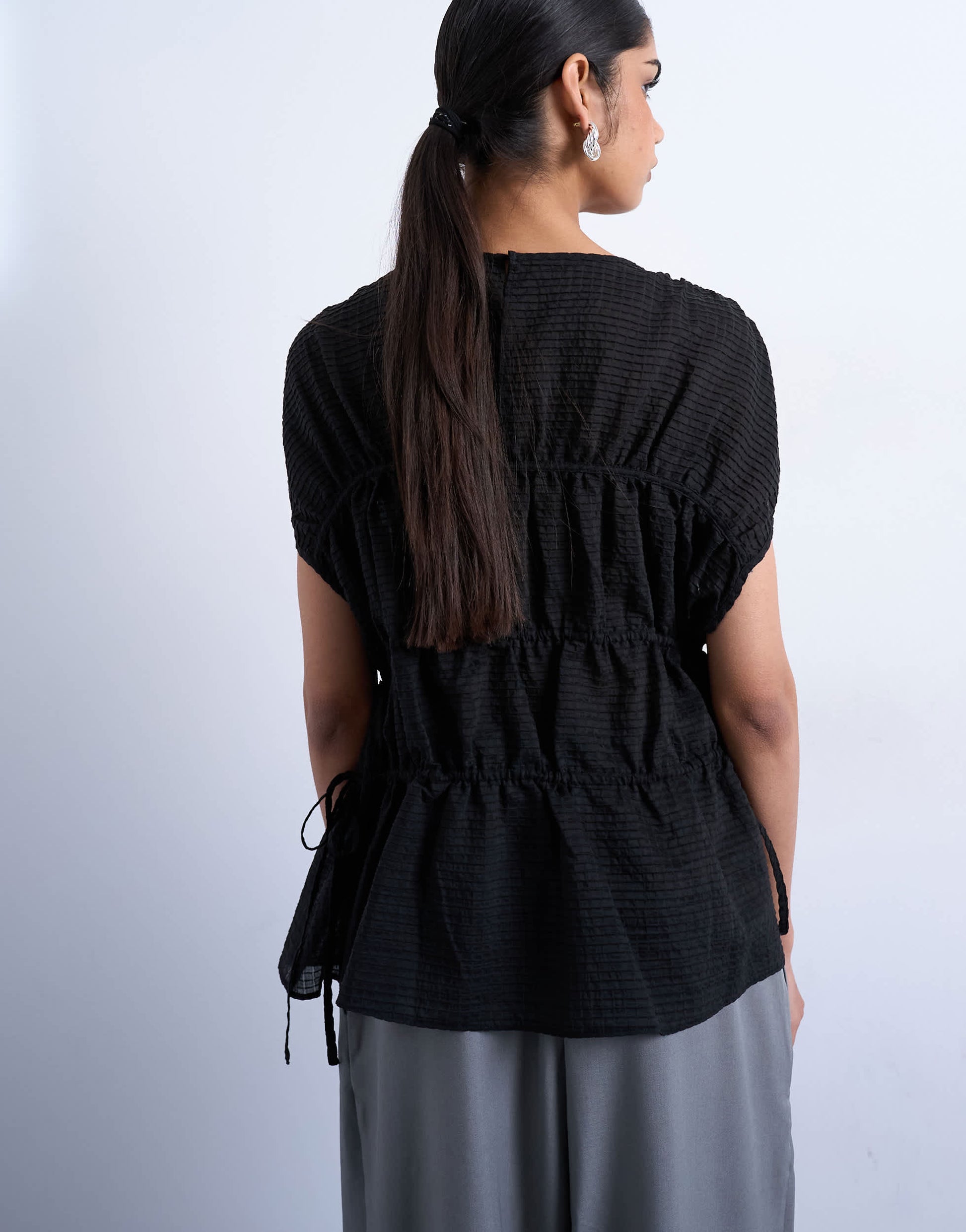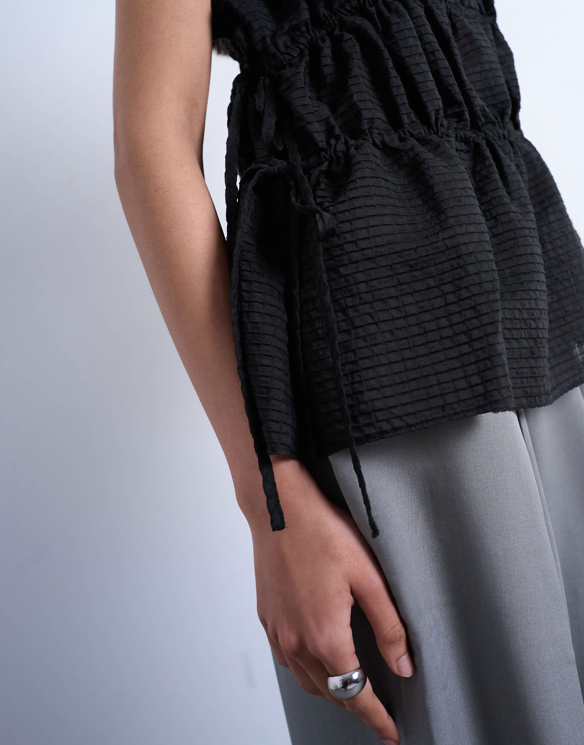 Oberteile von TopshopDieses Oberteil ist aus einem strukturierten Webstoff gefertigt. Es hat einen Rundhalsausschnitt, kurze Ärmel und Bindebänder an den Seiten.