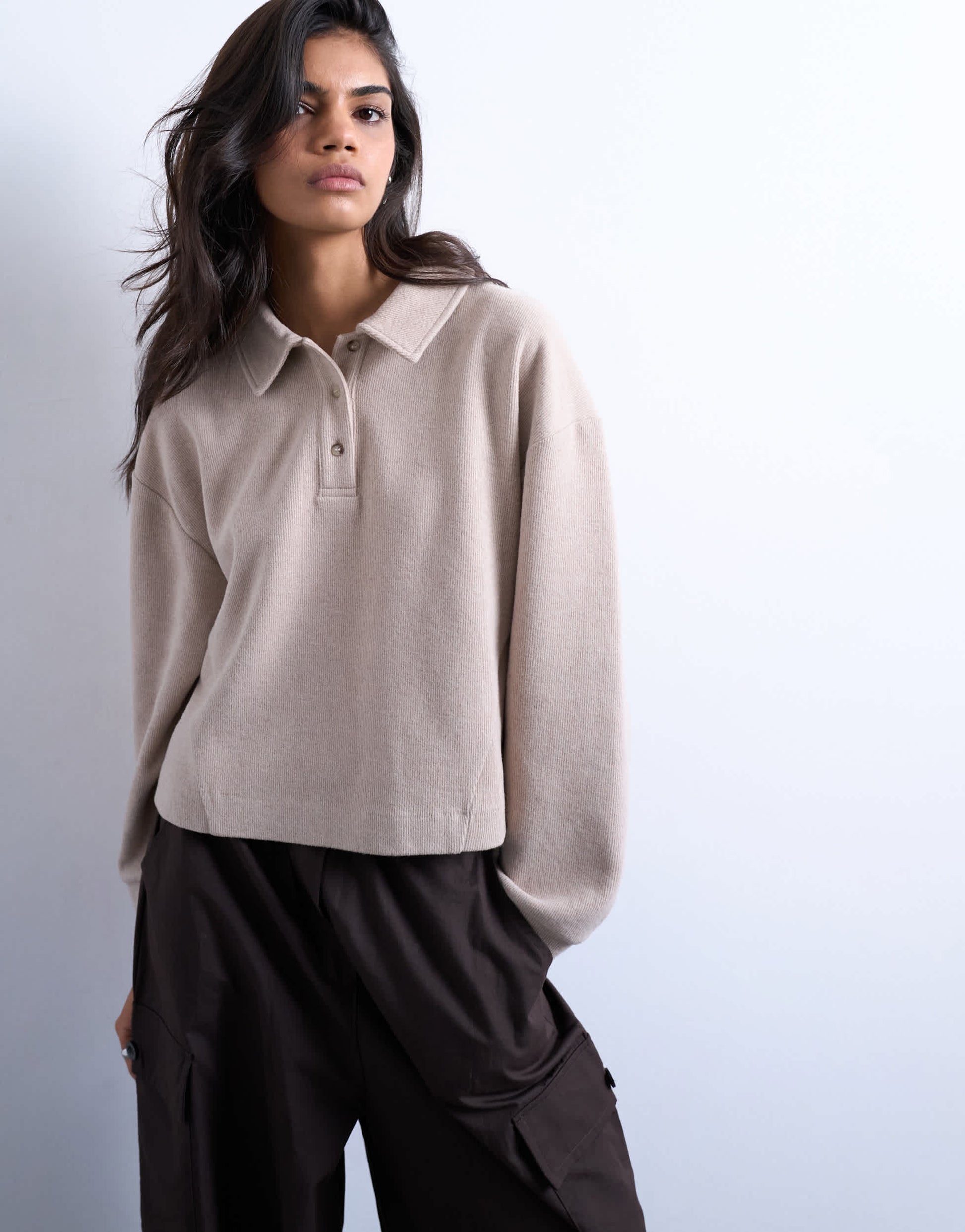 Oberteile von TopshopDieses Oberteil ist aus einem weichen Strickstoff gefertigt. Es hat einen Kentkragen, eine teilweise geknöpfte Knopfleiste, lange Ärmel und ist kastenförmig geschnitten.