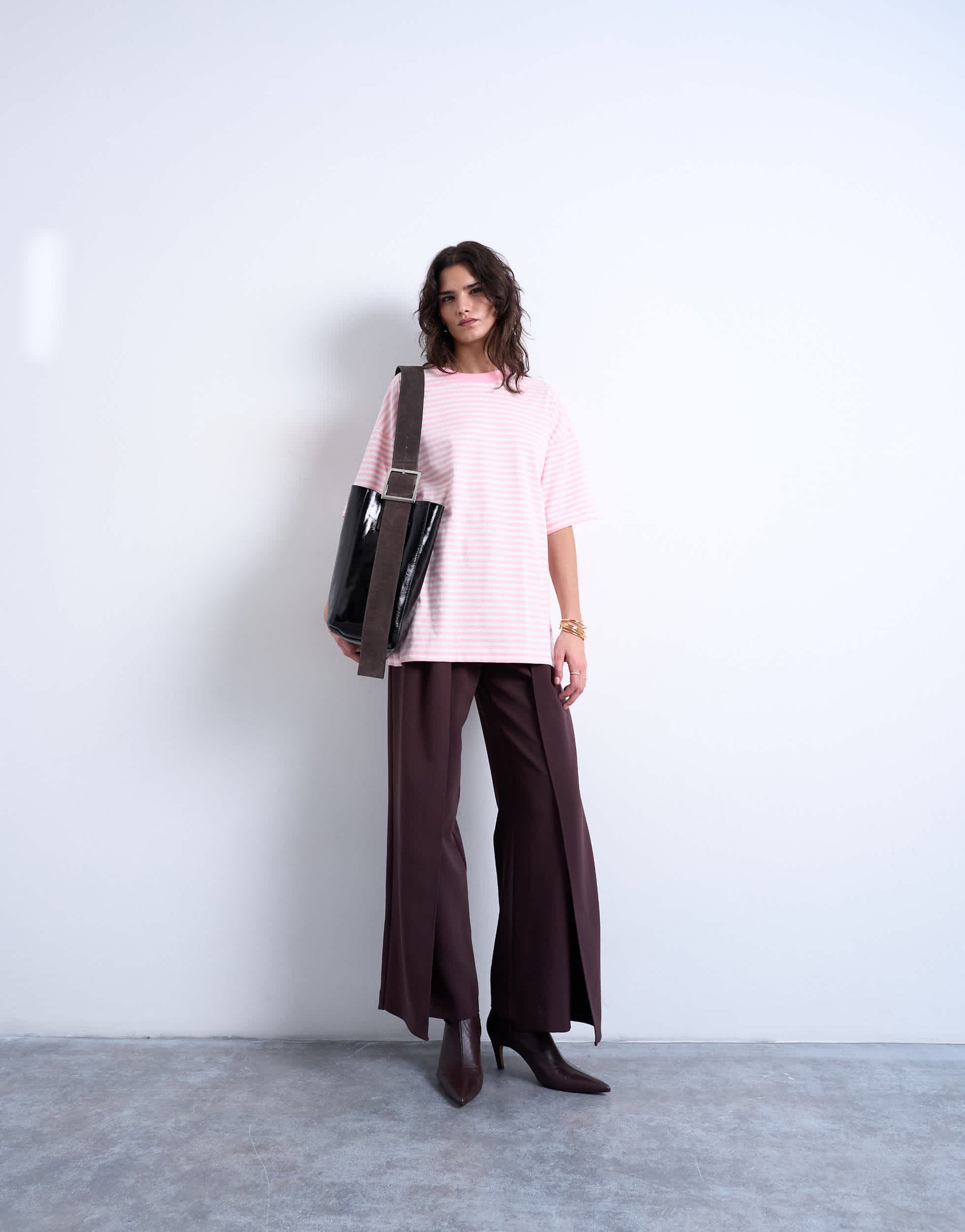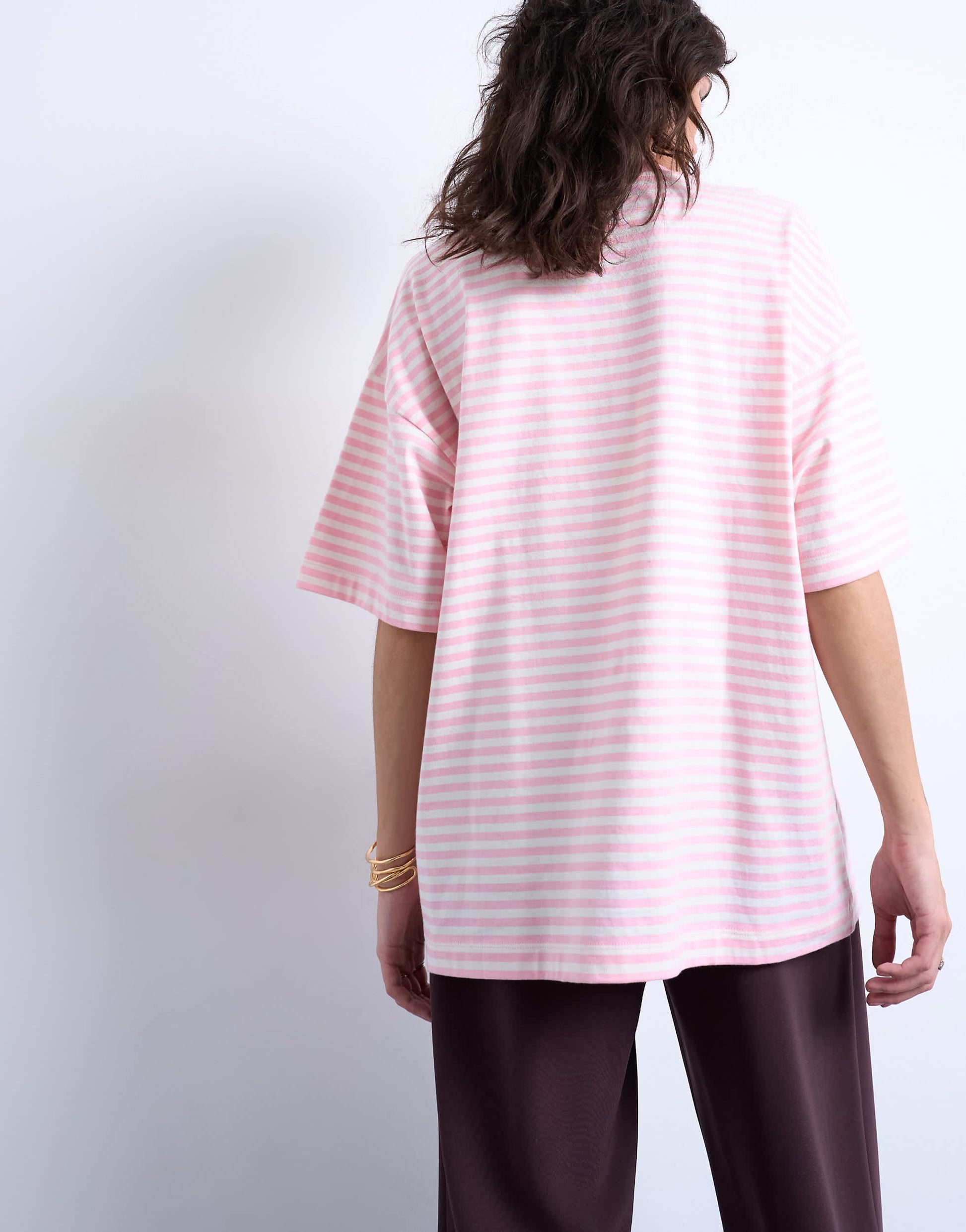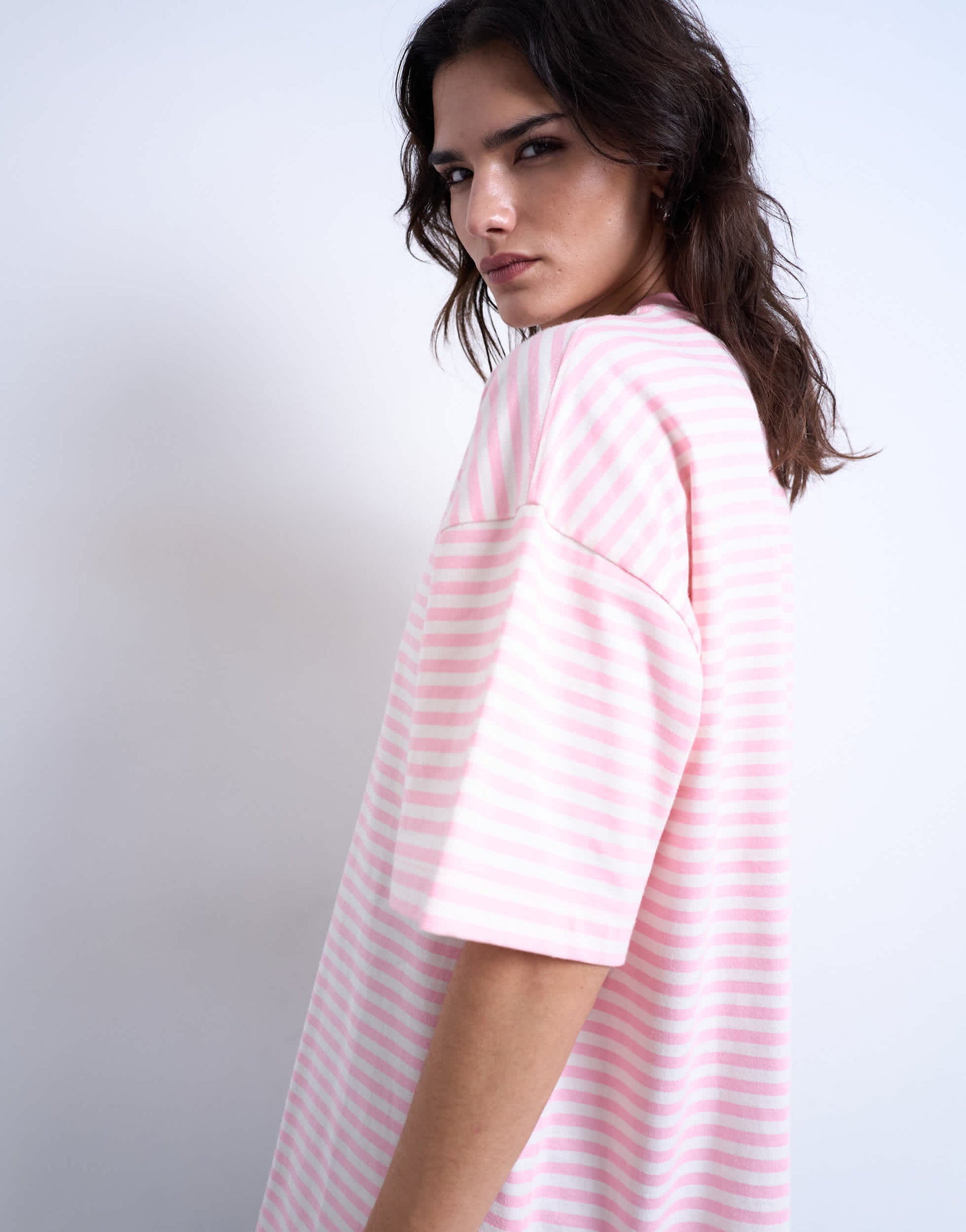Oberteile von TopshopDieses T-Shirt hat einen Streifenprint in Weiß und Hellrosa. Es ist aus weichem, dehnbarem Jersey gefertigt und hat einen Rundhalsausschnitt, kurze Ärmel, überschnittene Schultern und eine Oversized-Passform.