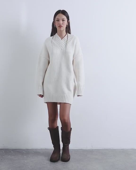 Confectionnée dans une maille ivoire polyvalente, cette robe présente un col en V, des manches longues et des finitions en grosse côte. Sa coupe ample s'arrête à mi-cuisse.