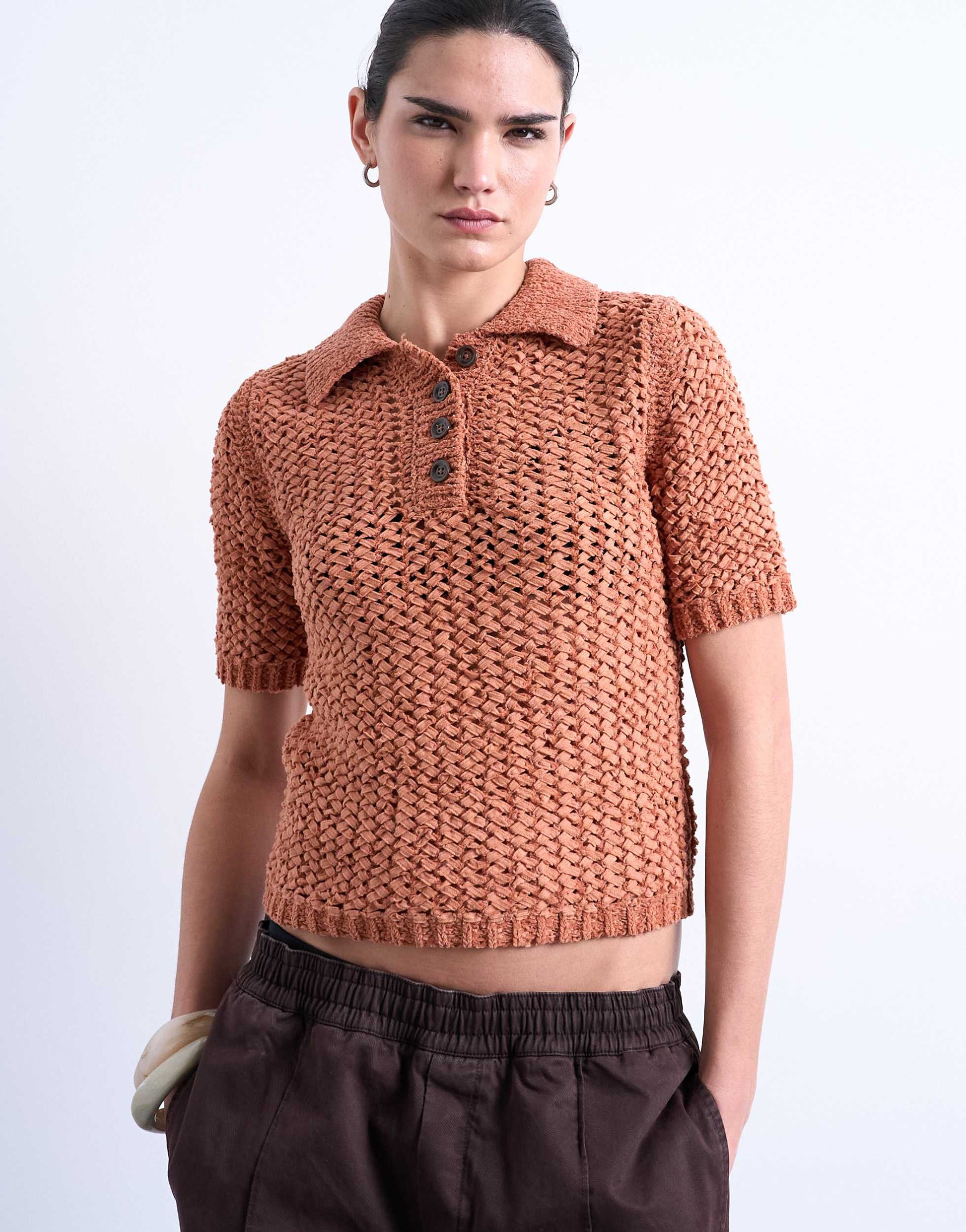 Ce polo est confectionné dans une maille épaisse et douce de couleur rouille. Il présente un col polo, une patte de boutonnage partielle et des manches courtes, pour une coupe classique.