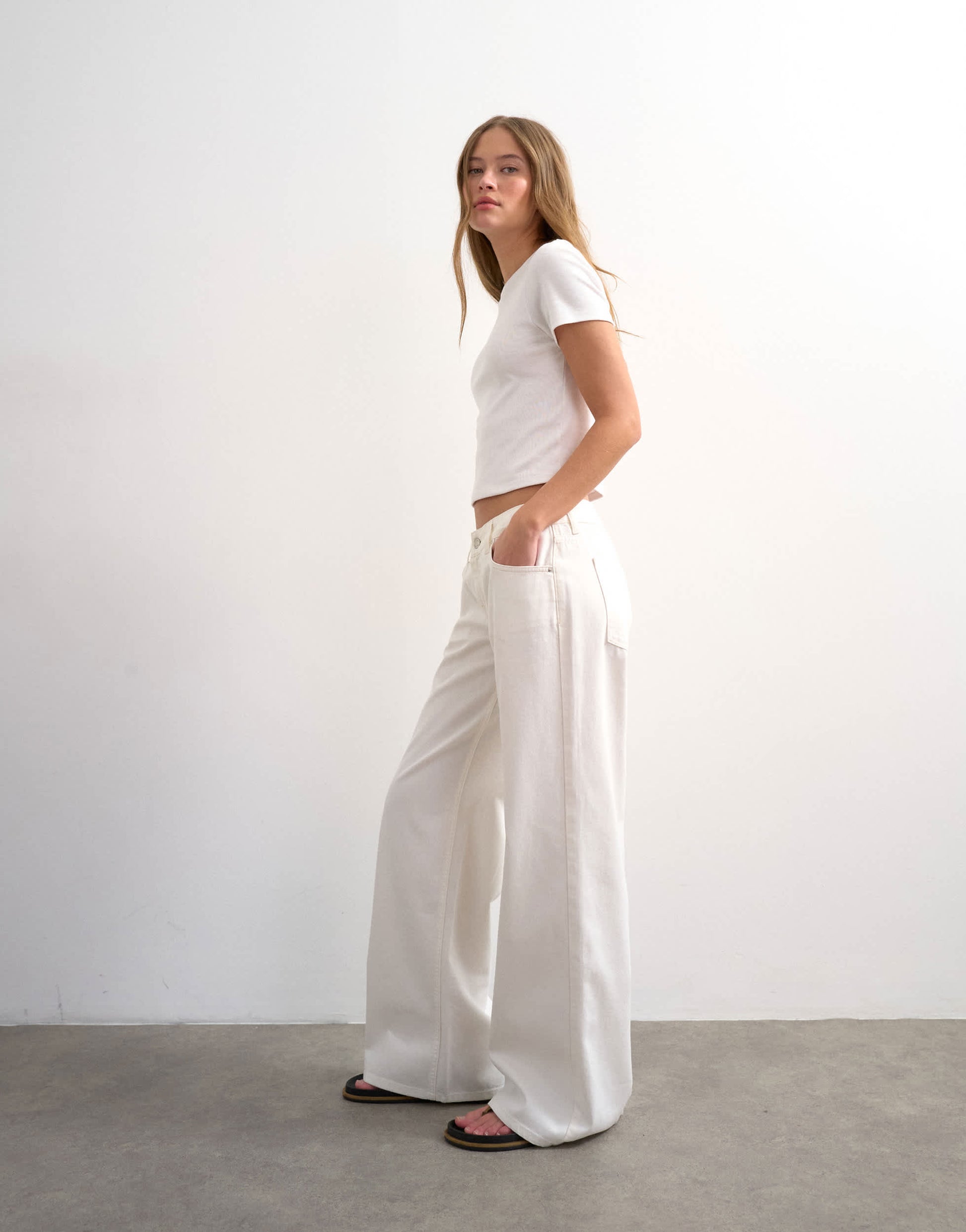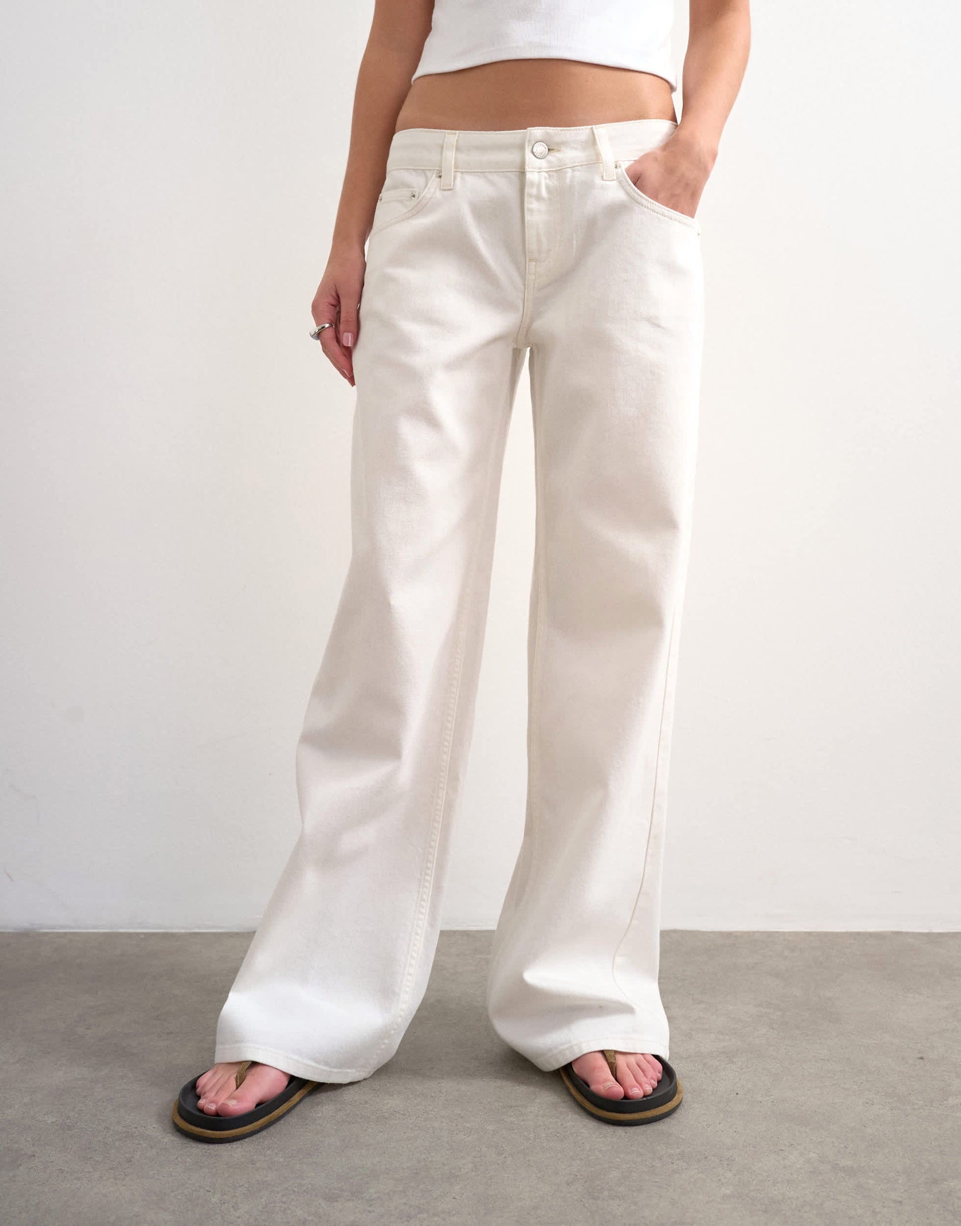 Jeans de TopshopCe jean présente une taille basse et une jambe large arrivant à la cheville. Doté de passants de ceinture, d'une braguette zippée et de cinq poches fonctionnelles, ce modèle est confectionné en denim léger délavé couleur os.
