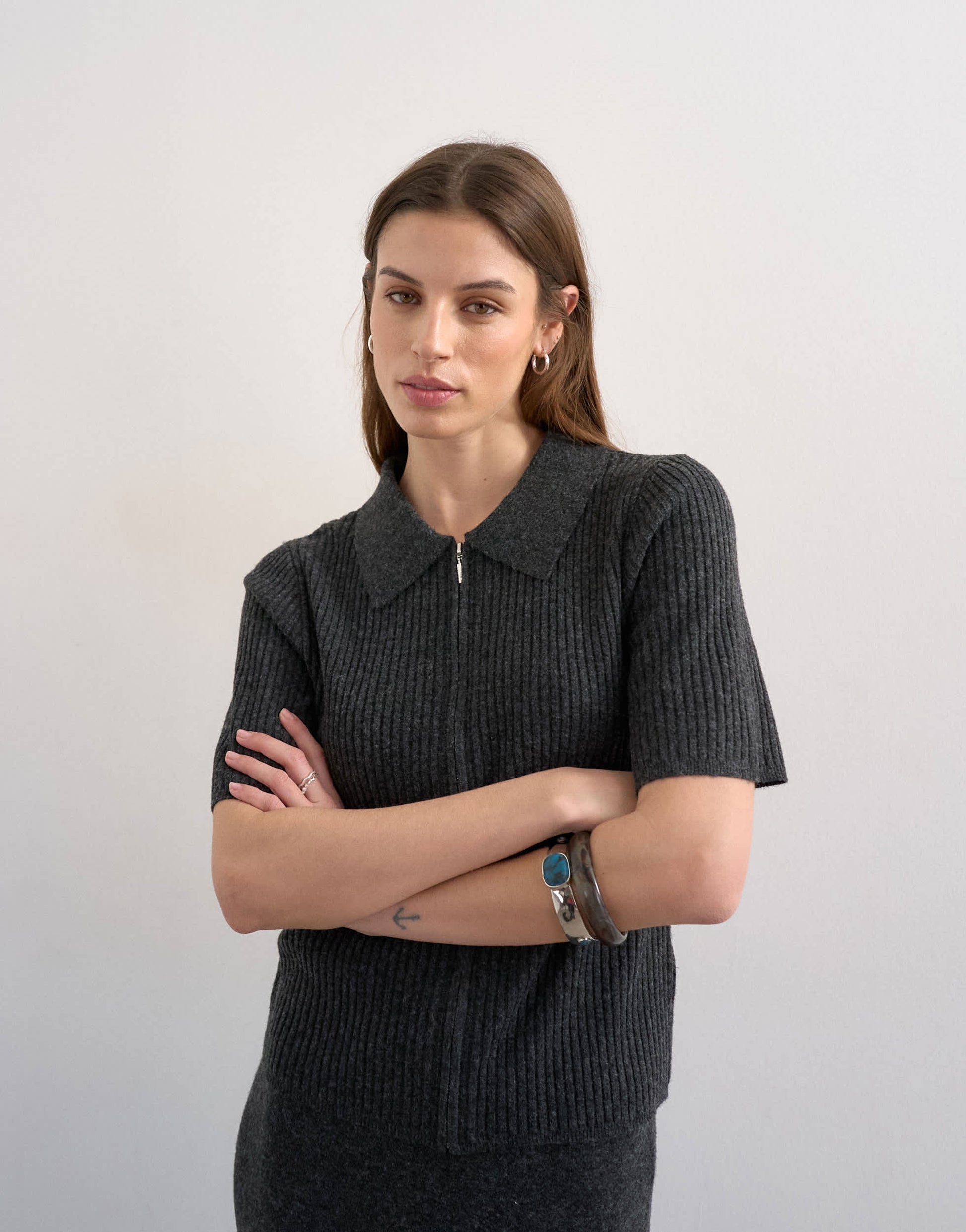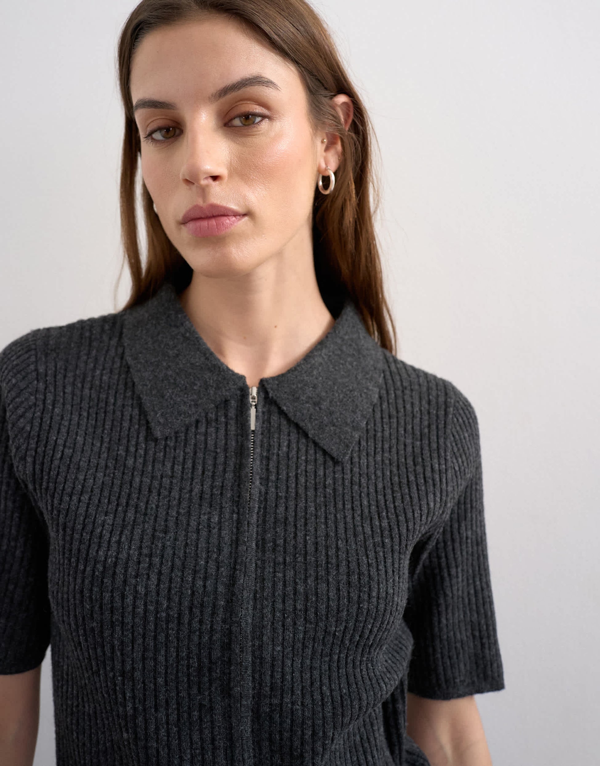 Hauts de TopshopCe polo en maille est confectionné dans un tricot côtelé gris anthracite. Il présente un col polo, une fermeture éclair partielle et des manches courtes, pour une coupe classique.