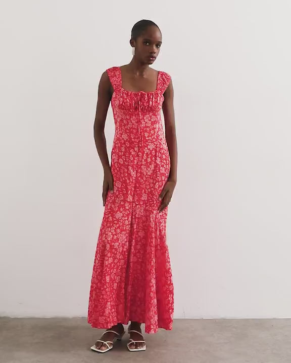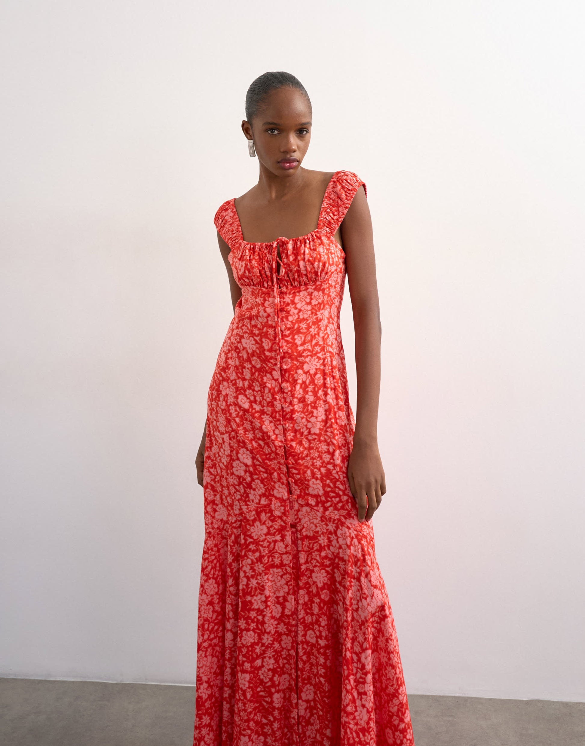 Robes de TopshopCette robe est confectionnée dans un tissu tissé à imprimé floral discret. Elle présente une encolure carrée et des bretelles fixes agrémentées d'un nœud sur le devant. Dotée d'une patte de boutonnage et d'un ourlet à volants, sa coupe classique en fait une pièce polyvalente, idéale pour une occasion décontractée ou habillée.