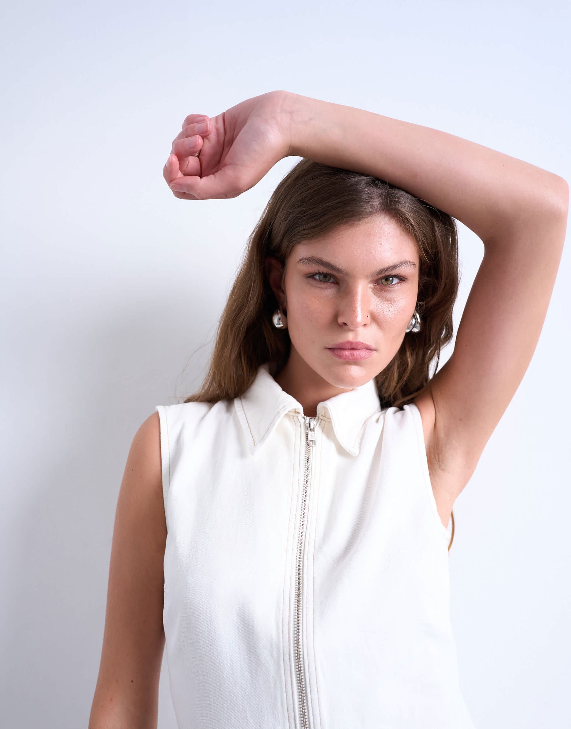 Robe mini en jean blanc Topshop, fermeture éclair au col et sans manches