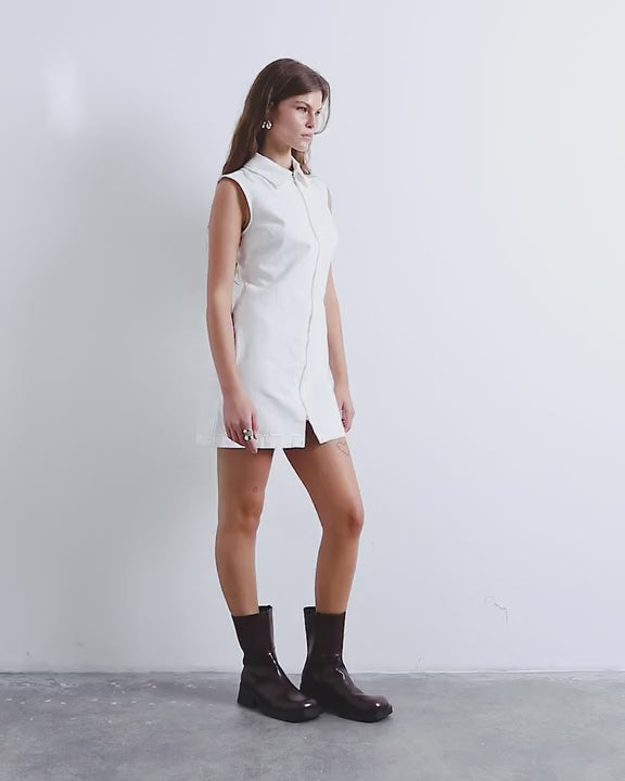 Cette robe est confectionnée en denim blanc résistant. Sans manches, elle présente un col classique et une fermeture éclair sur le devant, lui conférant un style pratique et fonctionnel.