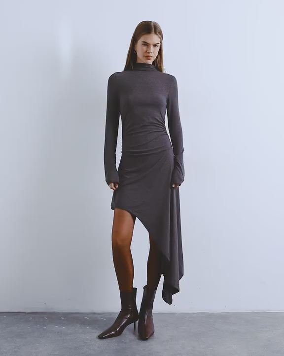 Cette robe est confectionnée en jersey doux et extensible. Elle présente une coupe simple, un col montant, des manches longues et un ourlet asymétrique.