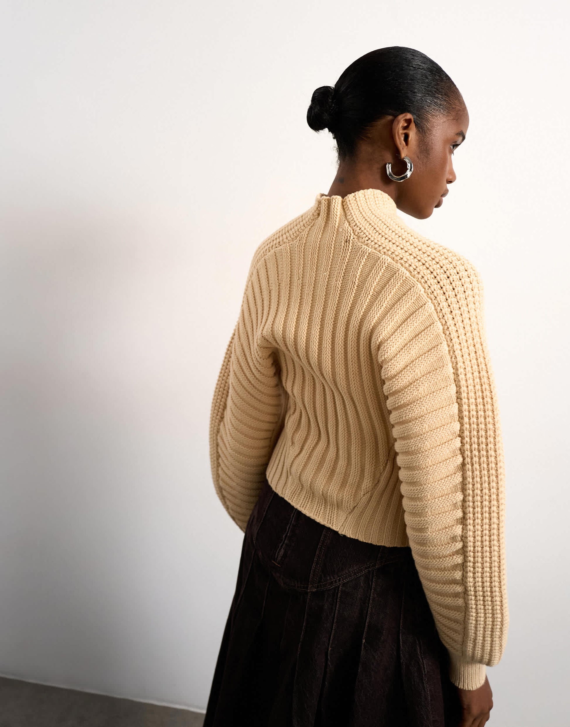 Ce pull est confectionné en grosse maille côtelée. De couleur beige, il présente un col montant, des manches ovales et des poignets ajustés, pour une coupe classique.