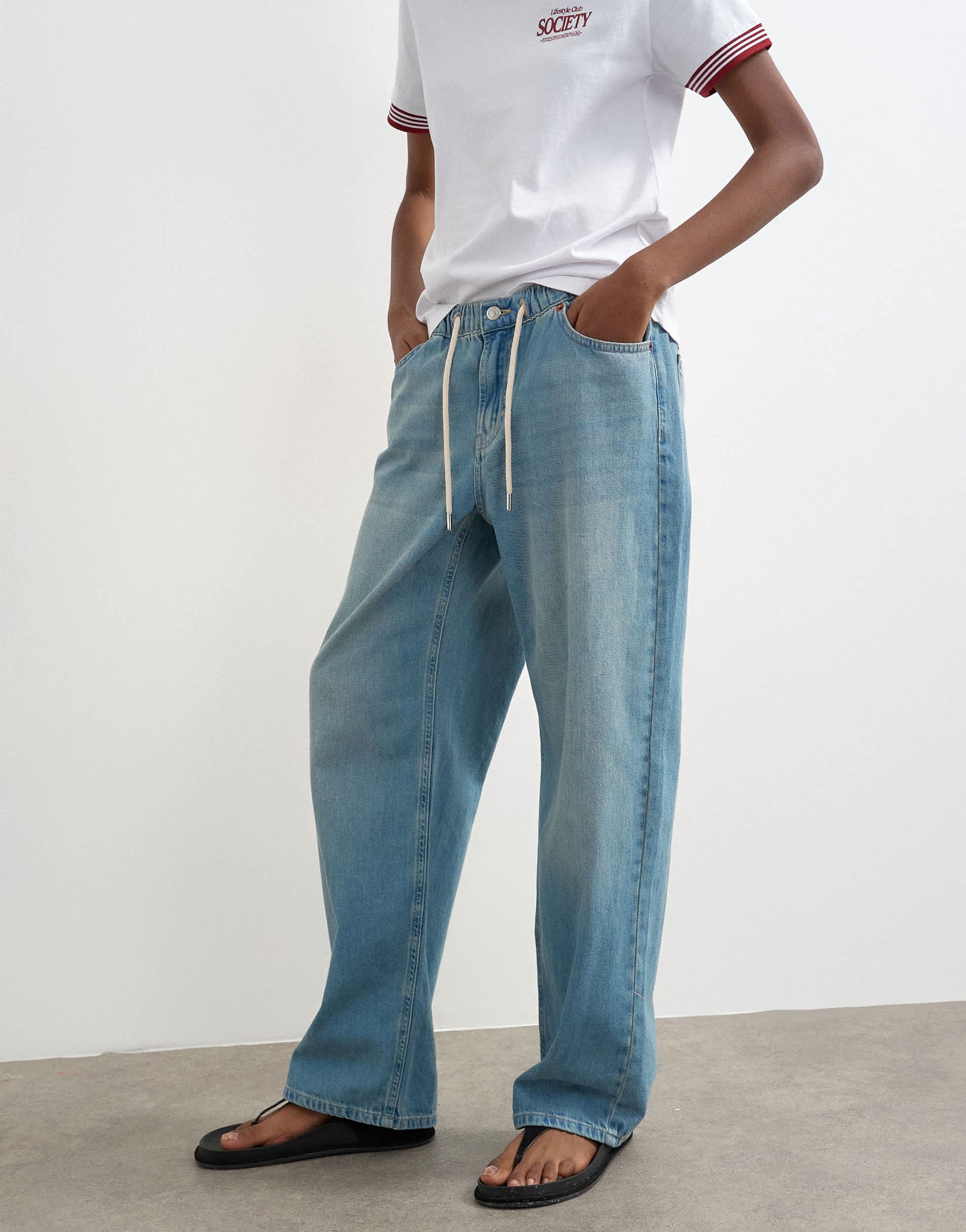 Jeans de TopshopCe jean possède une taille mi-haute élastiquée avec cordon de serrage. Il est doté de poches fonctionnelles sur une jambe ample et est confectionné en denim non extensible bleu moyen.