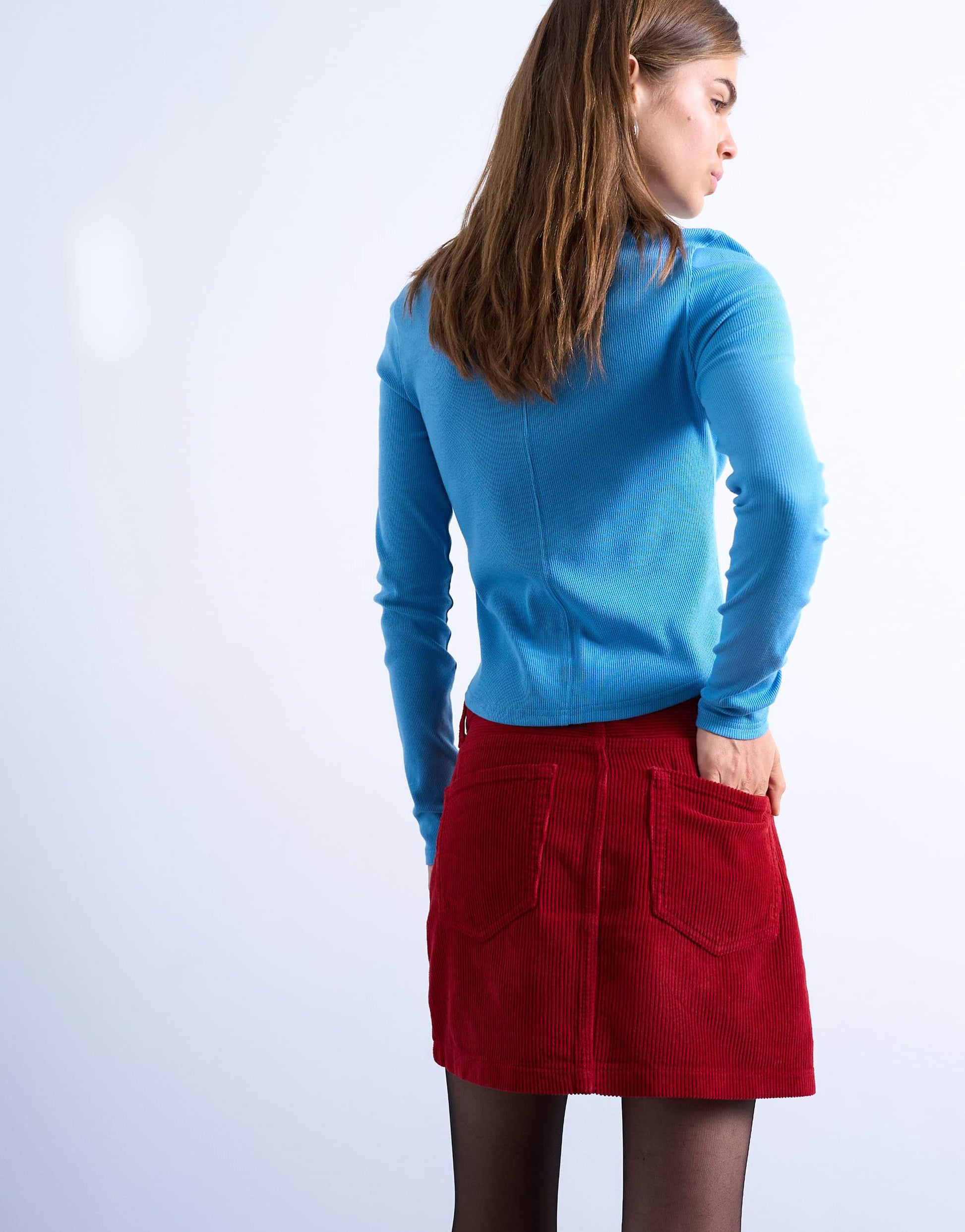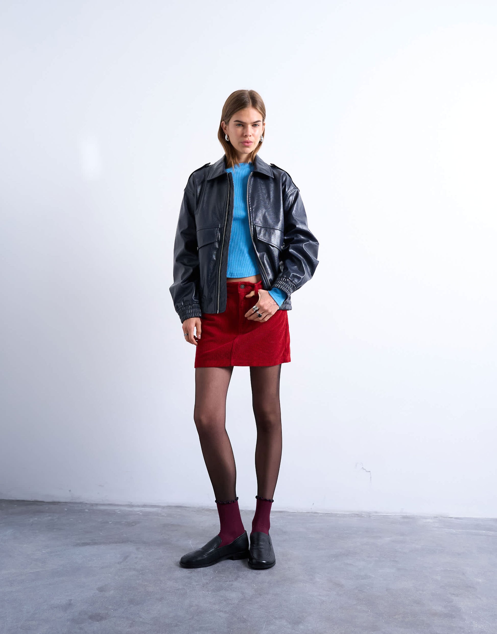 Jupes de chez TopshopCette jupe est confectionnée en velours côtelé rouge vif. Elle est dotée de passants de ceinture, de quatre poches et d'une coupe mini.