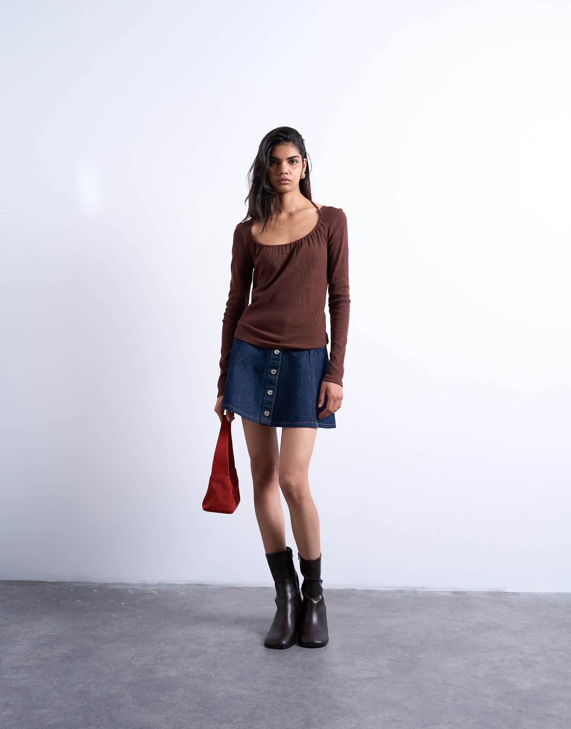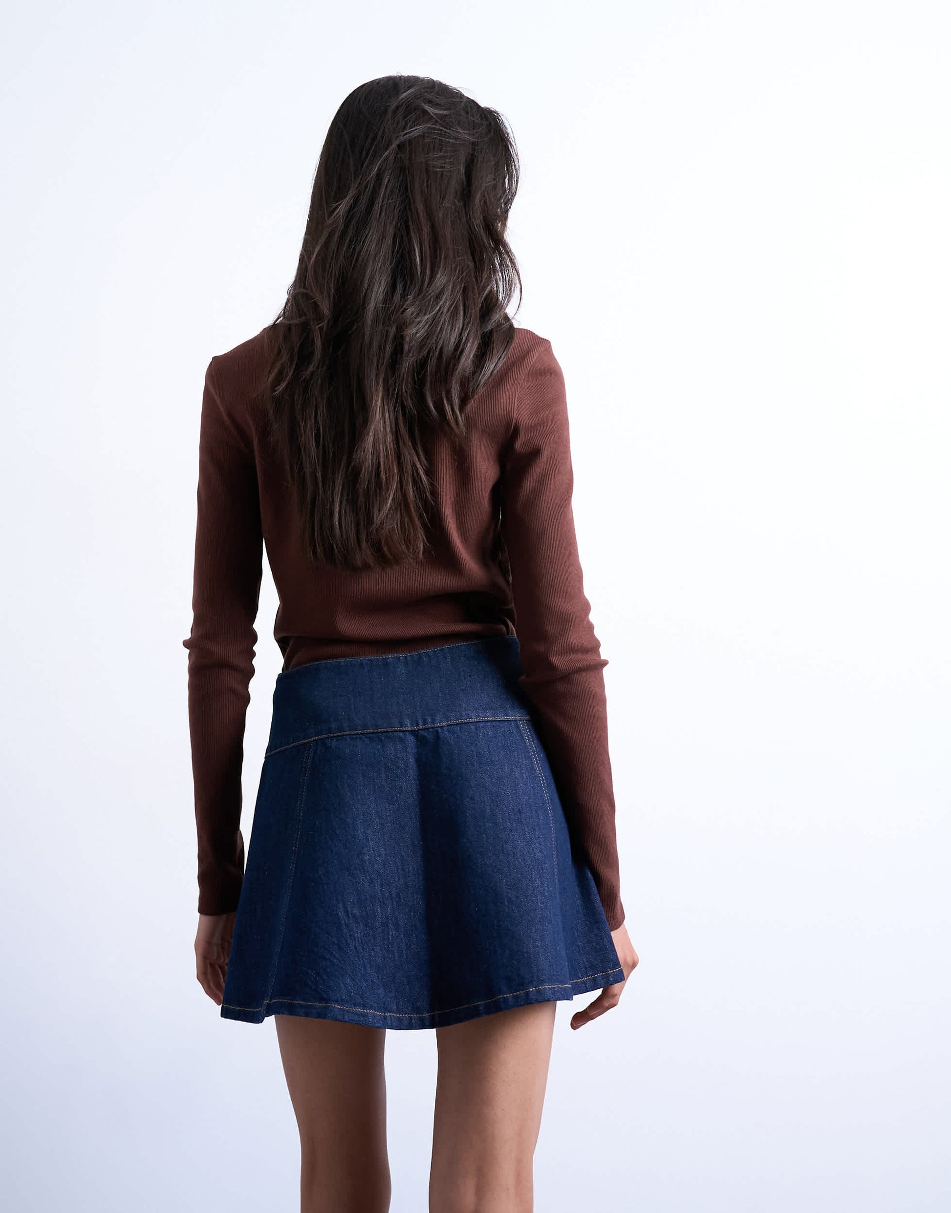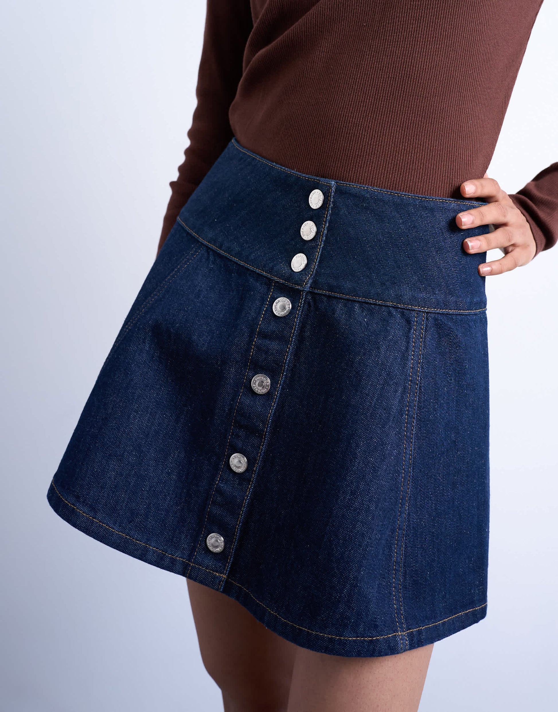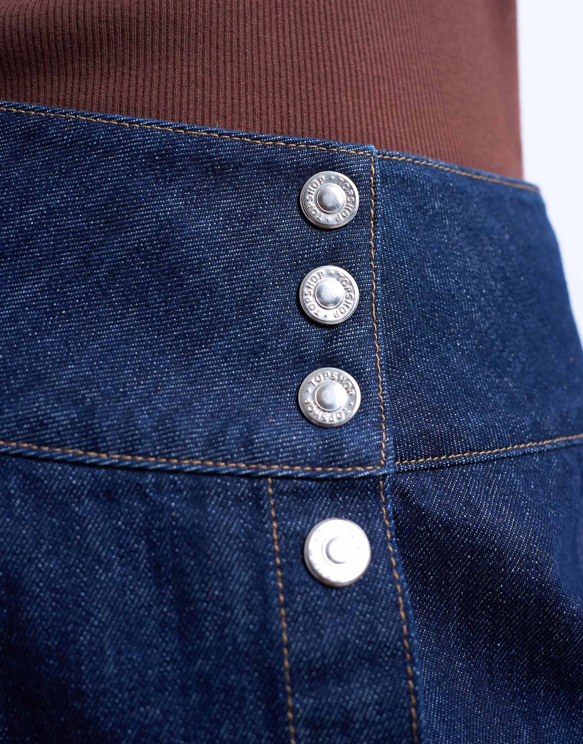 Jupes de chez TopshopCette jupe est confectionnée en denim non extensible bleu foncé. Elle présente une taille haute et une fermeture boutonnée sur le devant. Sa coupe est classique.