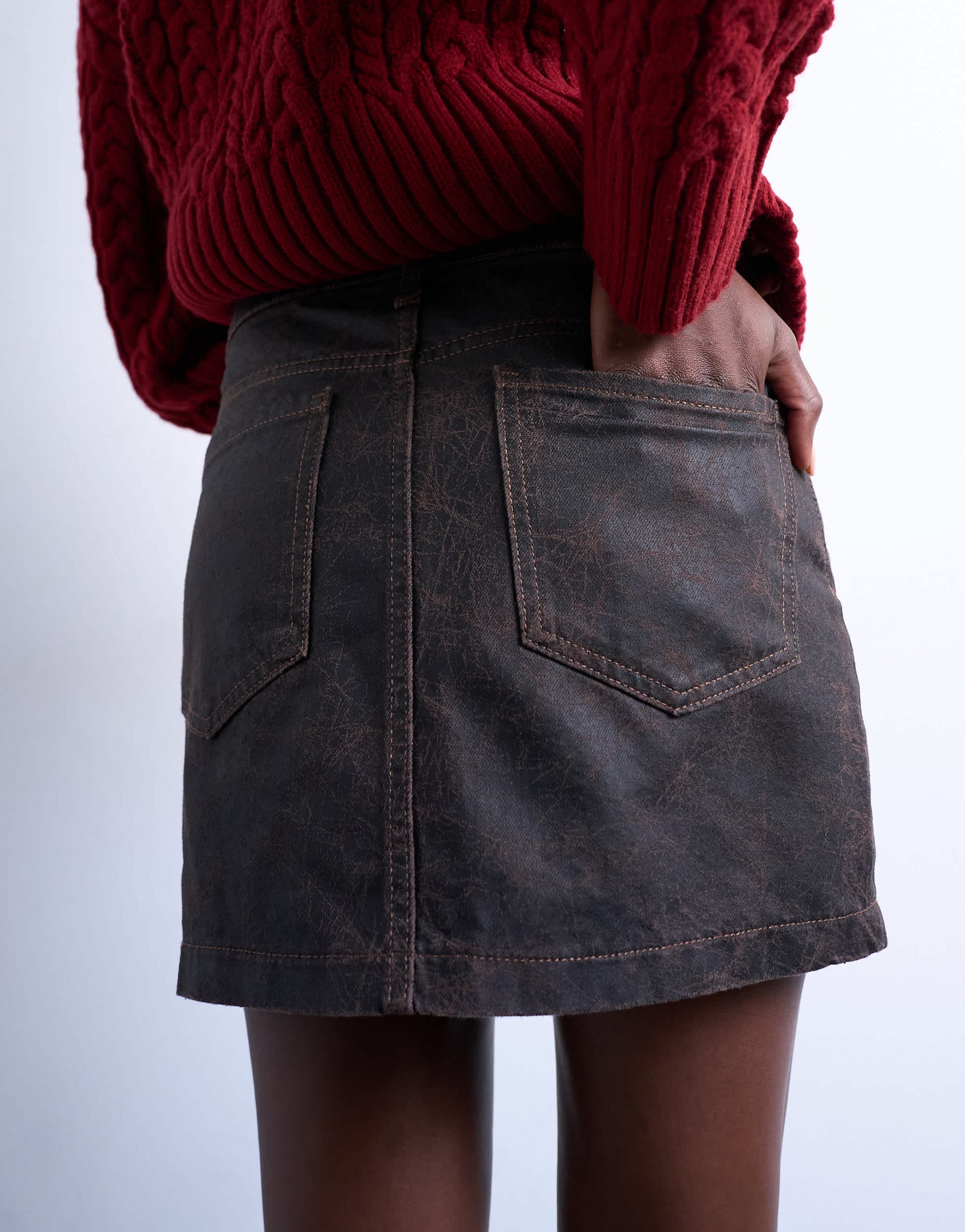 Jupes de chez TopshopCette jupe est confectionnée en denim non extensible, de couleur marron délavé et à l'aspect craquelé. Elle présente une taille haute, des passants de ceinture, cinq poches et une coupe classique.