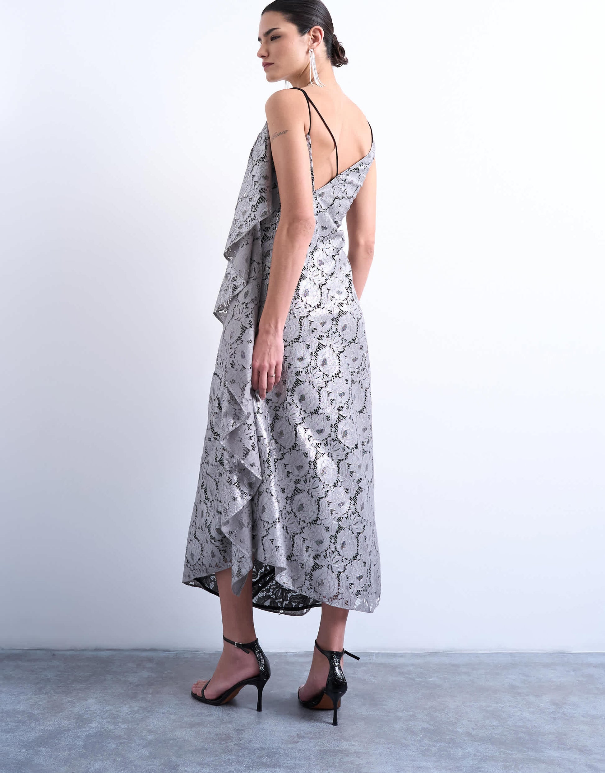 Robes de TopshopCette robe est confectionnée en dentelle florale rehaussée de détails argentés métallisés. Elle présente une encolure carrée, un drapé élégant et des bretelles asymétriques dans le dos. Sa coupe est classique.