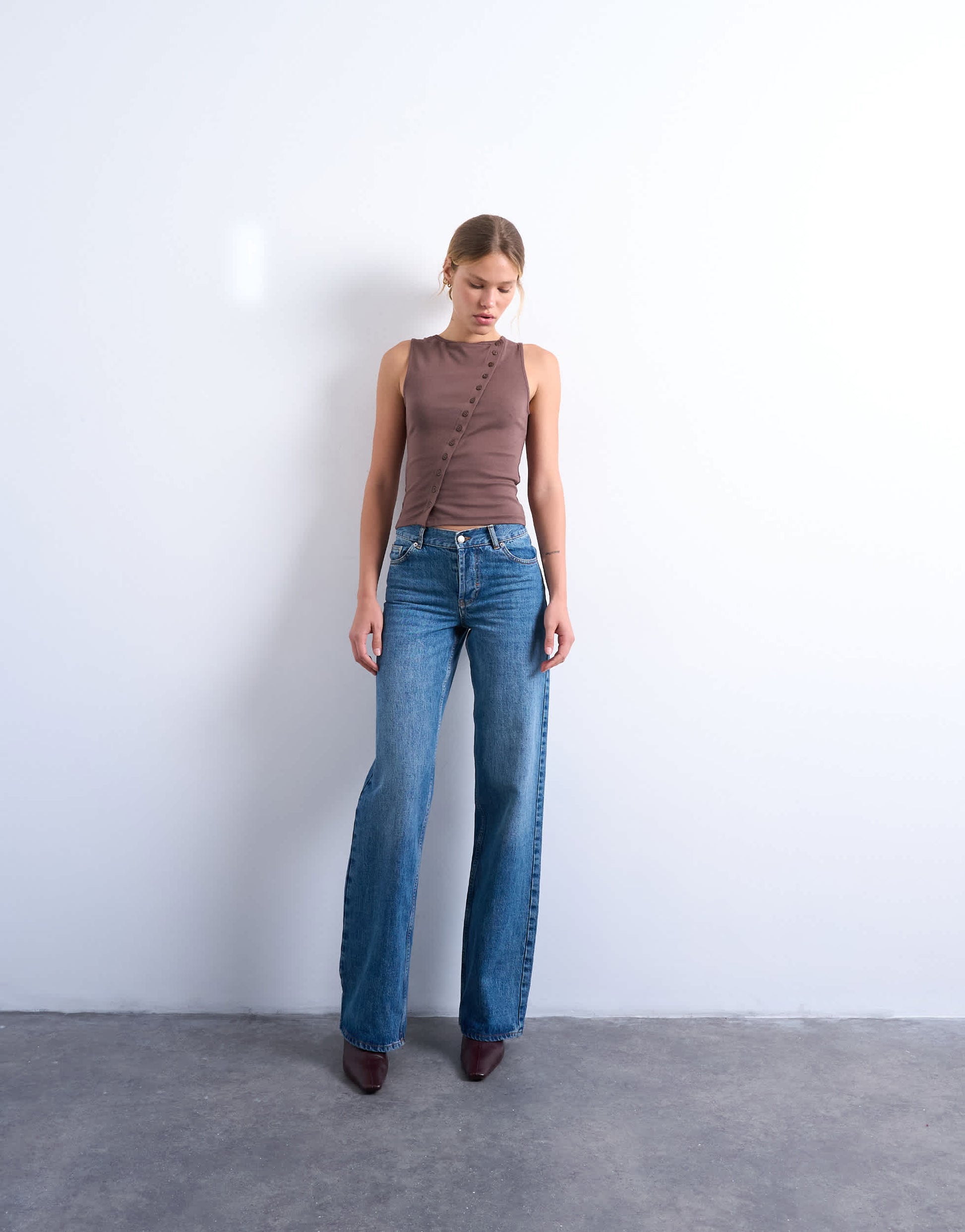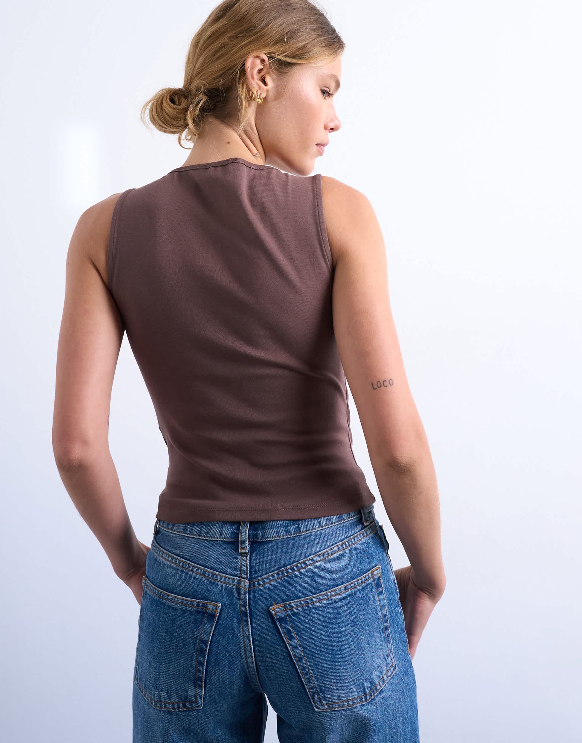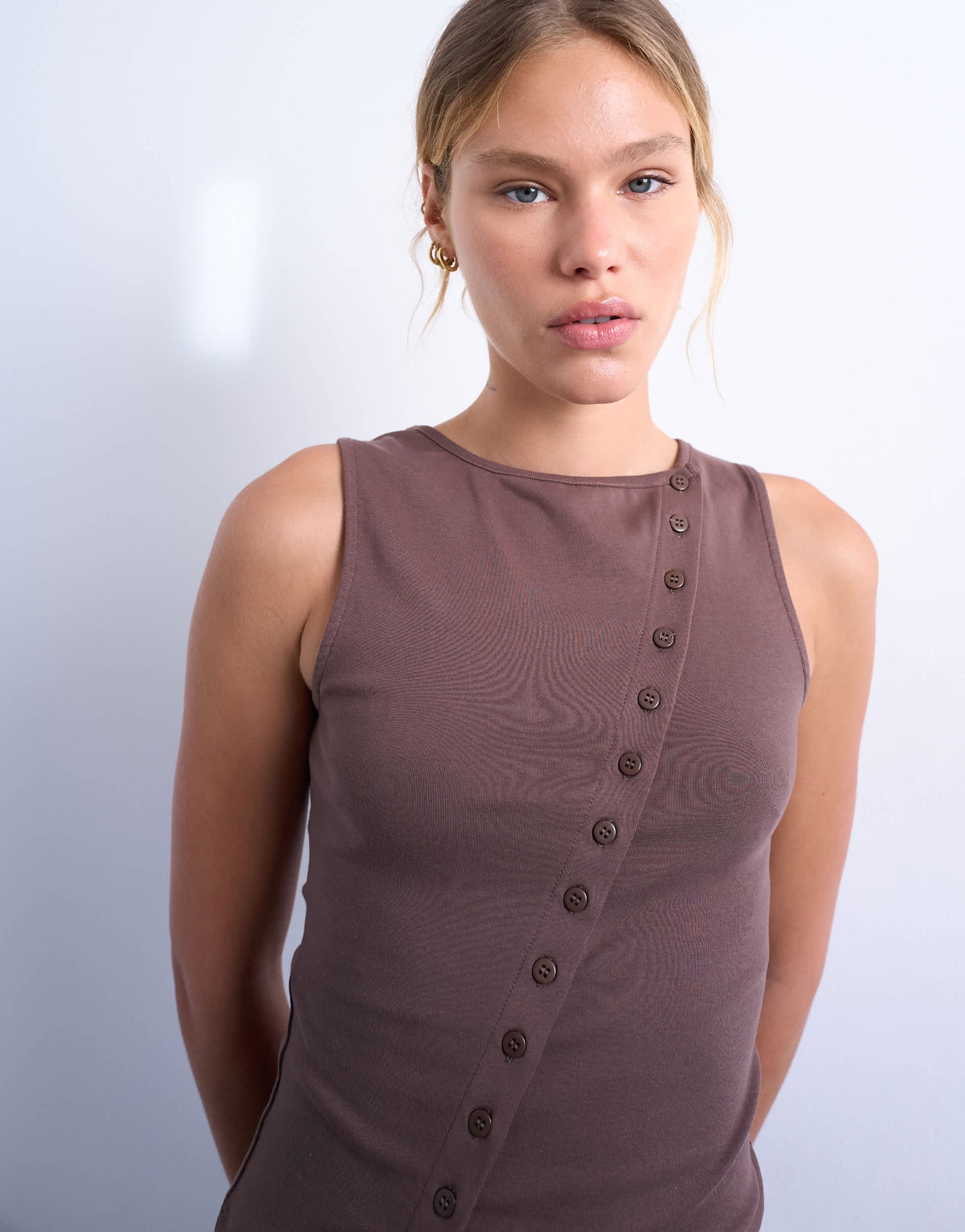 Hauts de TopshopCe top est confectionné en jersey doux et extensible et présente un design uni et polyvalent. Ce modèle sans manches possède un col rond, une patte de boutonnage asymétrique et une coupe ajustée.