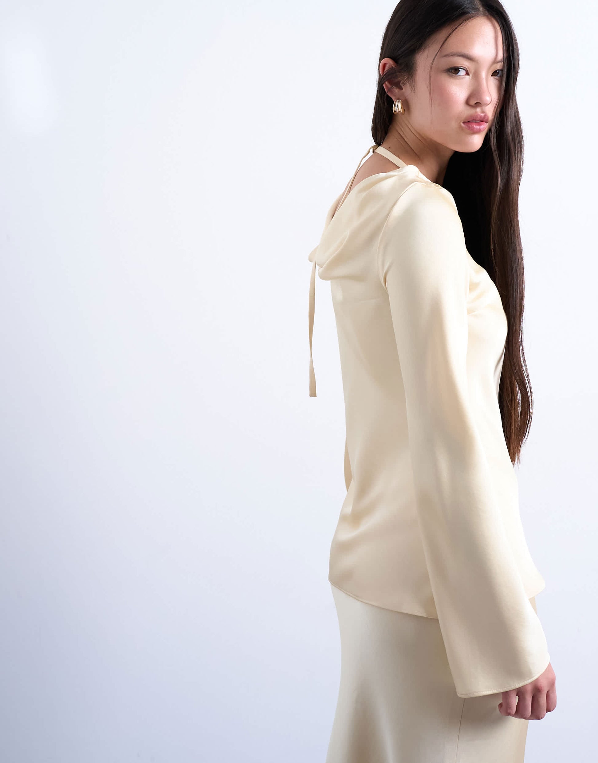 Ce haut est confectionné dans un tissu brillant à l'aspect satiné. Il présente une encolure large, des manches longues, un dos drapé avec une bretelle ajustable et une coupe classique.