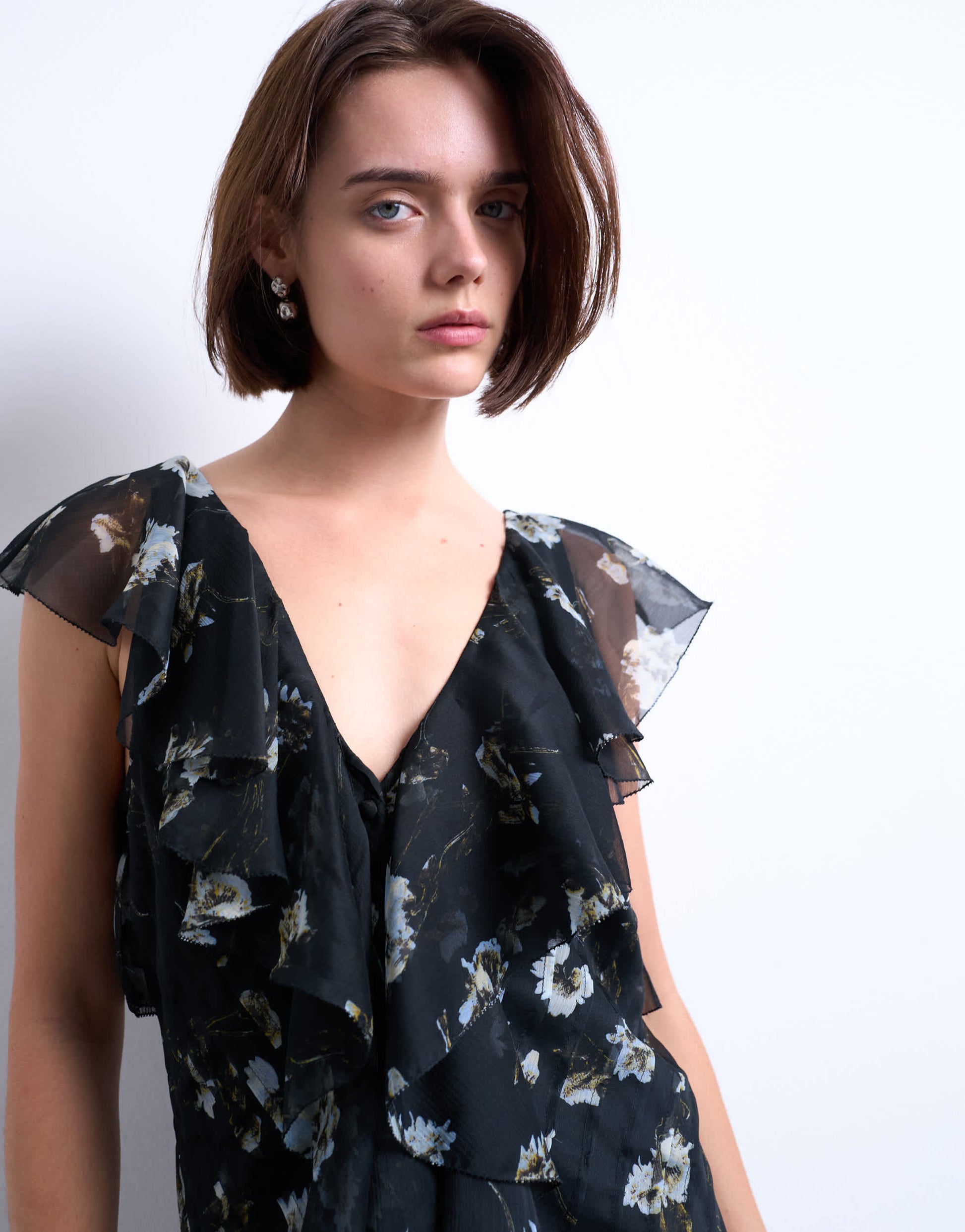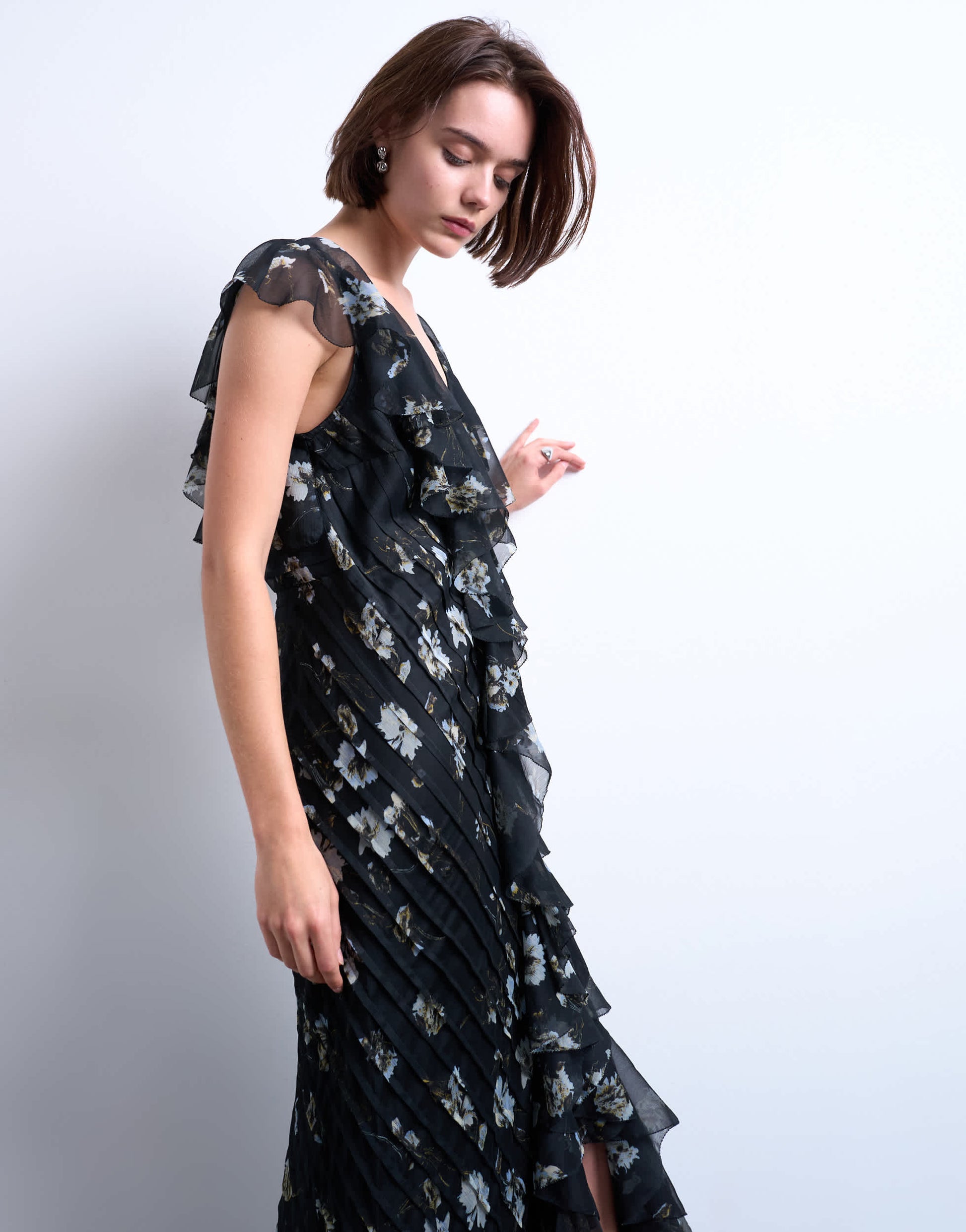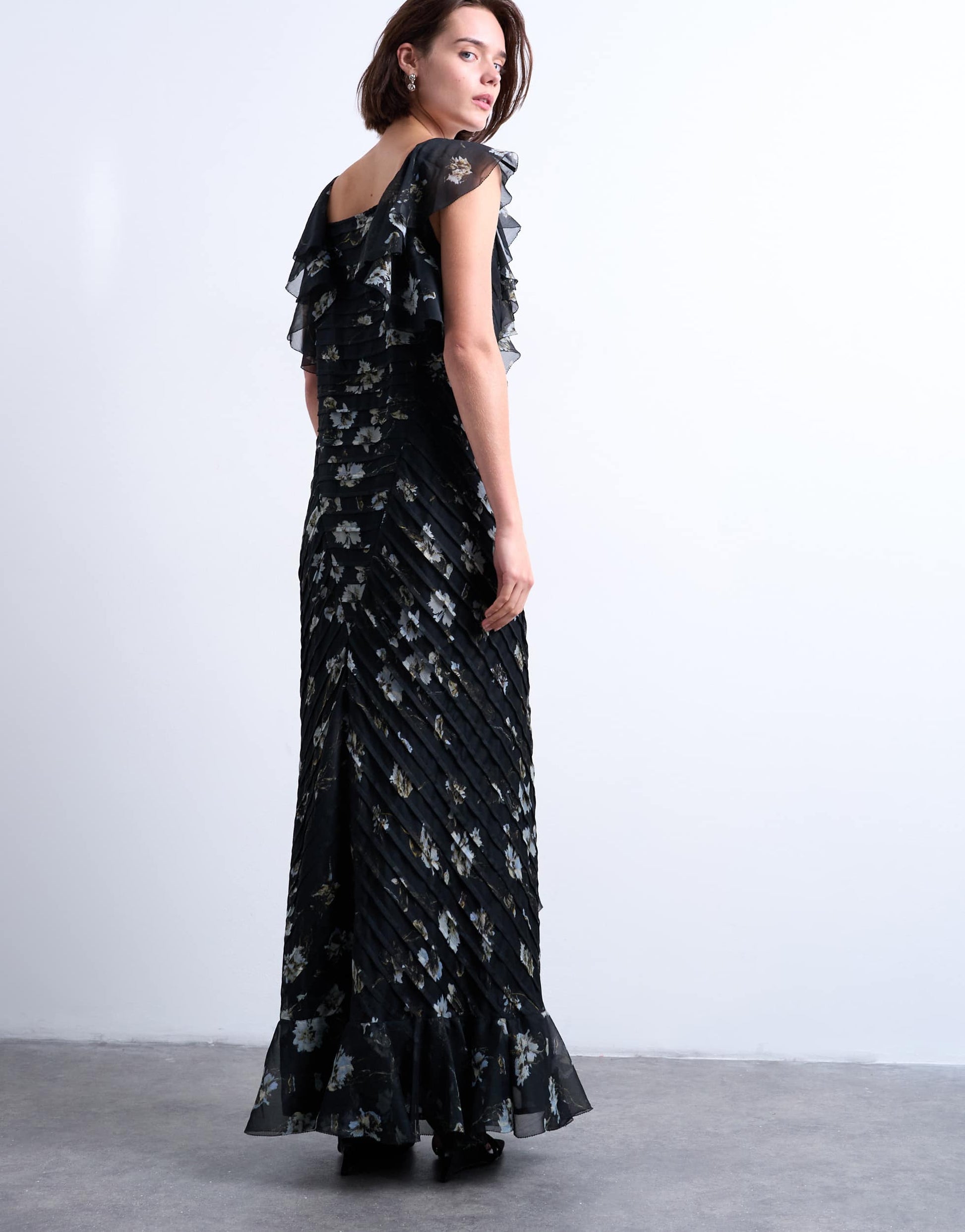 Robes de TopshopCette robe est confectionnée dans un tissu fluide et transparent à imprimé floral. Elle présente un décolleté en V, des manches à volants, une fente sur le devant et une coupe classique.