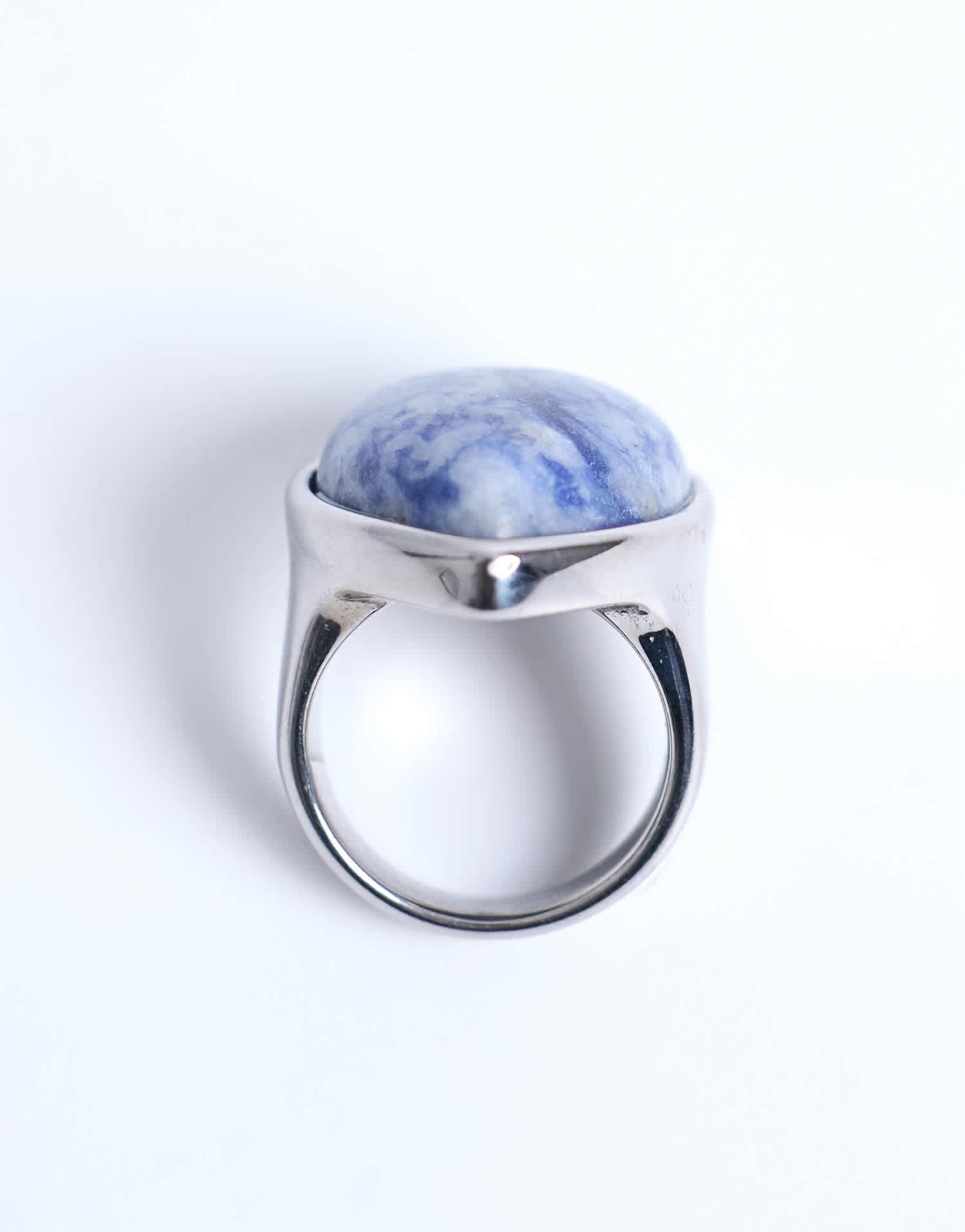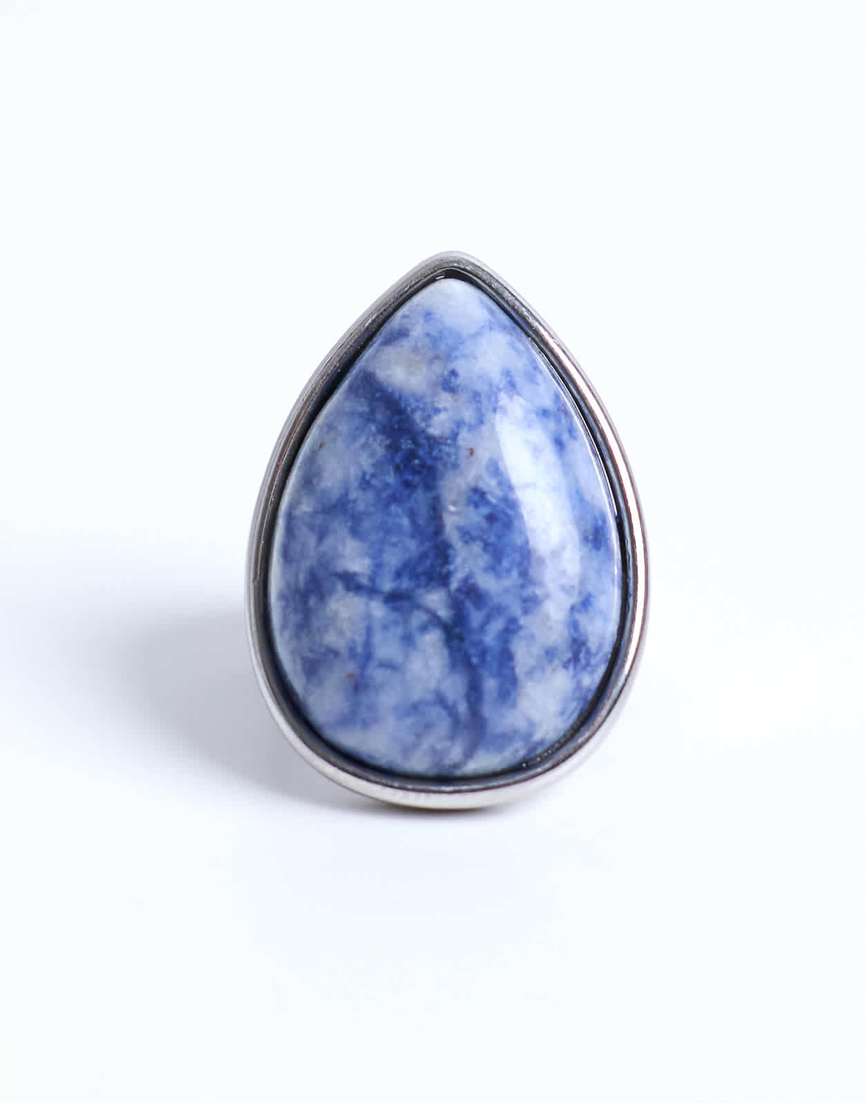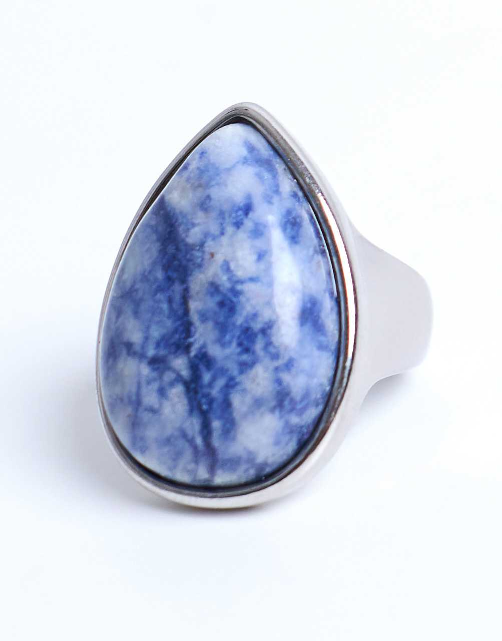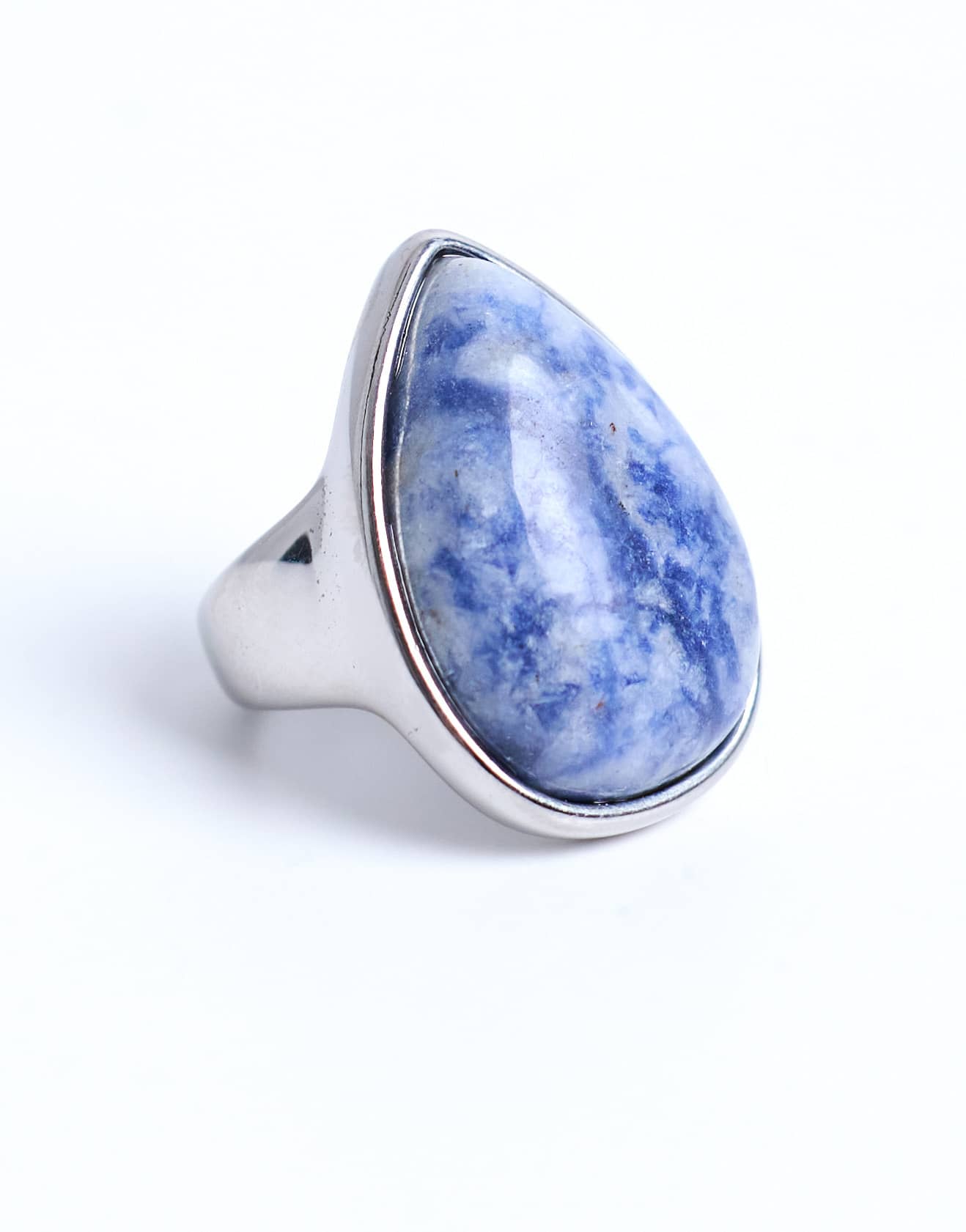 Cette bague est confectionnée dans un métal résistant à la corrosion avec une finition argentée. Elle présente un anneau fuselé et est ornée d'une pierre semi-précieuse.