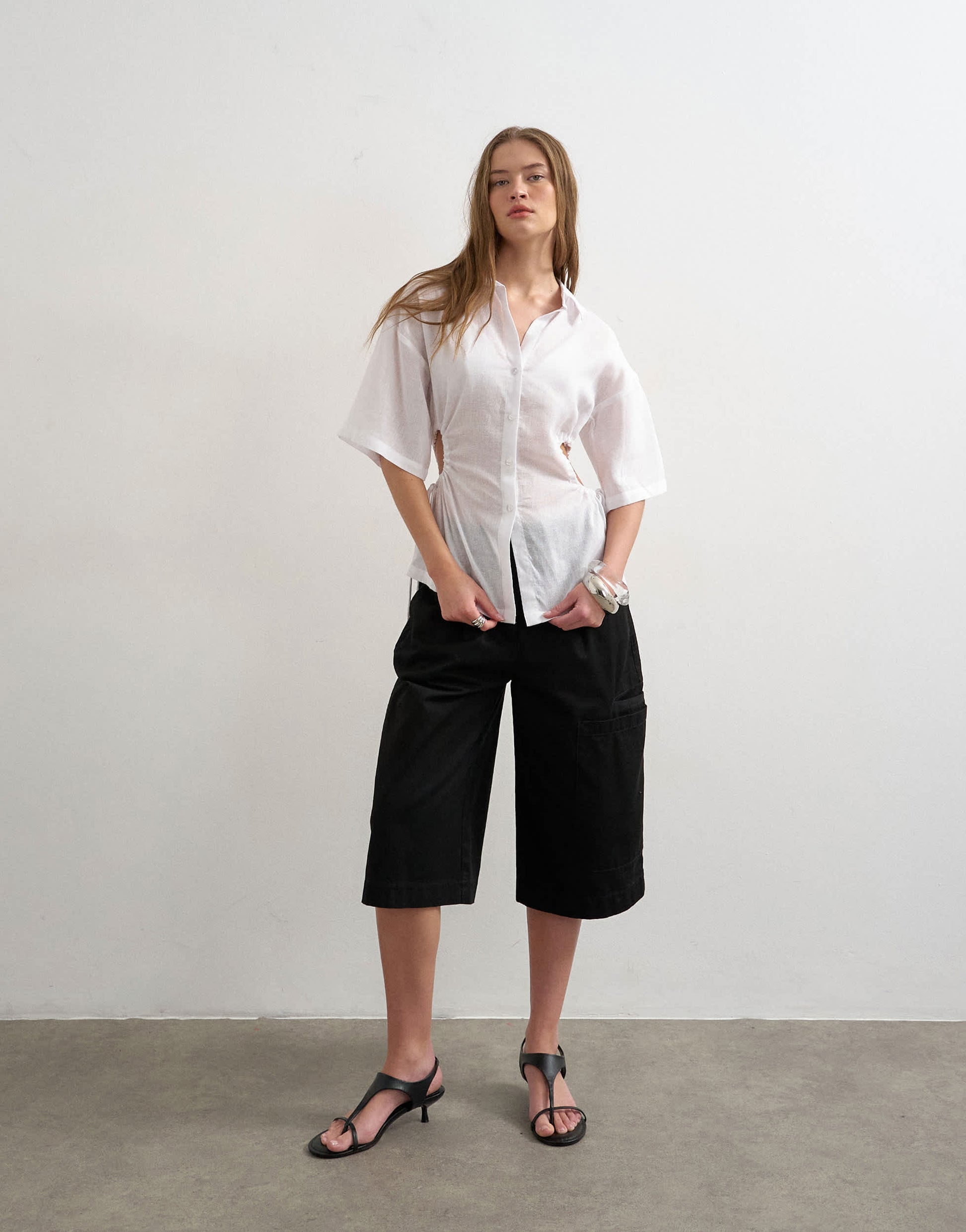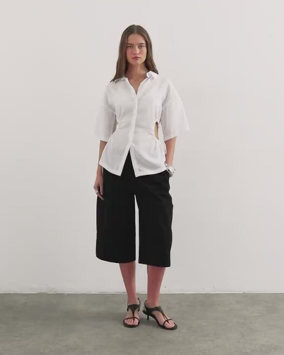Hauts de TopshopCette chemise est confectionnée en tissu blanc. Elle présente un col classique, une patte de boutonnage et des découpes sur les côtés. Agrémentée de fronces, de liens à nouer et de manches courtes, cette chemise à la coupe droite est cintrée à la taille.