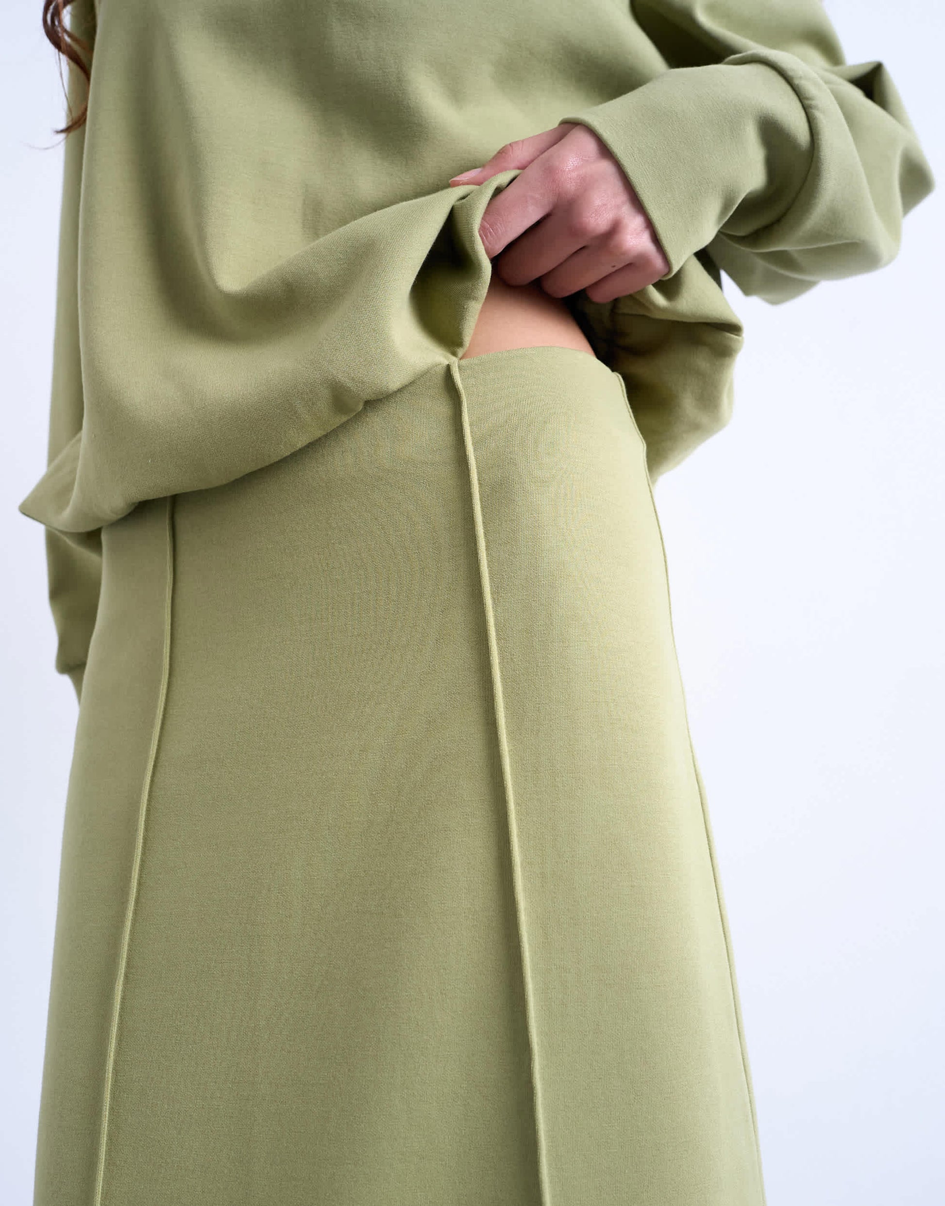 Jupes de chez TopshopCette jupe est confectionnée en jersey épais de couleur verte. Avec sa taille mi-haute, ses coutures apparentes et sa coupe maxi, ce modèle présente une coupe classique.