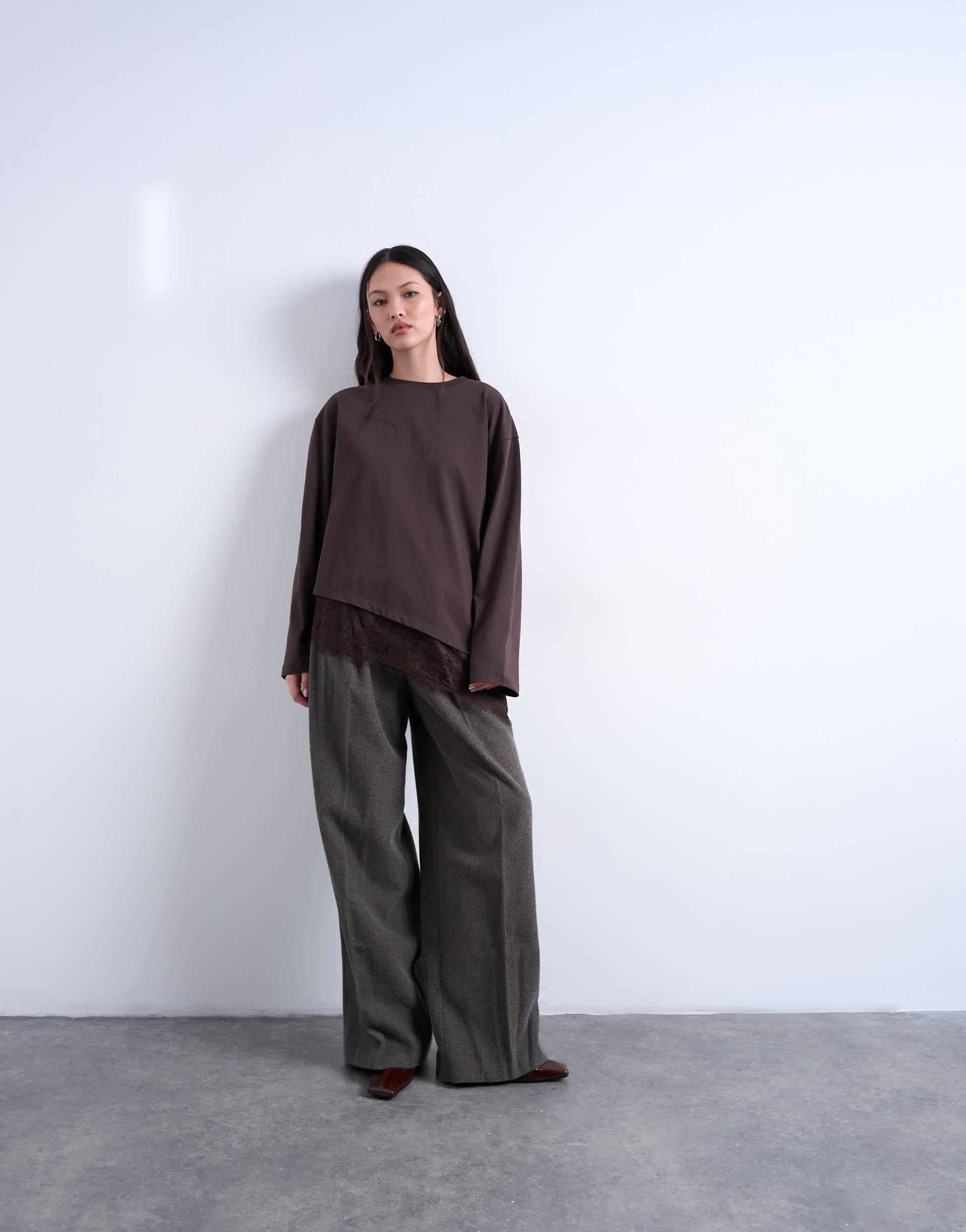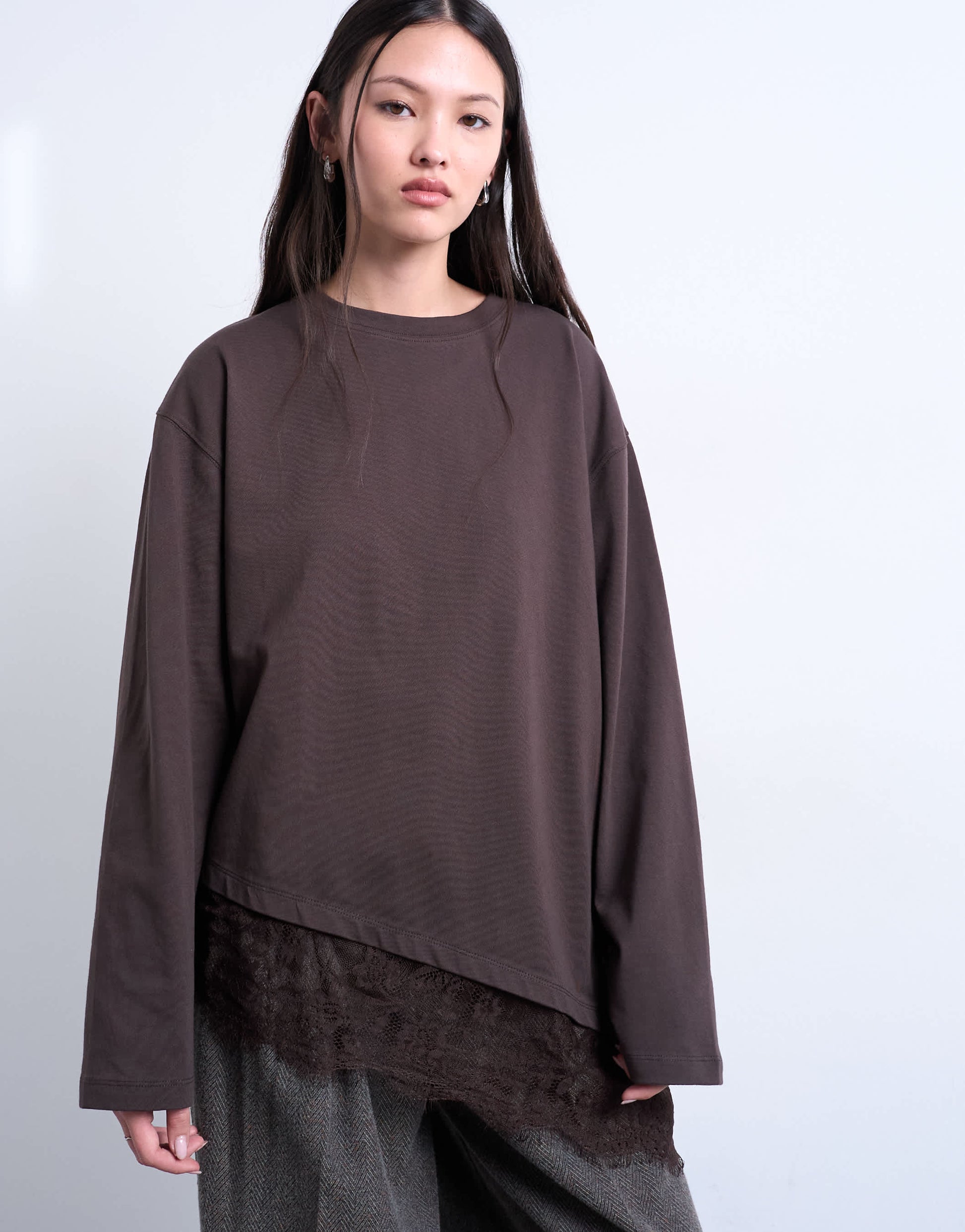Hauts de TopshopCe t-shirt est confectionné en jersey. Il présente un col rond, des manches longues, une bordure en dentelle et une coupe oversize.