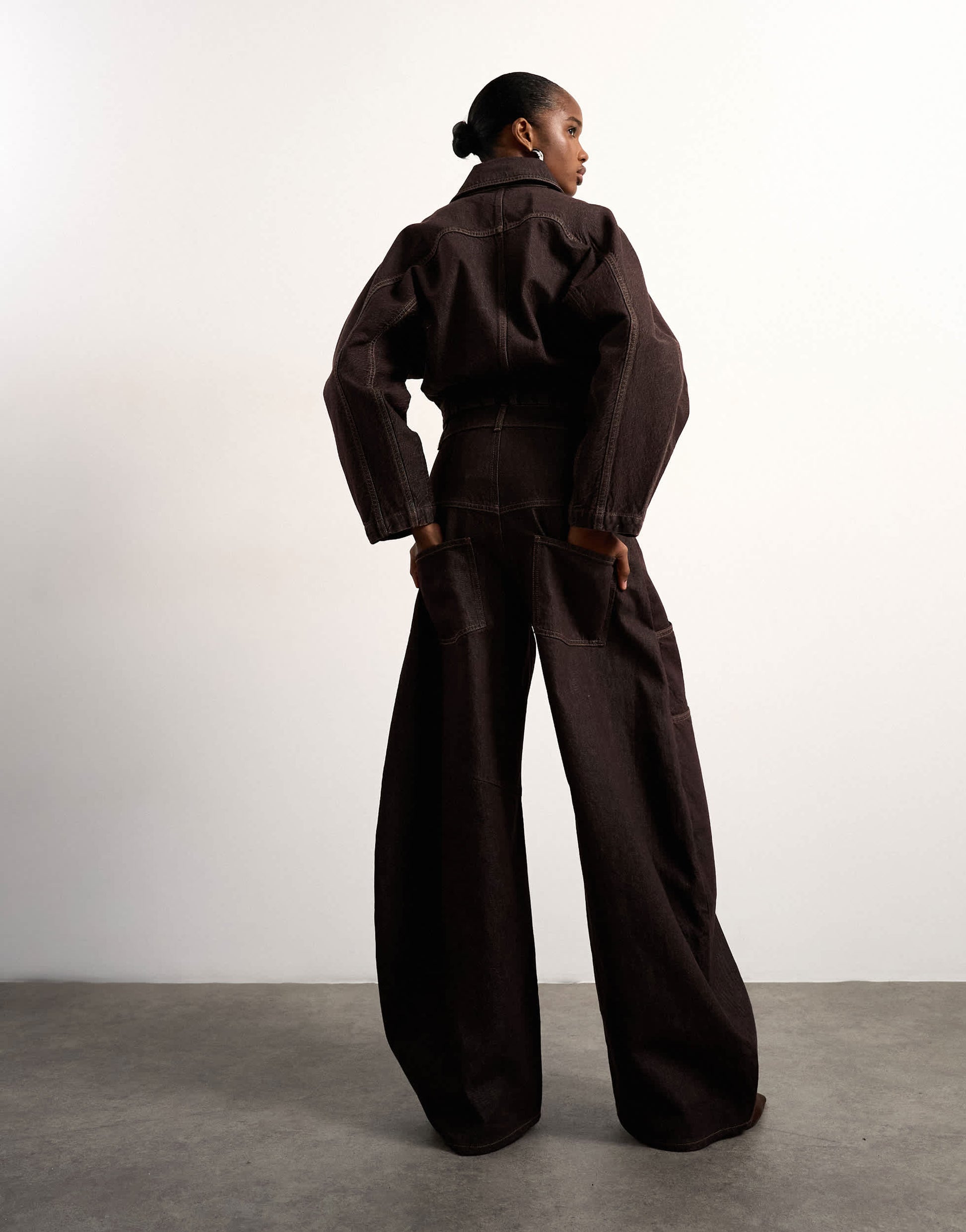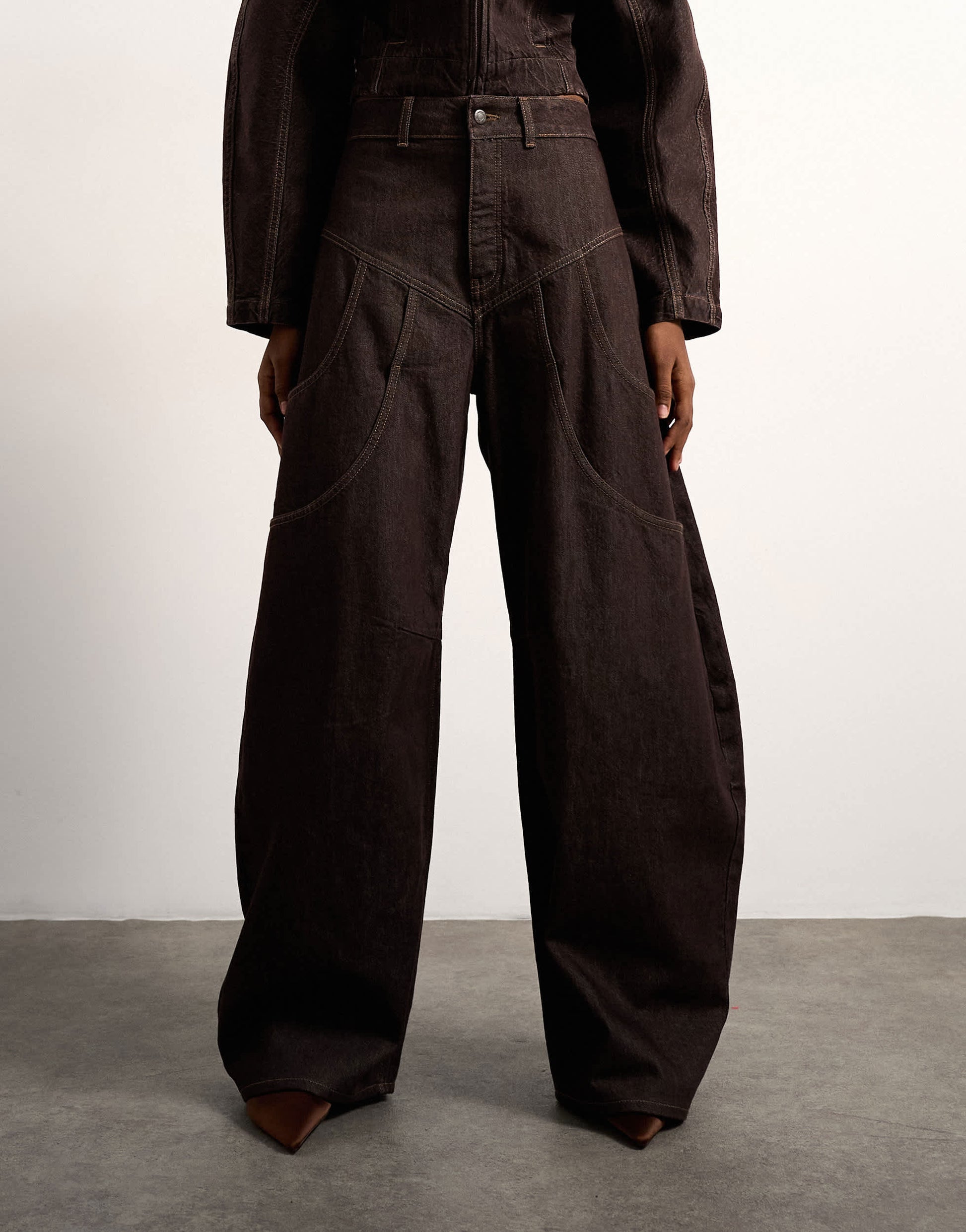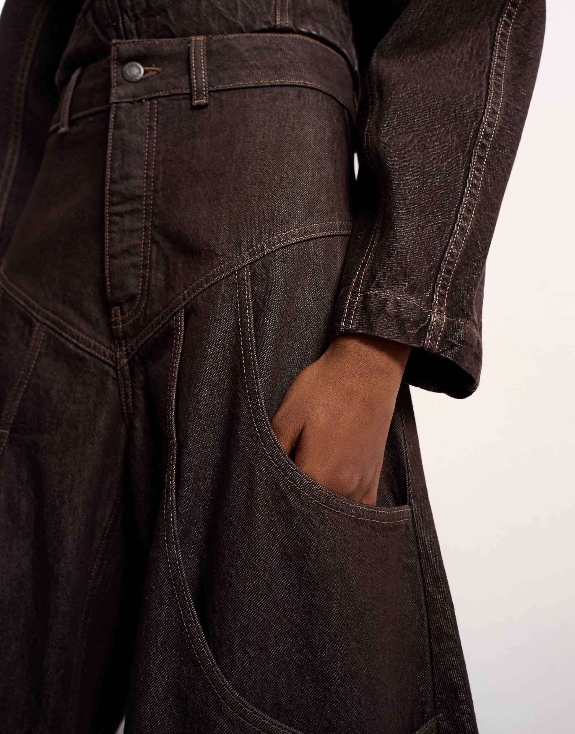 Ce jean est confectionné en denim non extensible de couleur marron. Il est doté de passants de ceinture, de poches fonctionnelles et d'une coupe fuselée.