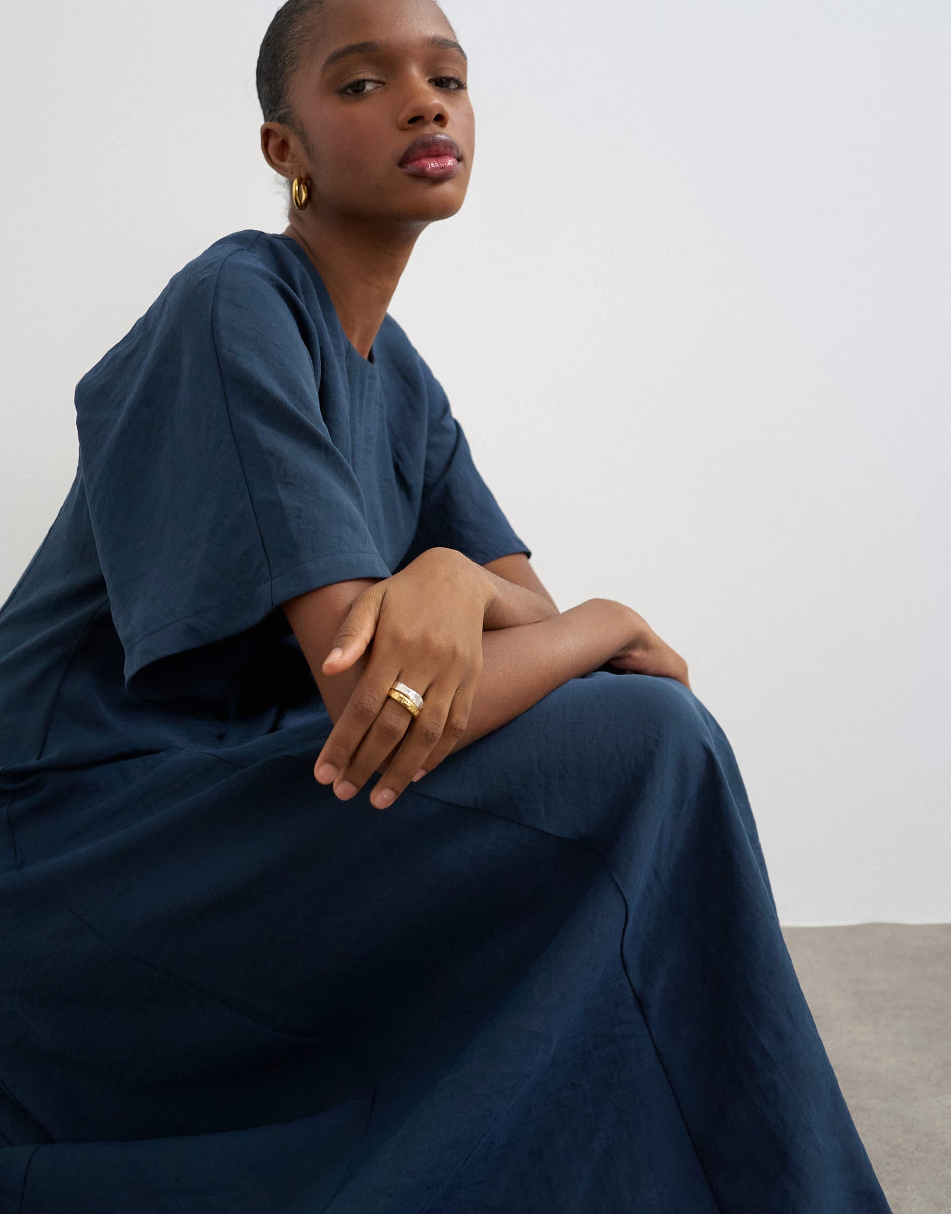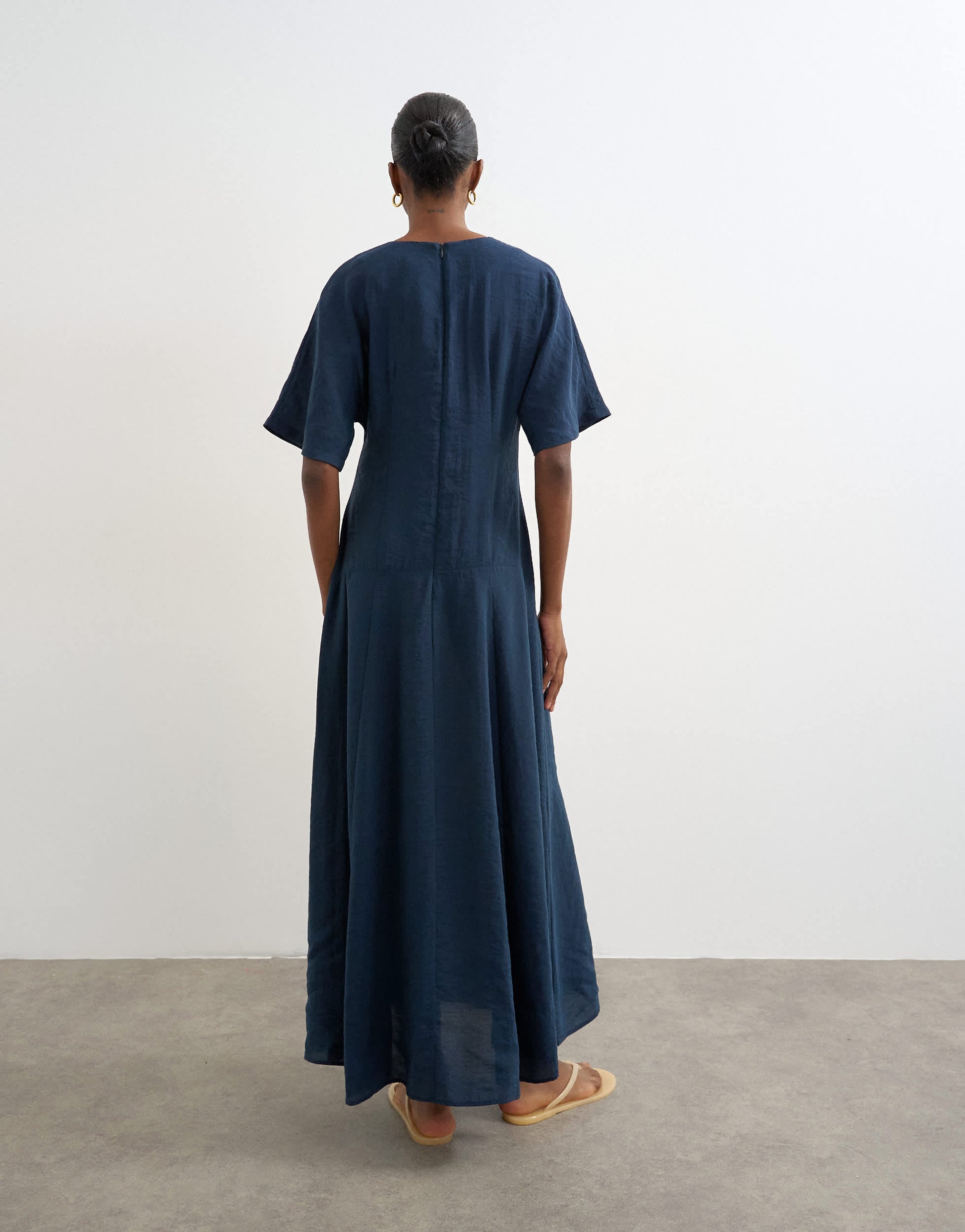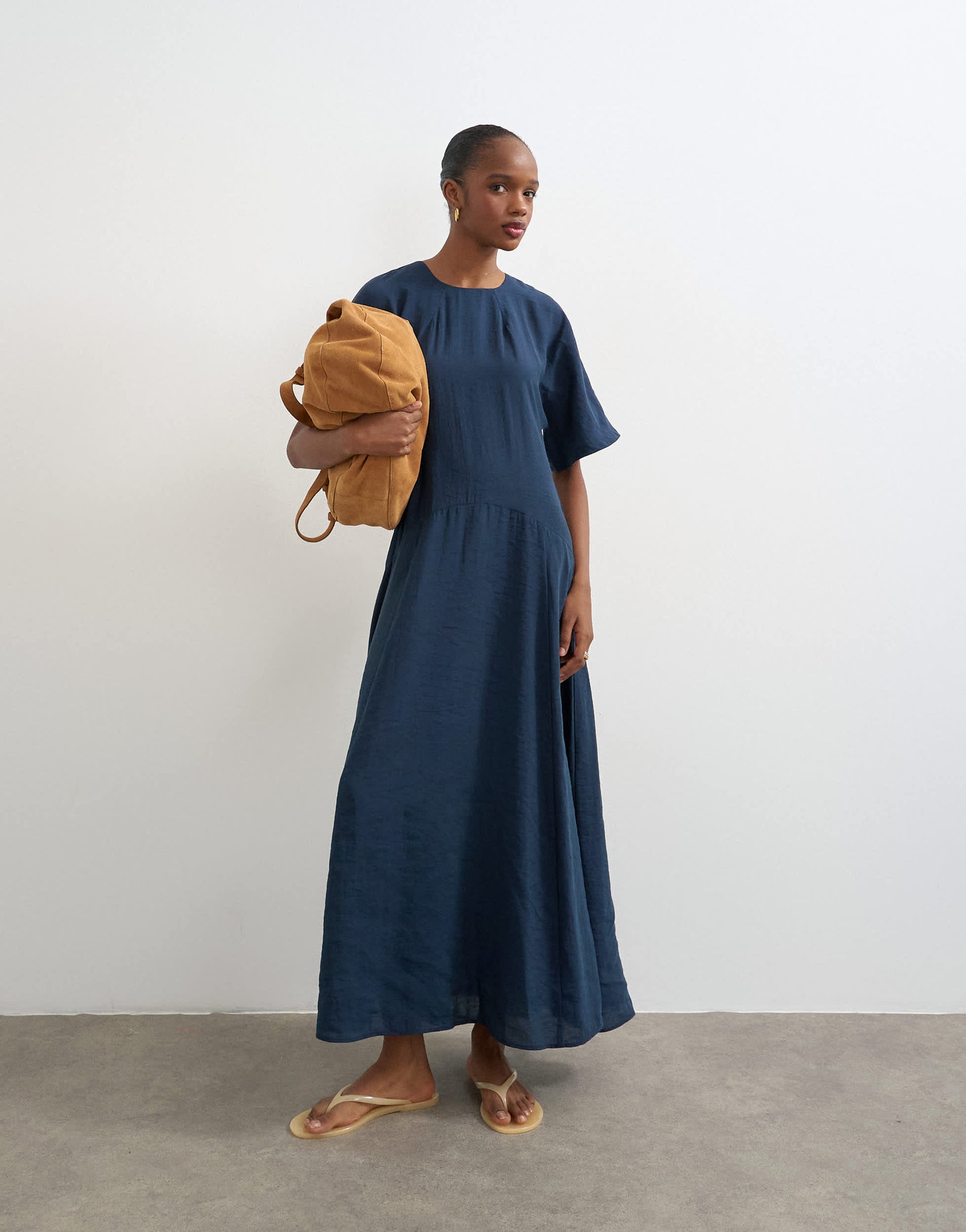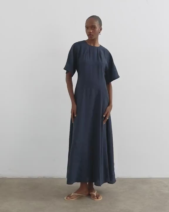 Cette robe est confectionnée en cupro doux de couleur marine. Elle présente une encolure ronde, des manches courtes et une fermeture éclair au dos, pour une coupe classique.