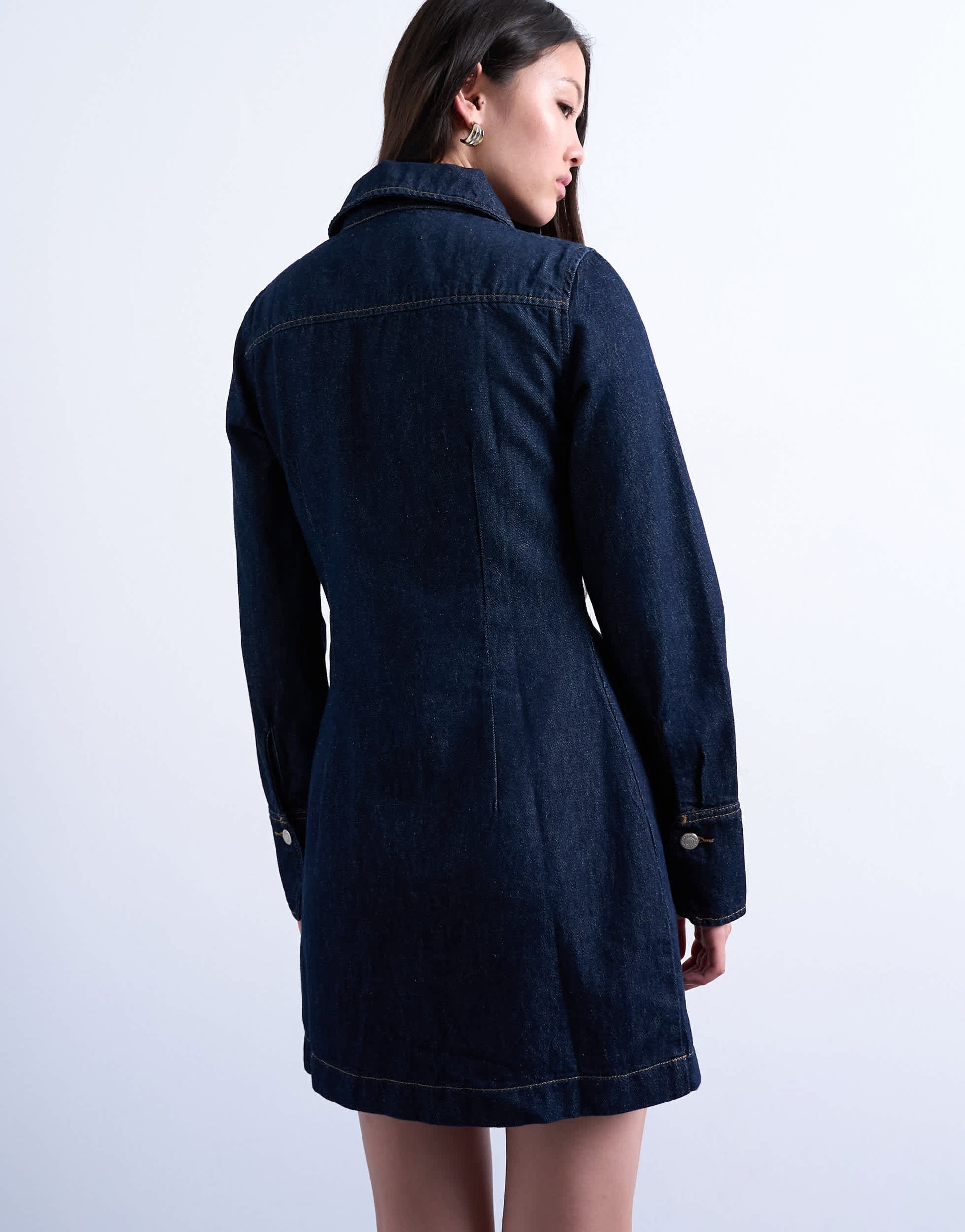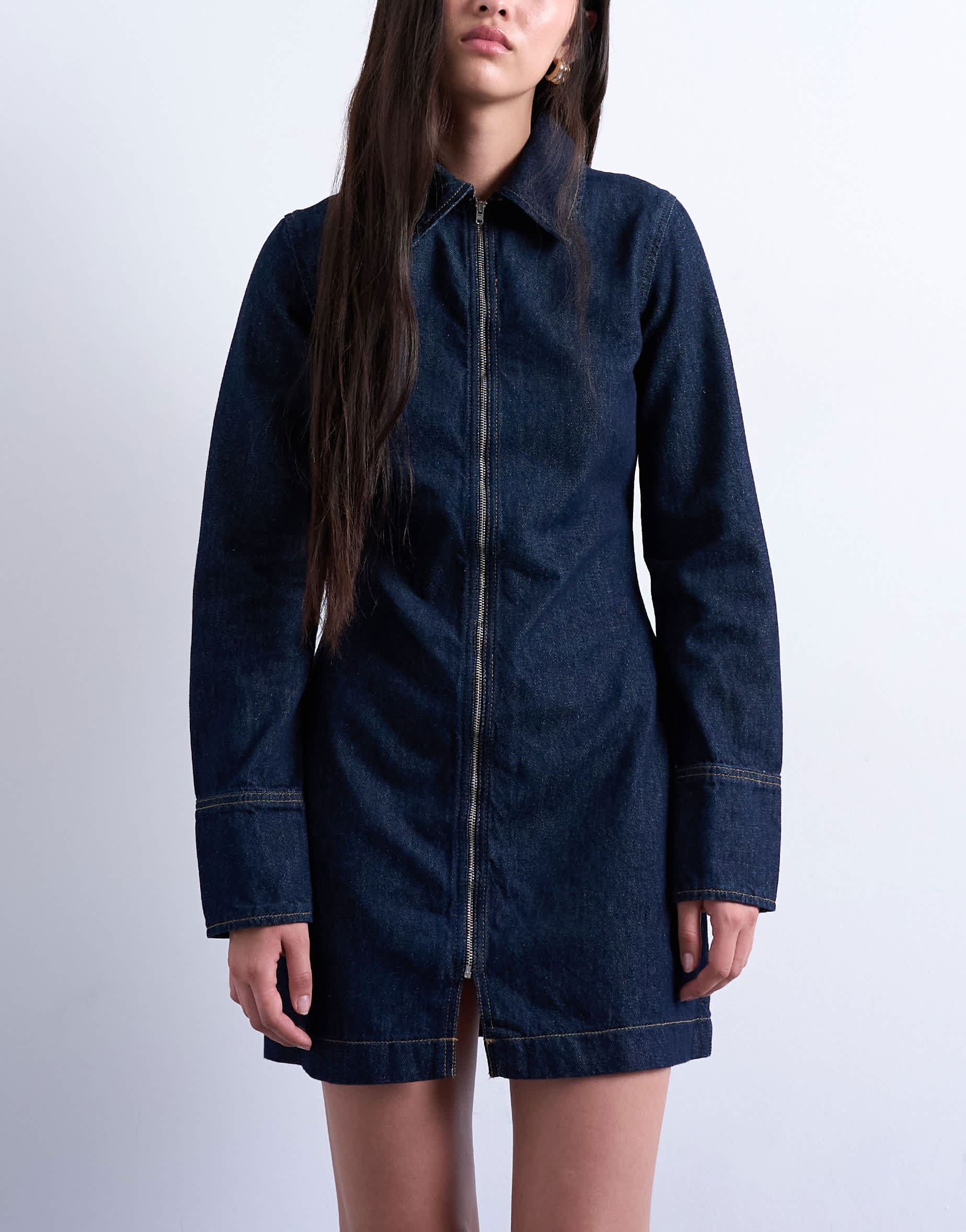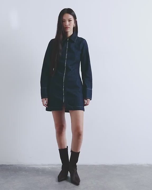 Robes de TopshopCette robe est confectionnée en denim non extensible d'un bleu indigo foncé. De coupe classique, elle présente un col italien, une fermeture éclair sur le devant et des manches longues. Elle est idéale pour la mi-saison.