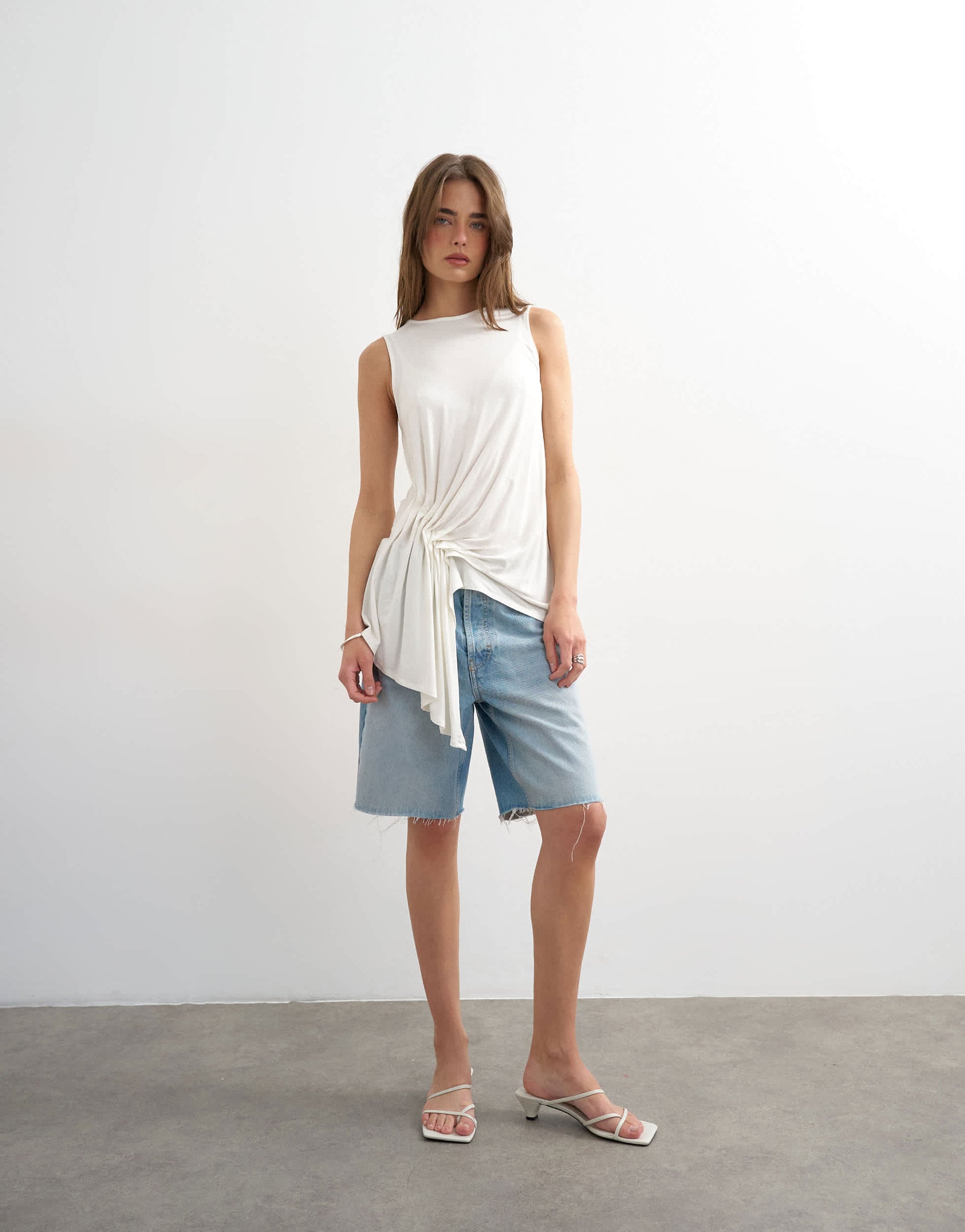 Tops by TopshopThis top is crafted from jersey in a plain design. The sleeveless style features a round neck, drape detailing and is cut with a regular fit.