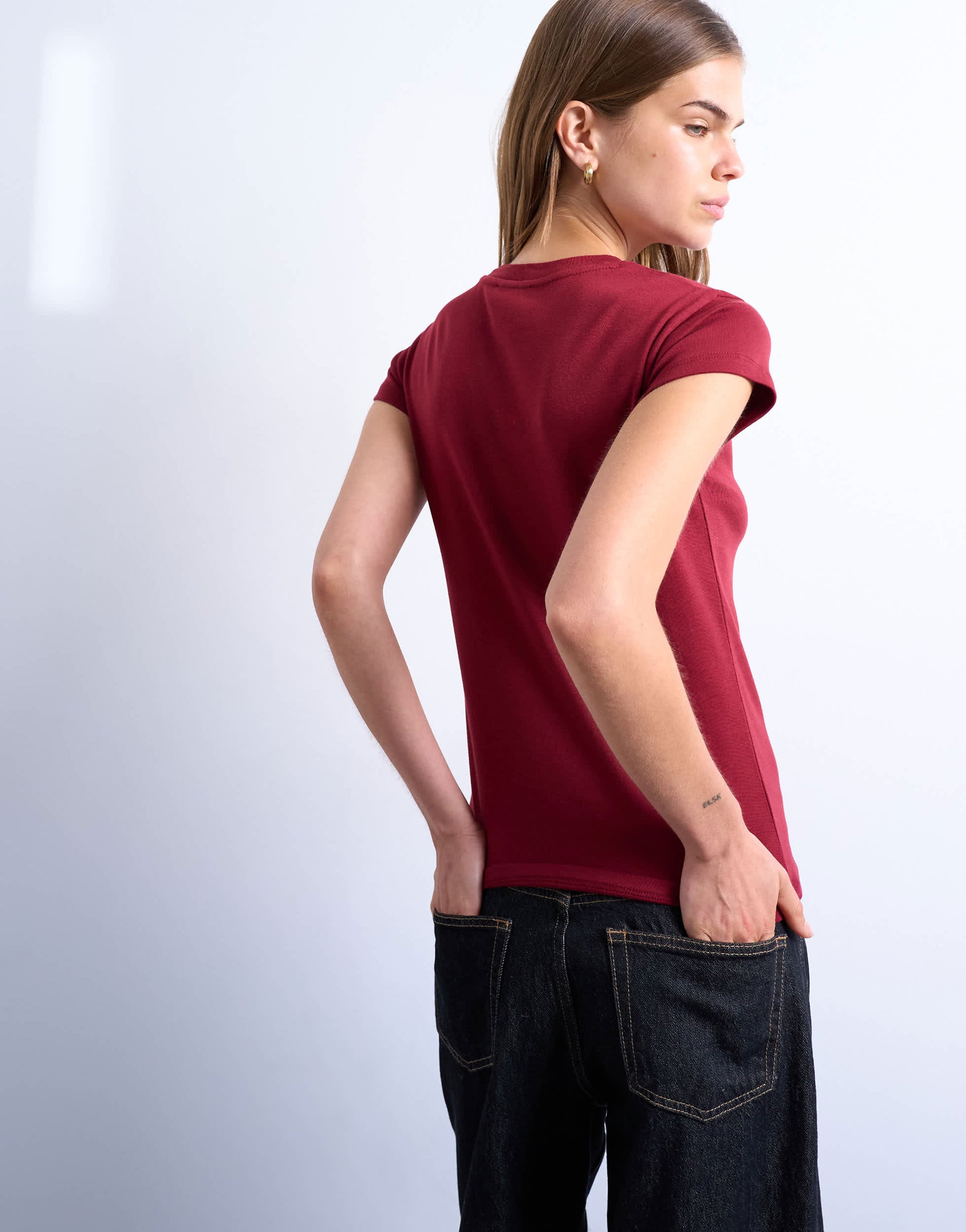 Hauts de TopshopCe t-shirt est confectionné en jersey doux et extensible, de couleur rouge foncé. Doté d'un col rond classique et de manches courtes, il présente une coupe ajustée pour une allure élégante.