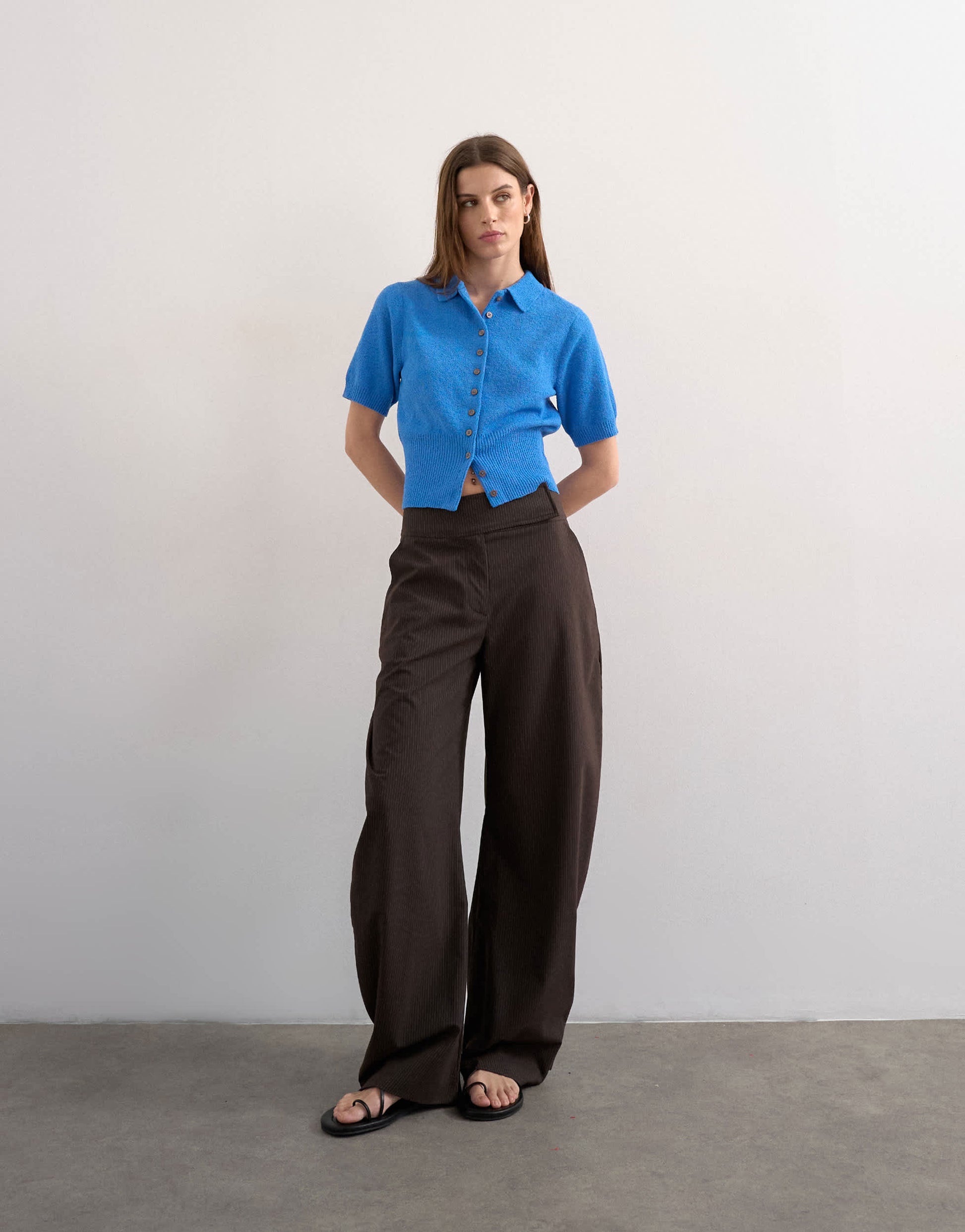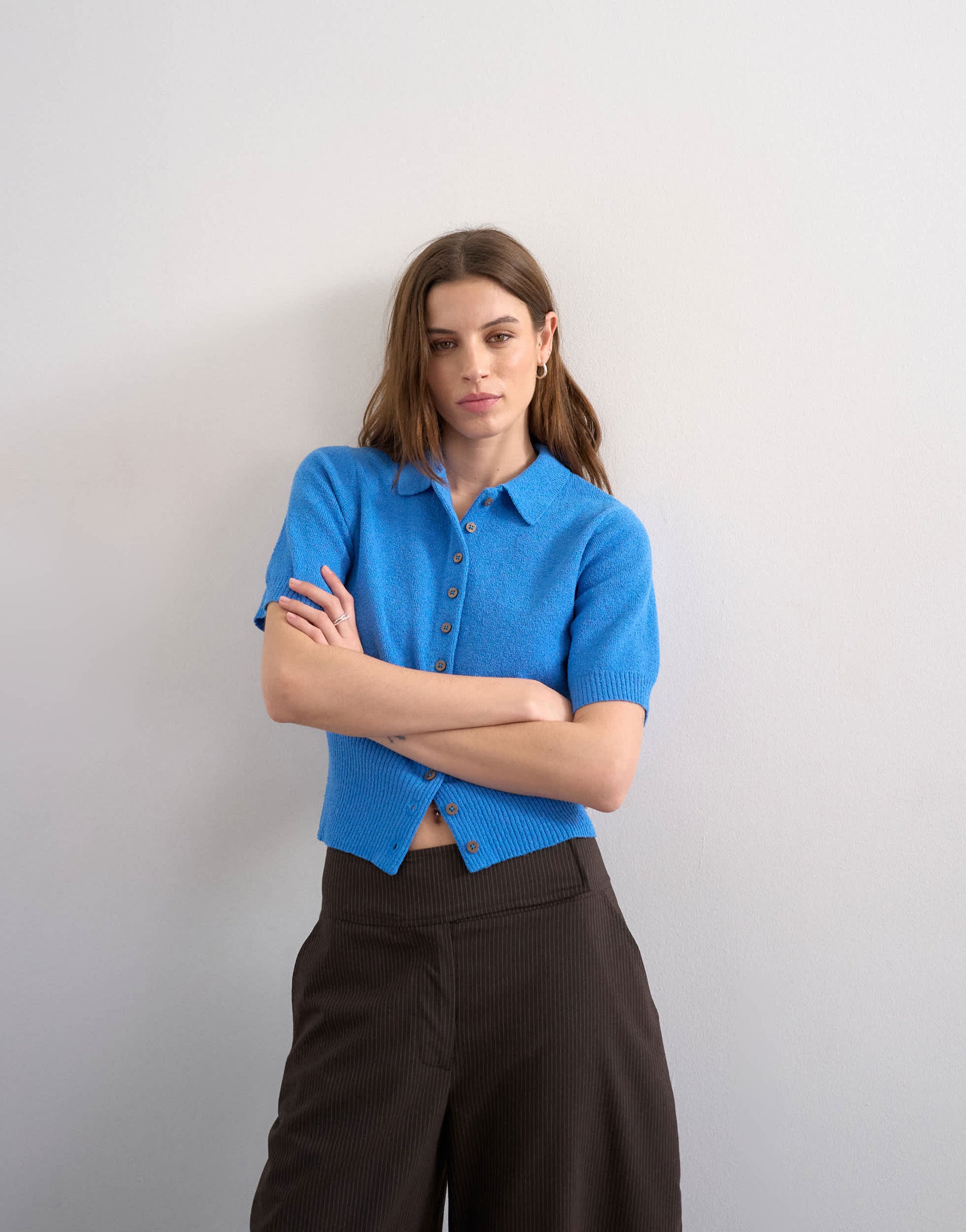 Hauts de TopshopCe haut est confectionné dans une maille fine. Il présente un col polo, une patte de boutonnage, des manches courtes et une taille cintrée. Sa coupe est courte.
