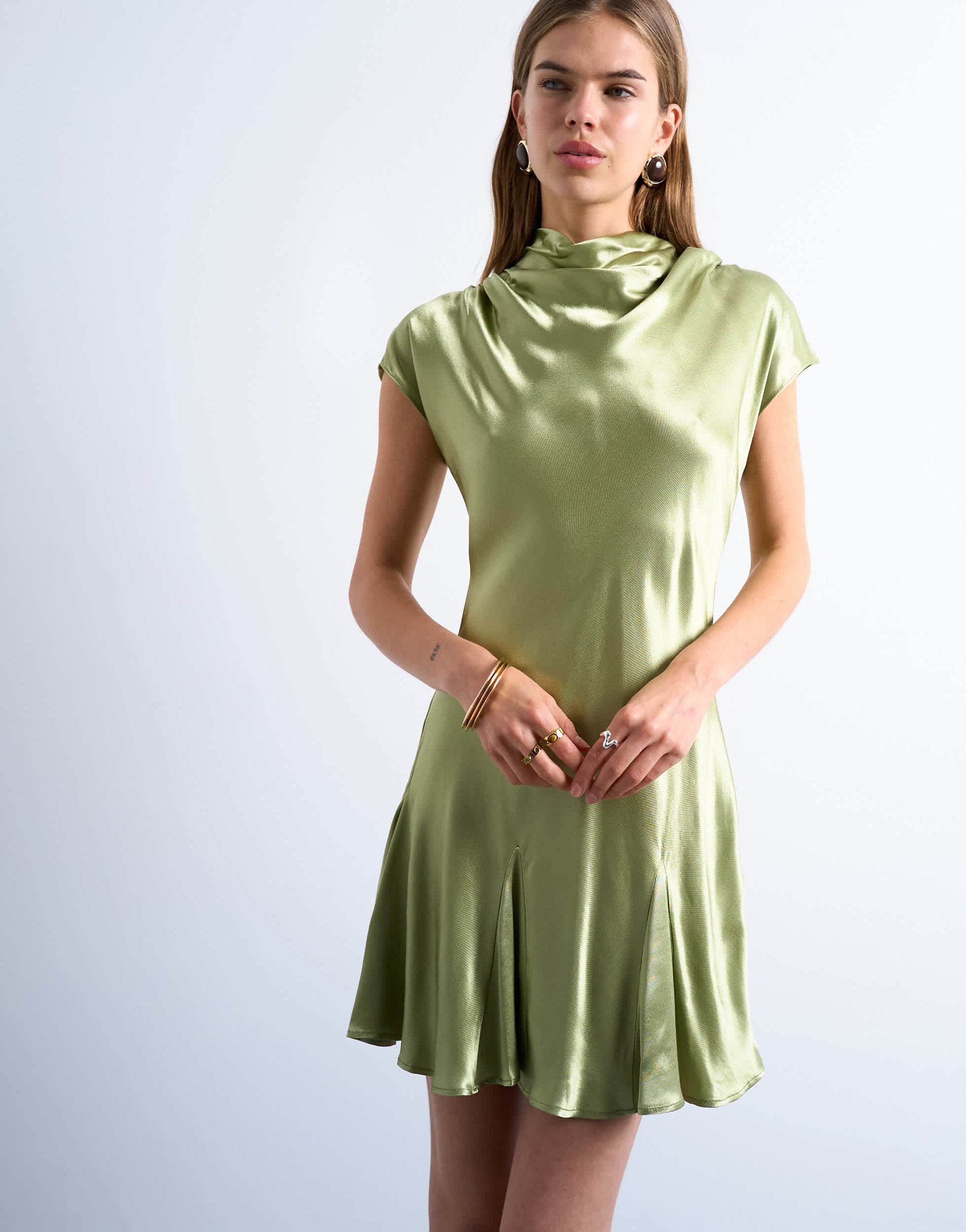 Robes de TopshopCette robe est confectionnée dans un tissu satiné brillant de couleur vert olive. Dotée d'un col montant et de manches courtes, elle présente une fermeture boutonnée en forme de goutte dans le dos et une coupe classique.