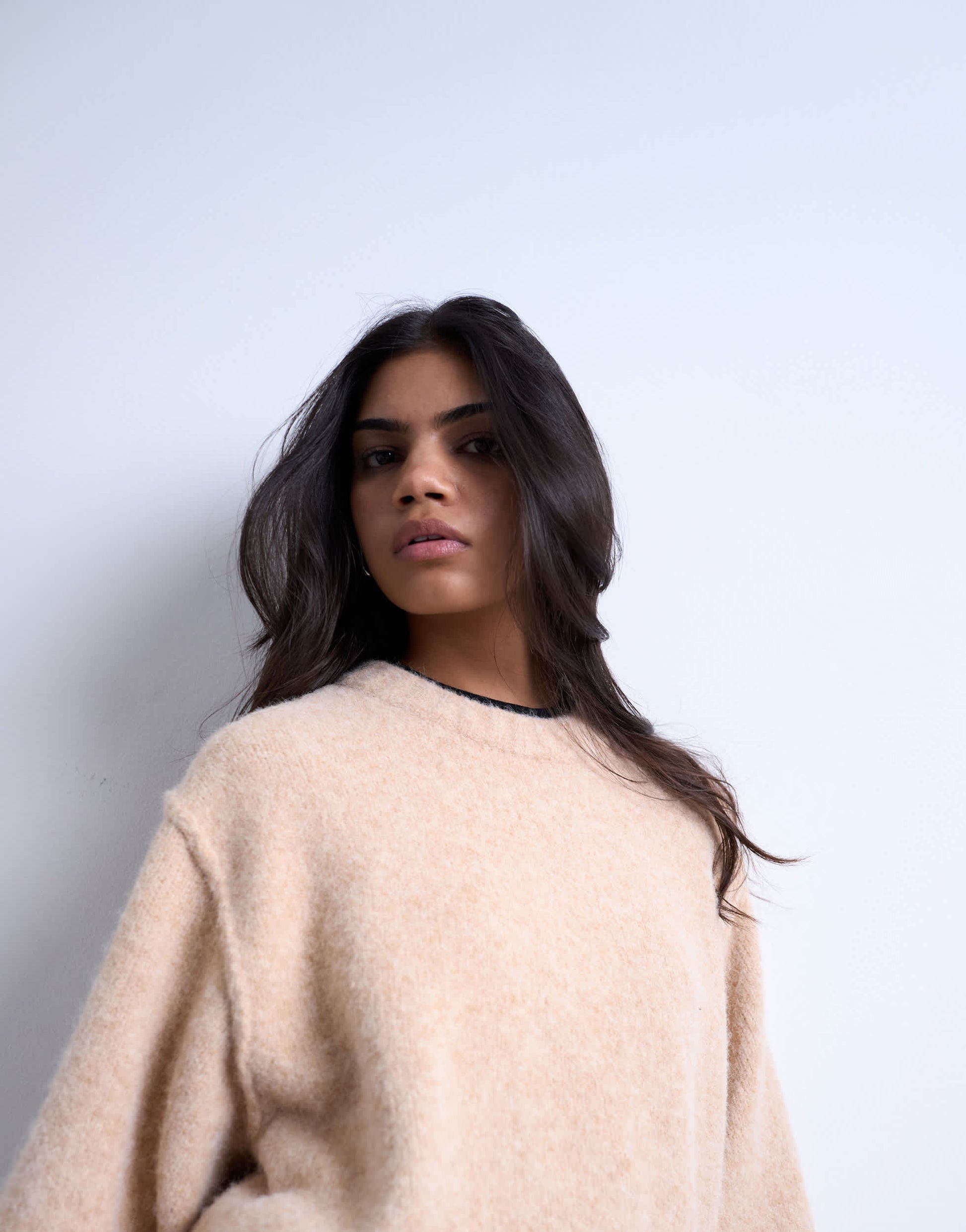 Robes de TopshopCette mini-robe est confectionnée dans une maille duveteuse et présente une coupe simple et polyvalente. Elle possède un col rond, des épaules tombantes, des finitions côtelées et une coupe décontractée.