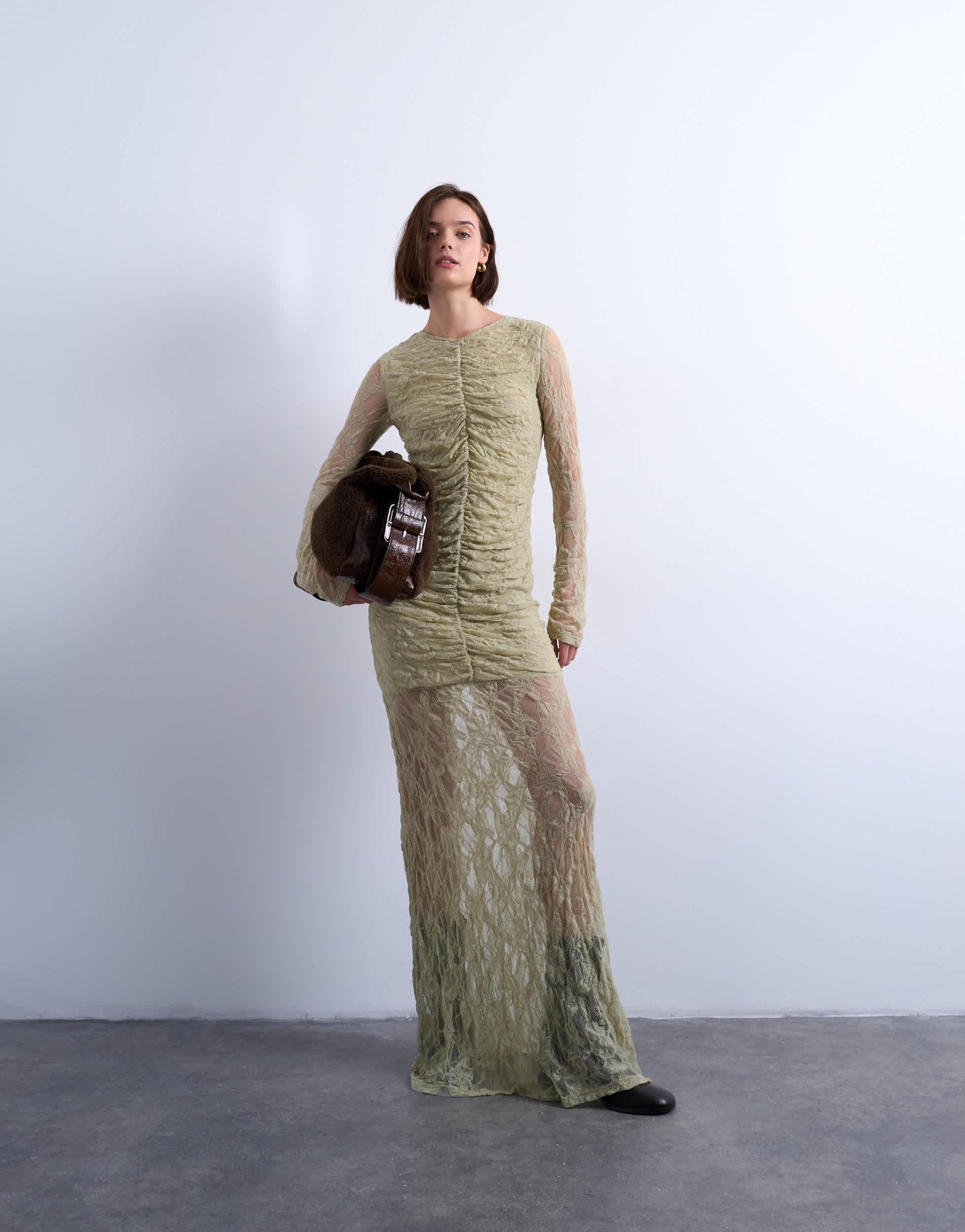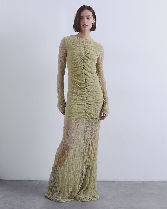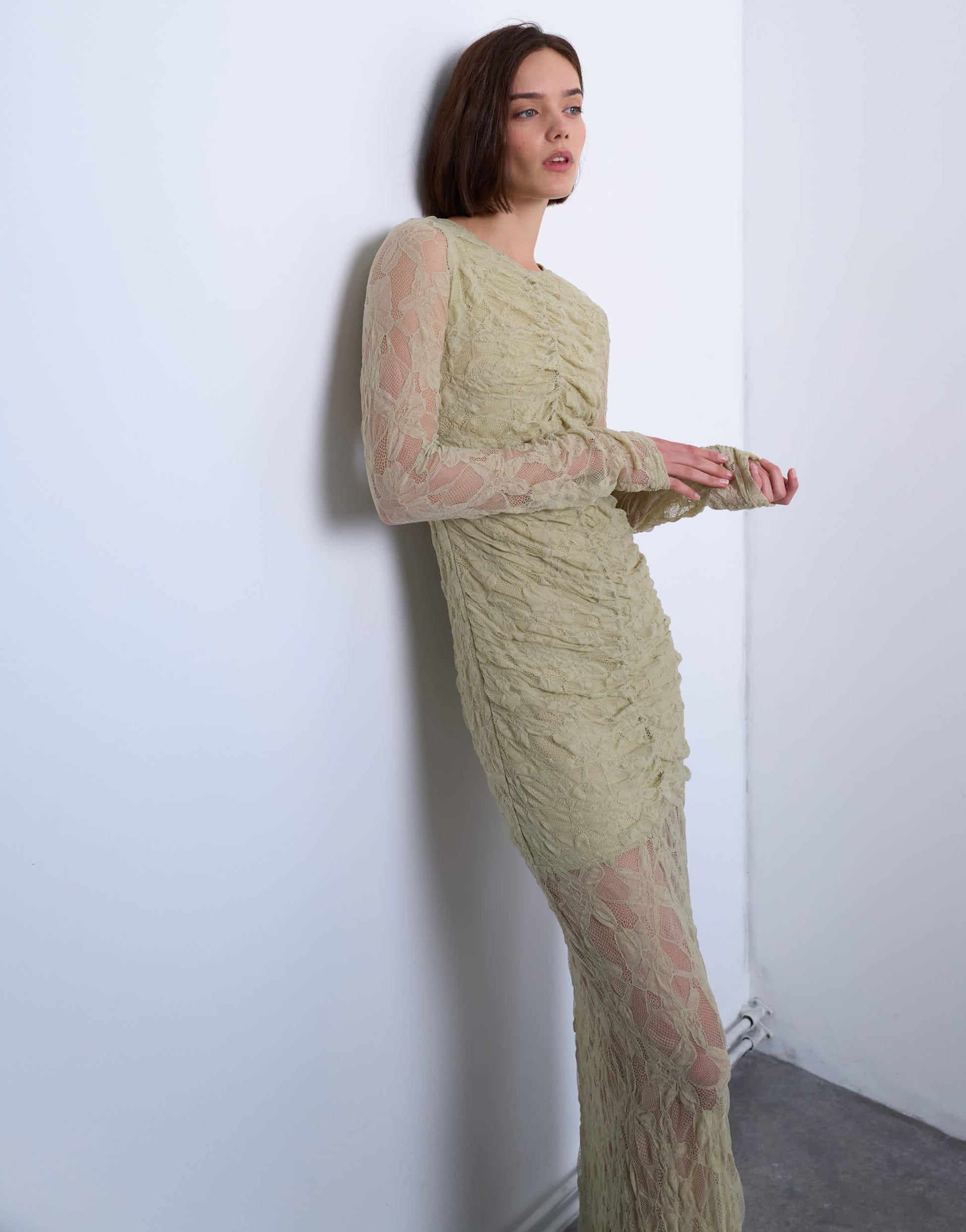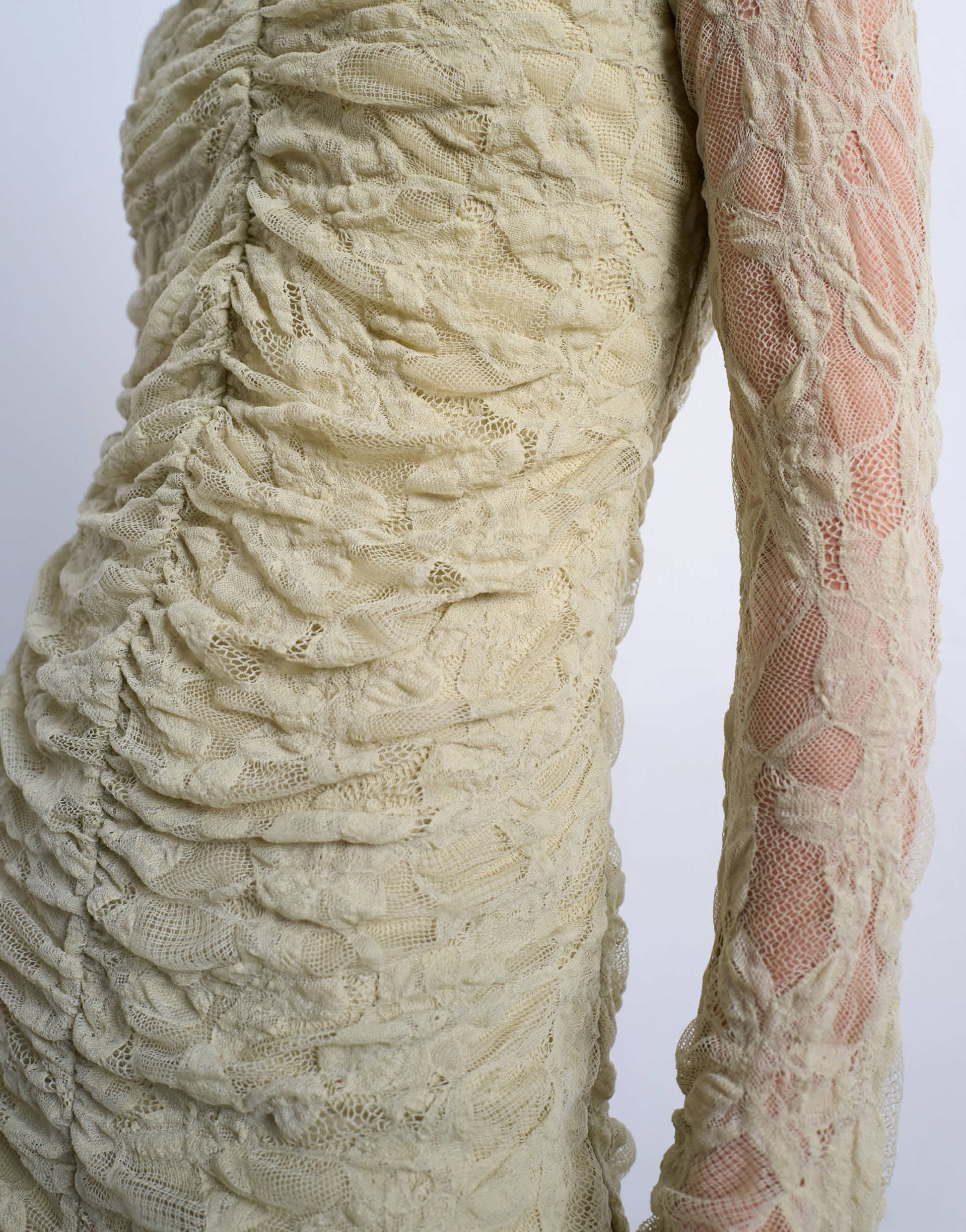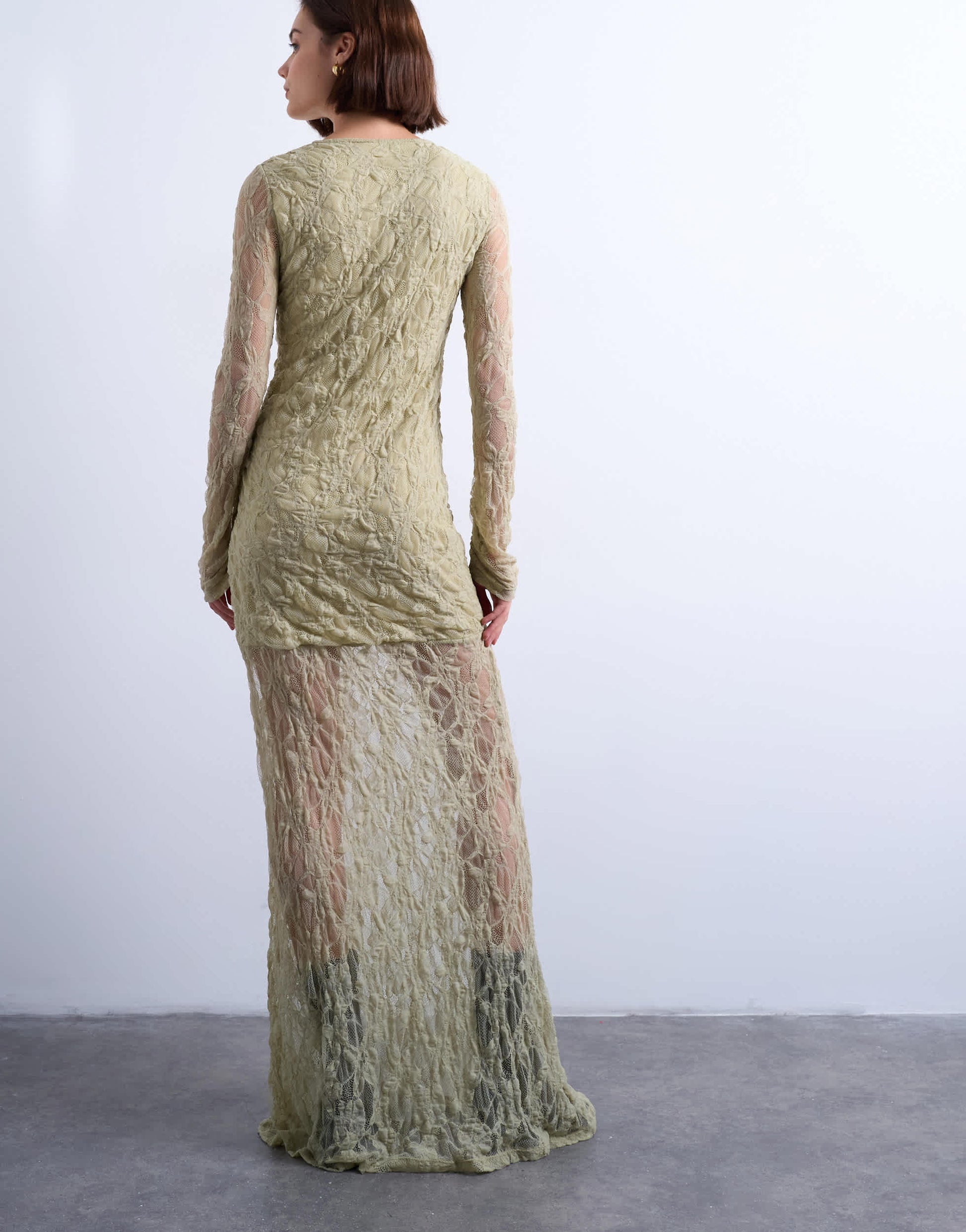 Robes de TopshopCette robe est confectionnée dans une dentelle délicate. Elle présente un col rond, des manches longues, un devant froncé, une taille basse et une coupe ajustée.