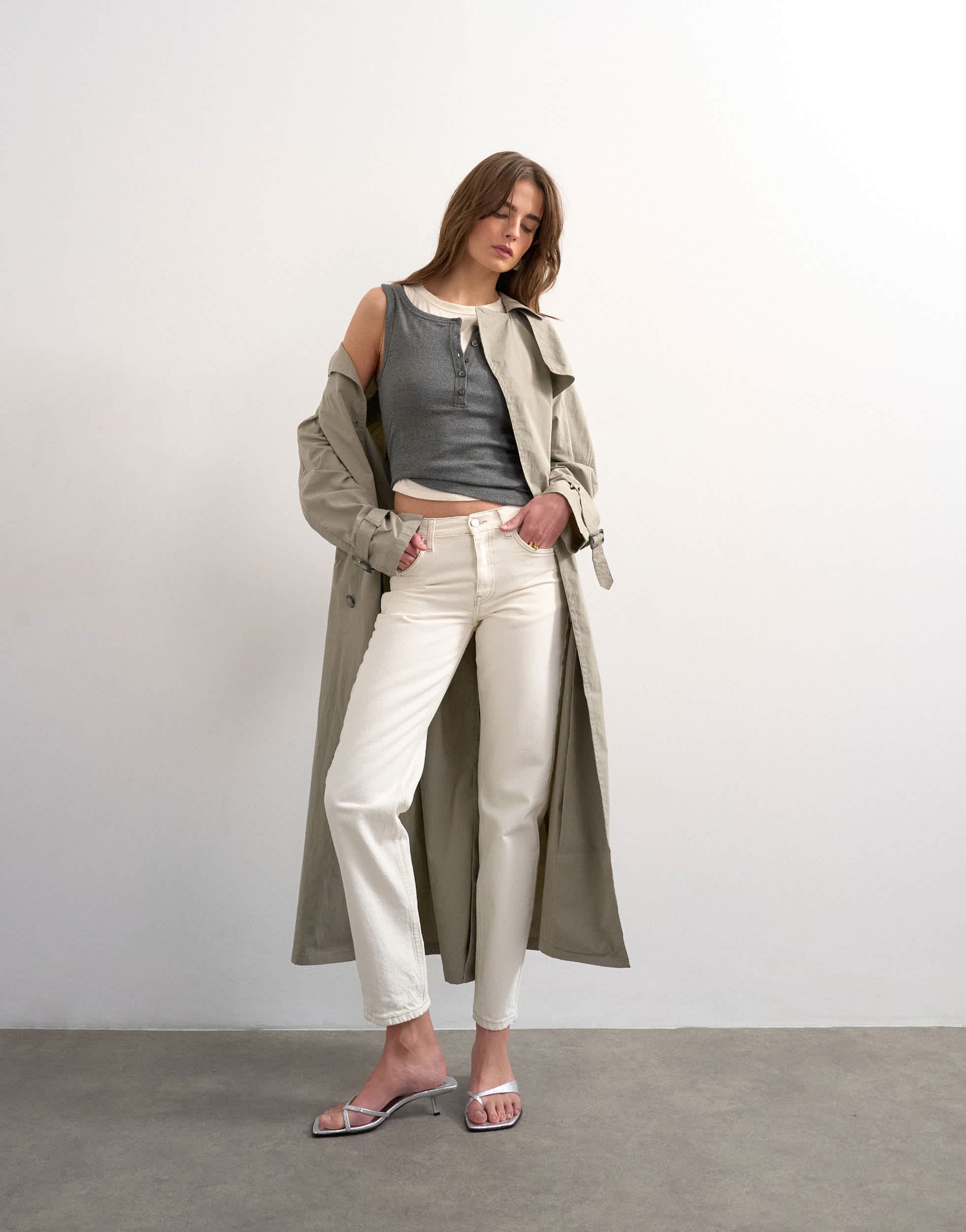 Jeans de TopshopLe jean Runway présente une taille mi-haute et une coupe droite qui se resserre à la cheville. Confectionné en denim non extensible blanc cassé, il est doté de passants de ceinture, de cinq poches et d'une braguette dissimulée.