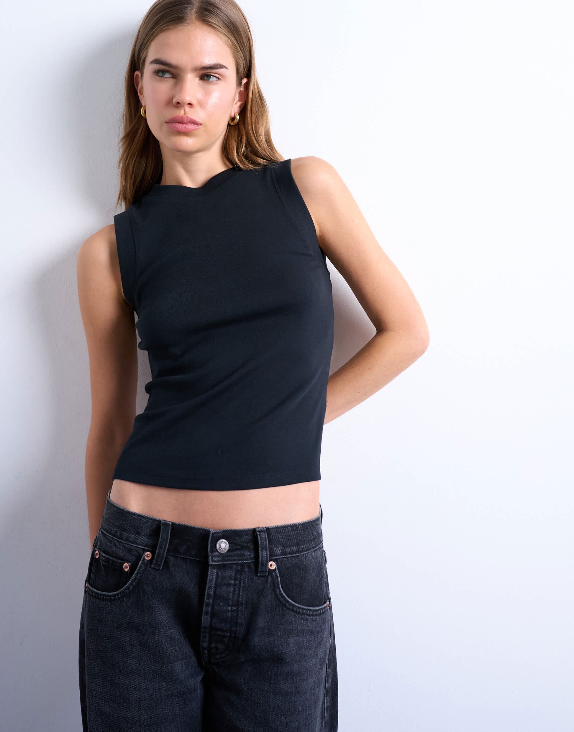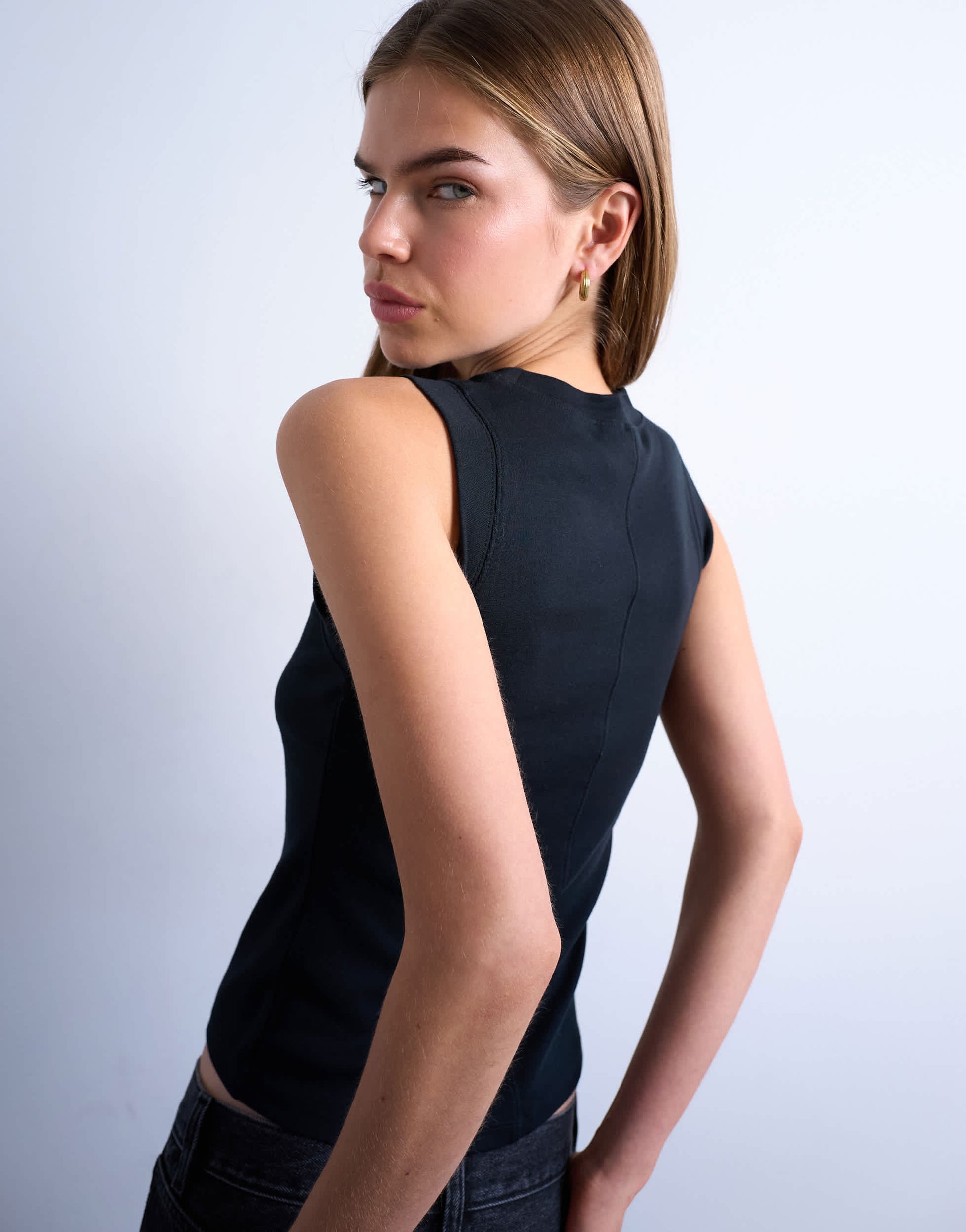Ce débardeur est confectionné en jersey doux et extensible, dans un coloris noir polyvalent. Doté d'une encolure ronde classique et d'une coupe sans manches, il est ajusté pour une silhouette cintrée.