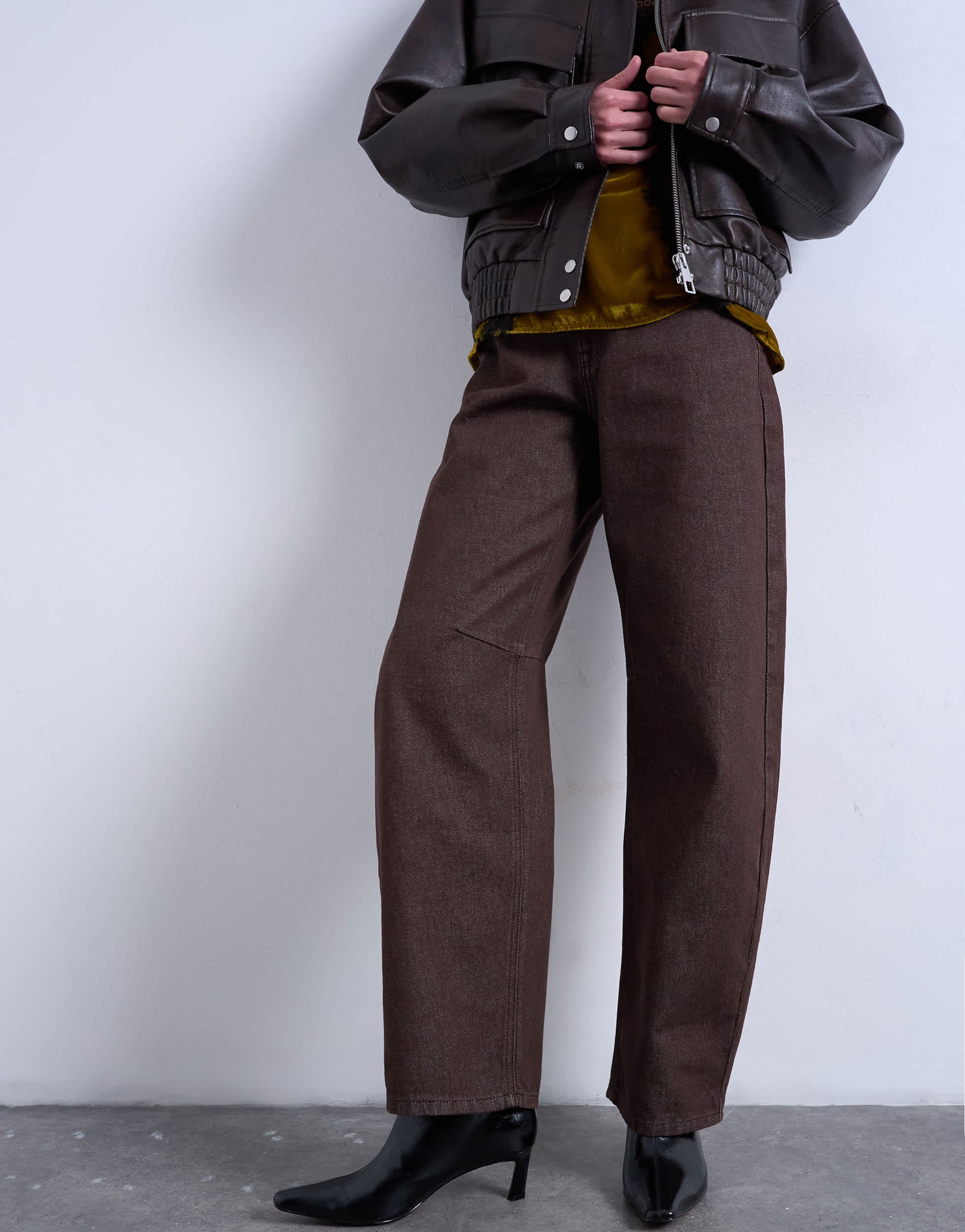 Jeans by TopshopThe Barrel jeans are cut with a mid-rise waist and a loose-fit leg that tapers at the ankle. Featuring a zip fly, five pockets and belt loops, this style is crafted from non-stretch denim for a classic feel in a chocolate-brown wash.