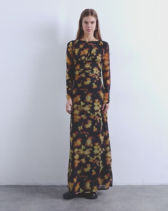 Topshop blurred floral print long sleeve maxi dress in black