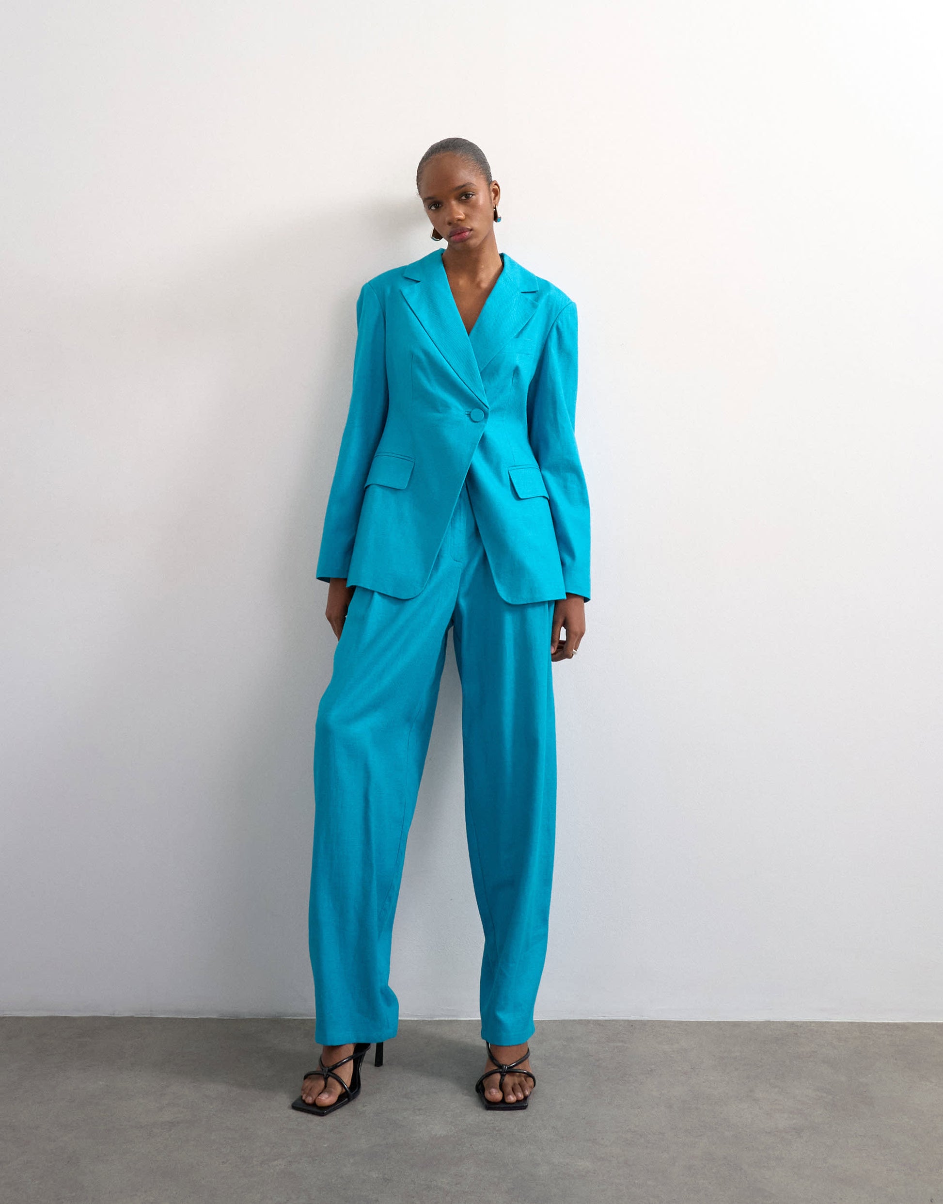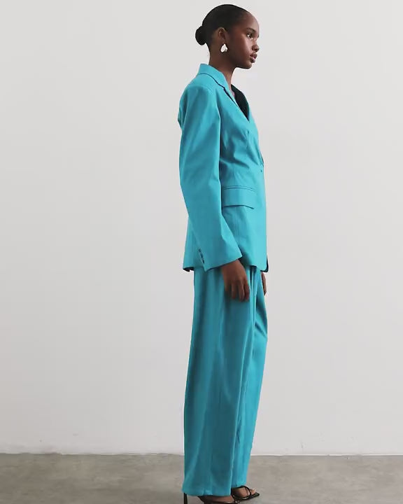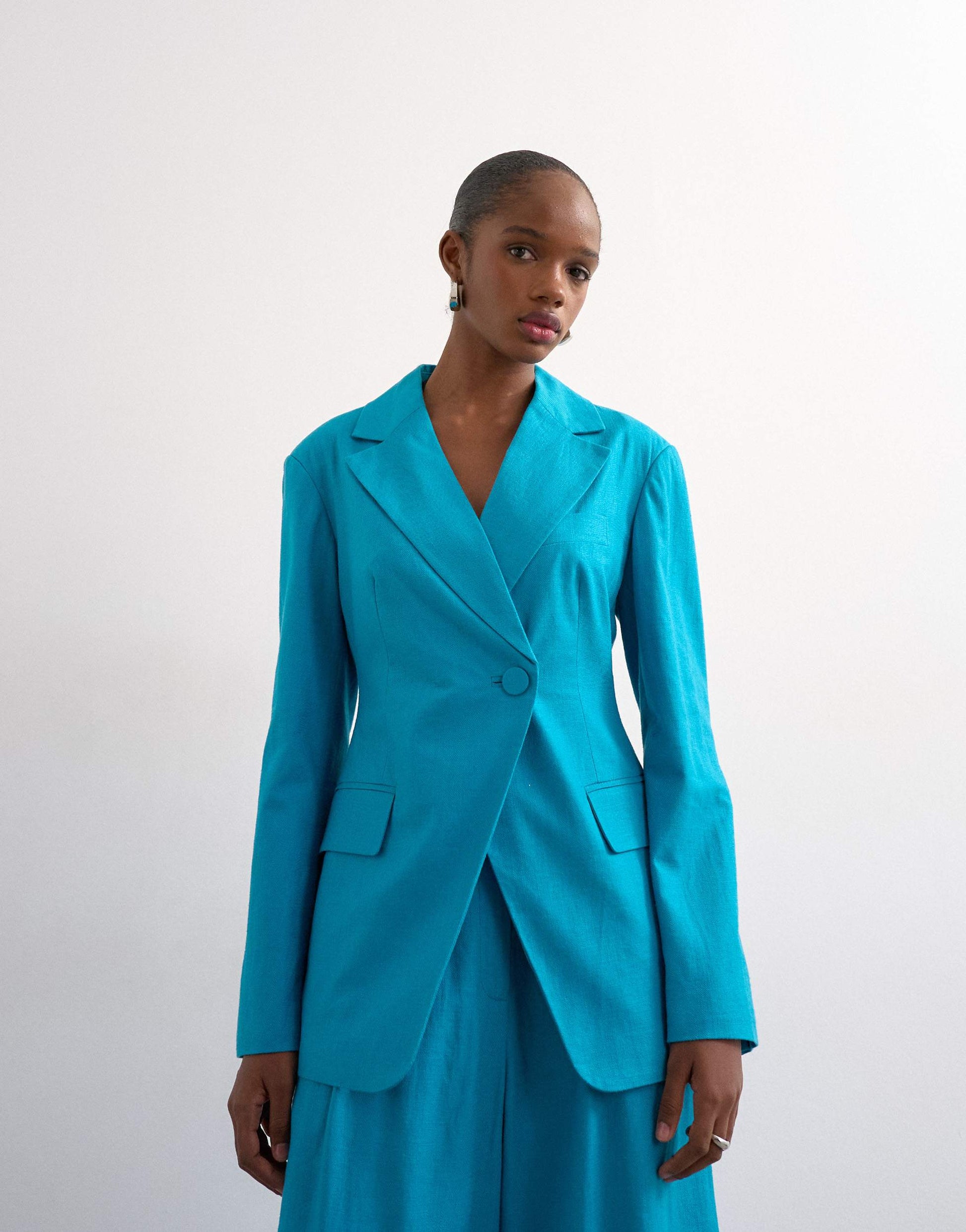 This blazer is crafted from a woven fabric in a vibrant turquoise shade. It features a notch collar, button fastening, cinched waist and is cut with a regular fit. Style with matching trousers.