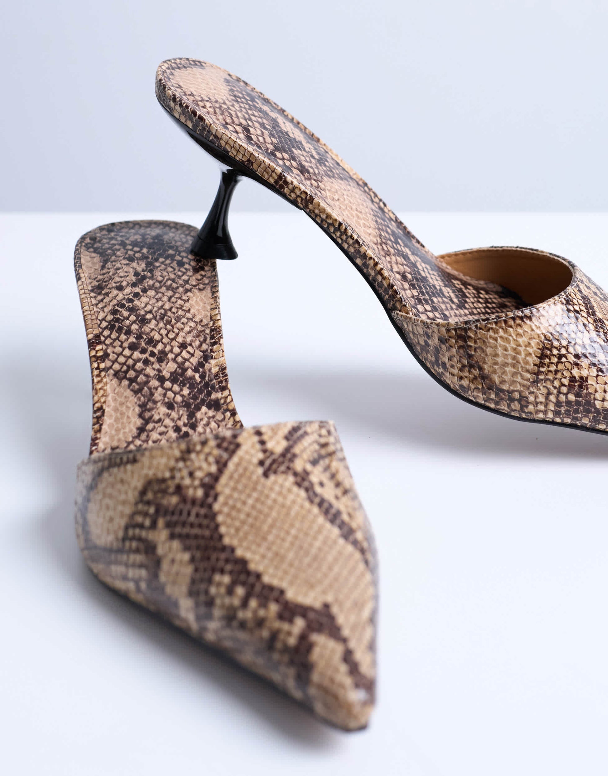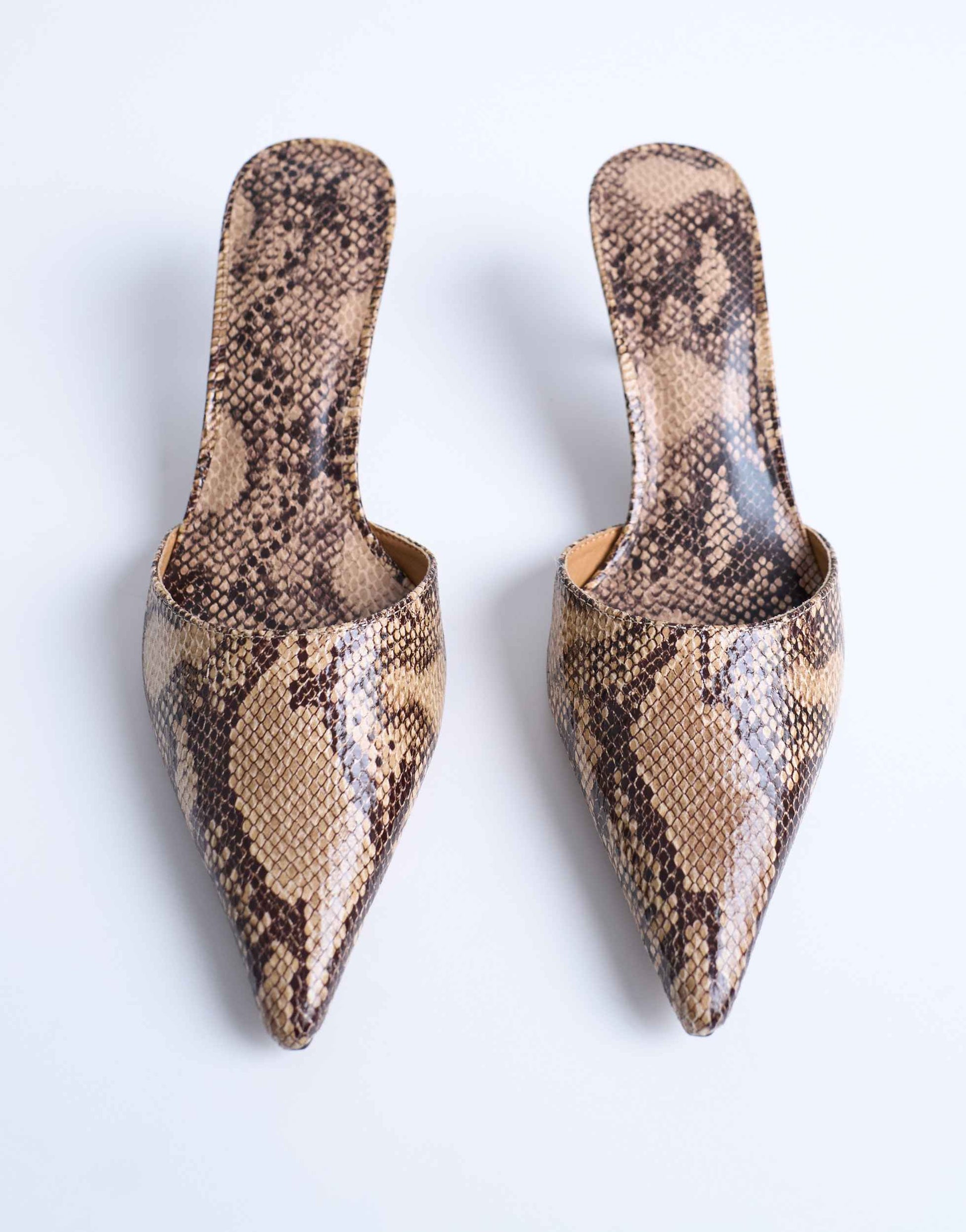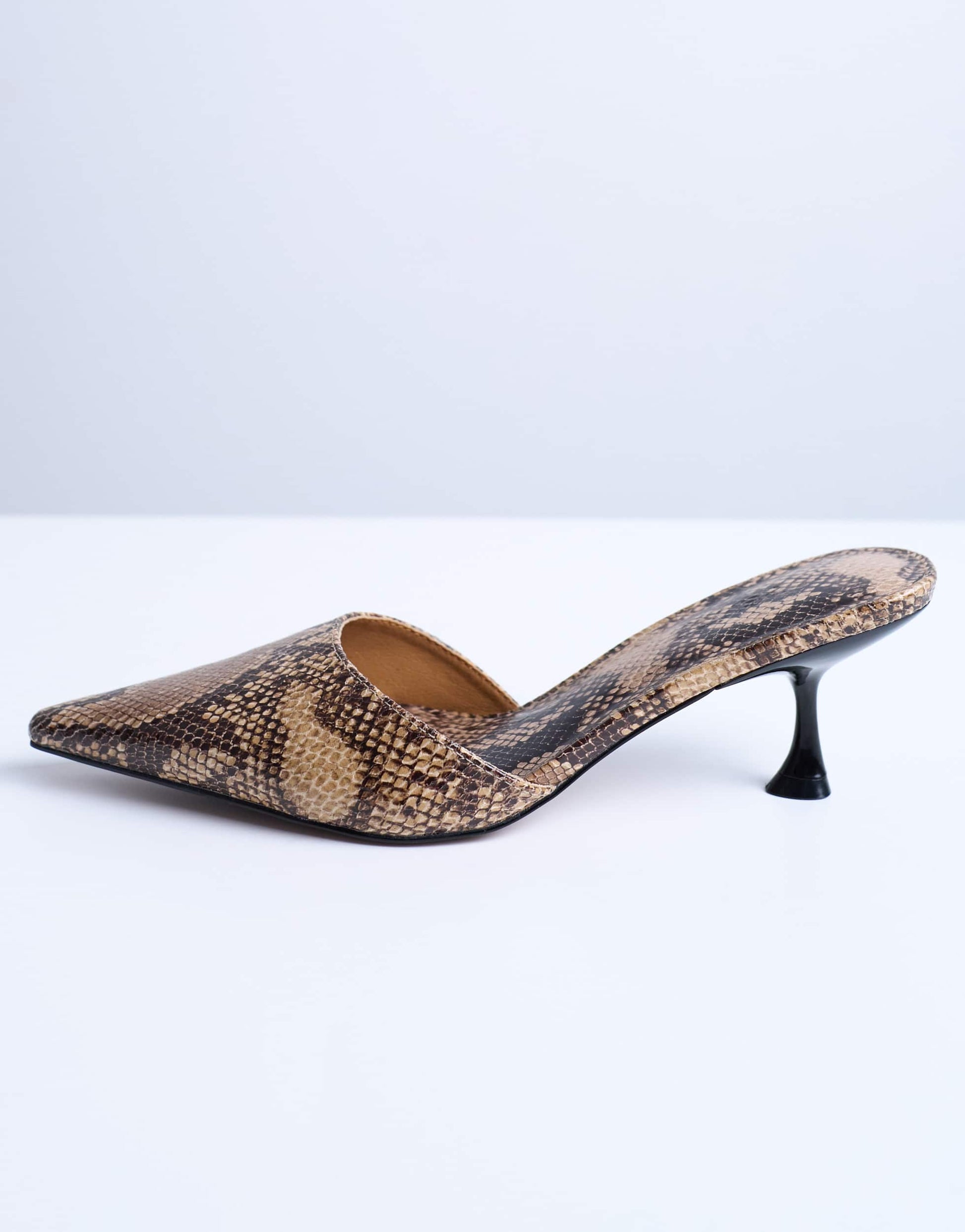 Shoes by TopshopThese Dorota mules are crafted from a textured, matte fabric. They feature a faux-snake pattern, slip-on design, pointed toe and kitten heel.