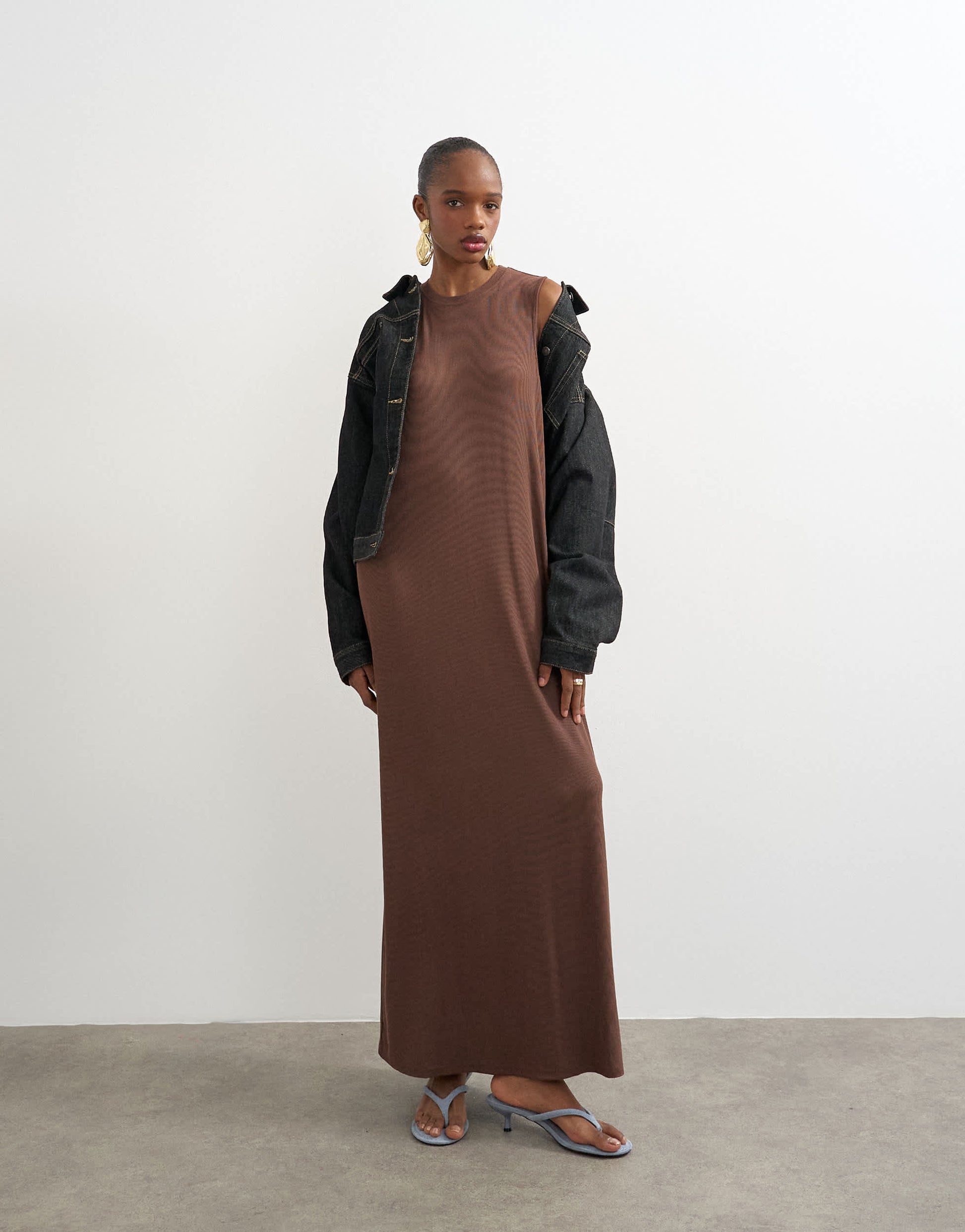 Topshop drop armhole rib maxi dress in chocolate brown