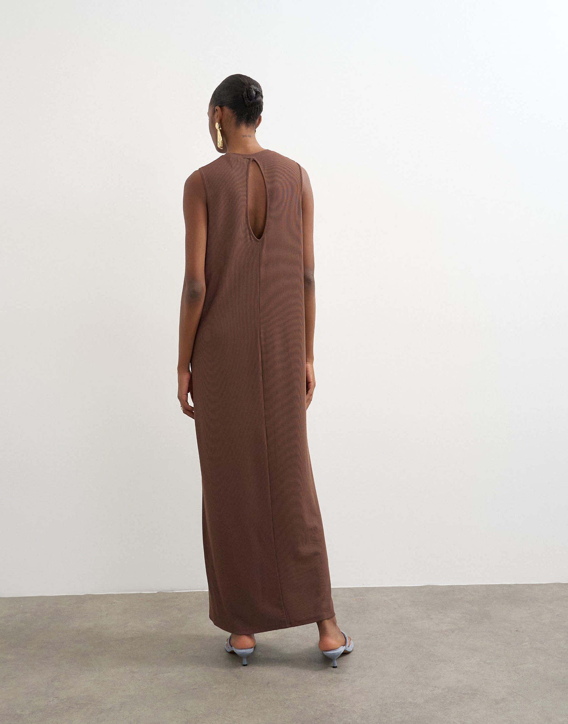 This dress is crafted from ribbed jersey in a chocolate brown shade. The sleeveless style features a round neck and keyhole back on a regular fit.