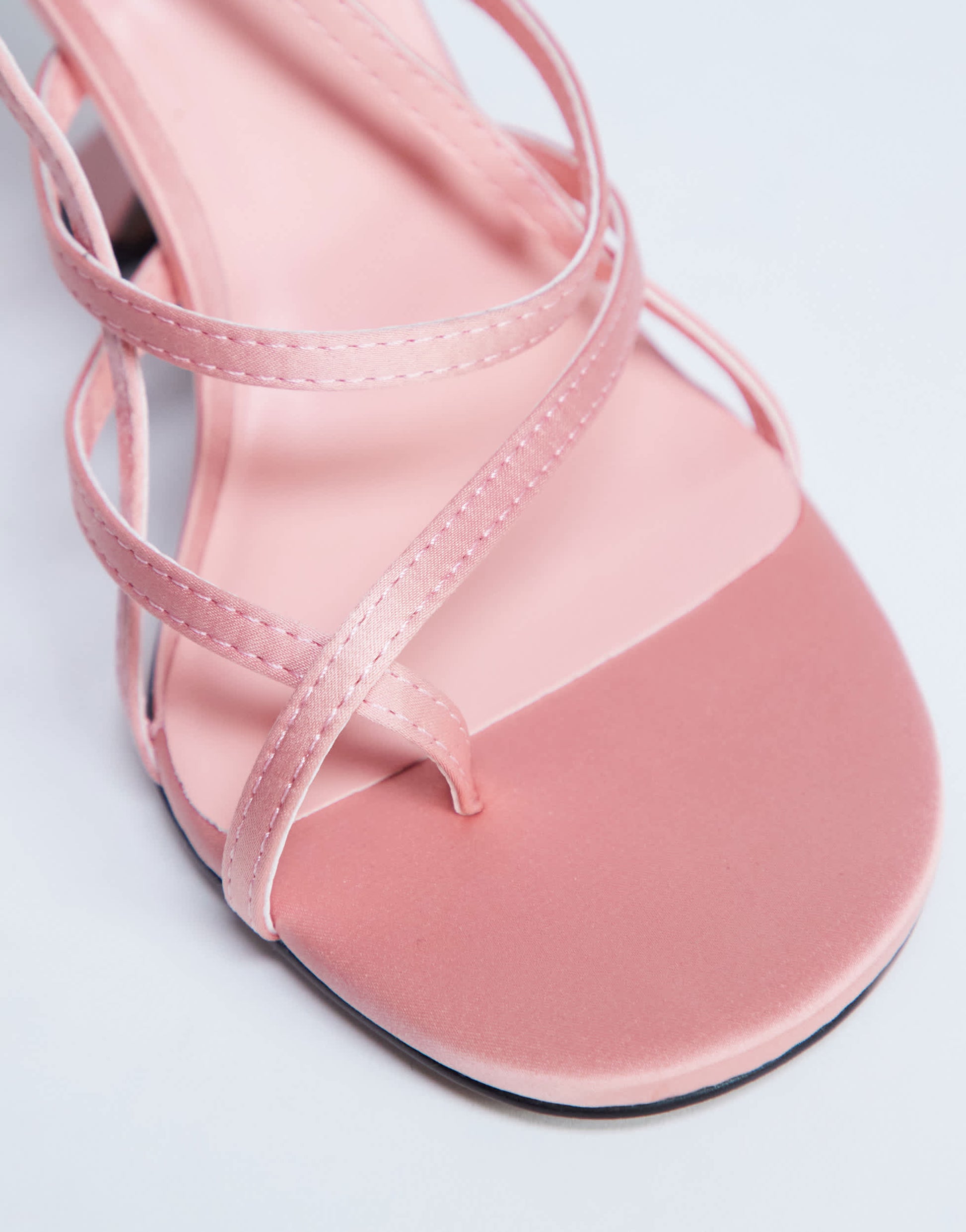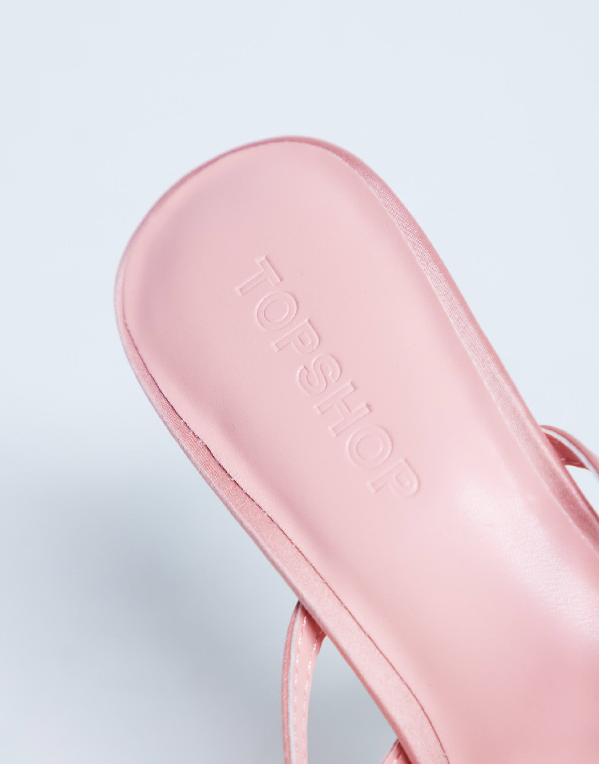 Shoes by TopshopThese heels are crafted from satin-style fabric in a pink shade. The strappy design features an open toe, pin-buckle fastening and an angled heel.