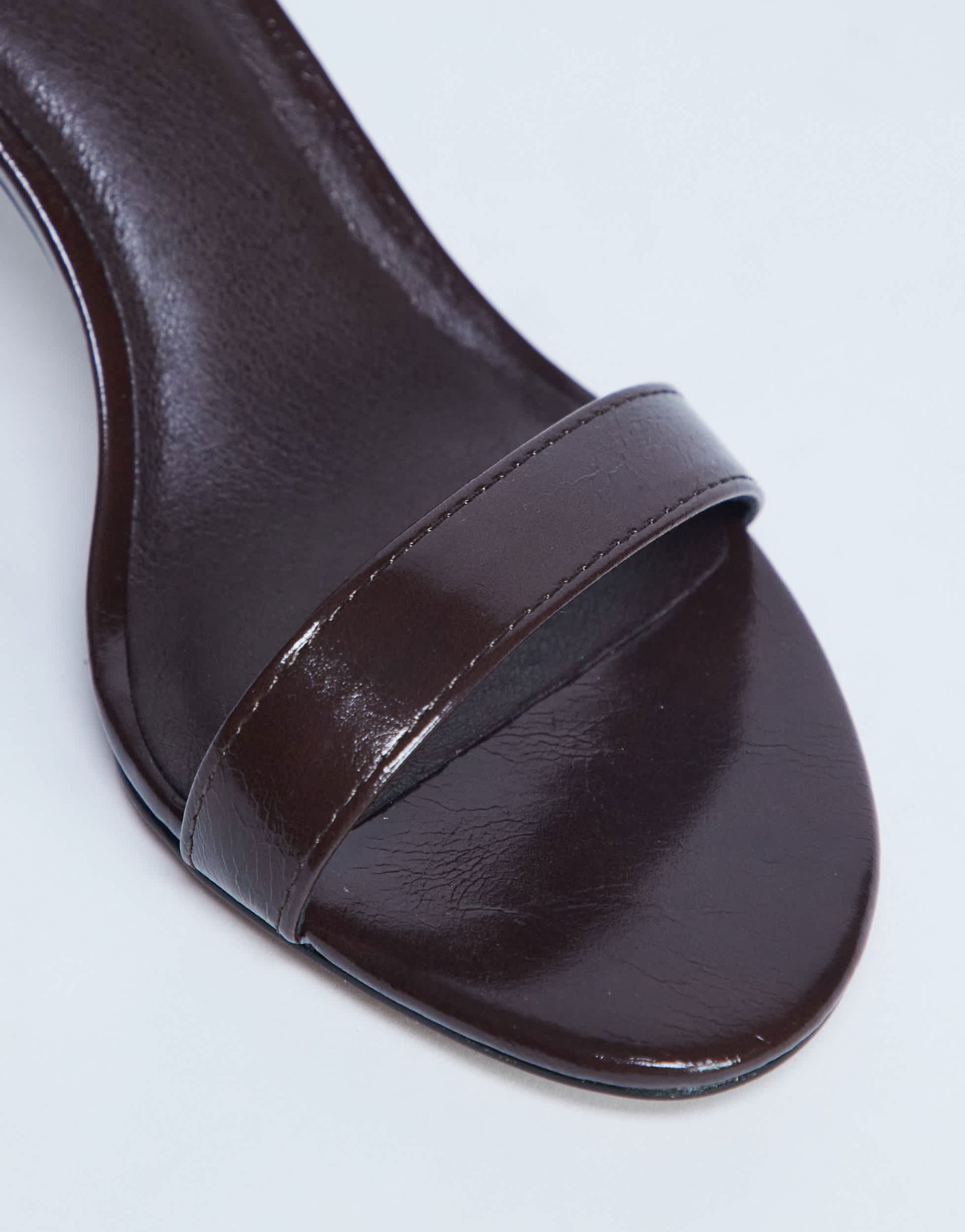 Shoes by TopshopThese heels are crafted from a textured, patent fabric in a chocolate brown shade. Featuring an adjustable ankle strap, open toe and high point heel, this style is perfect for that barely there feel.