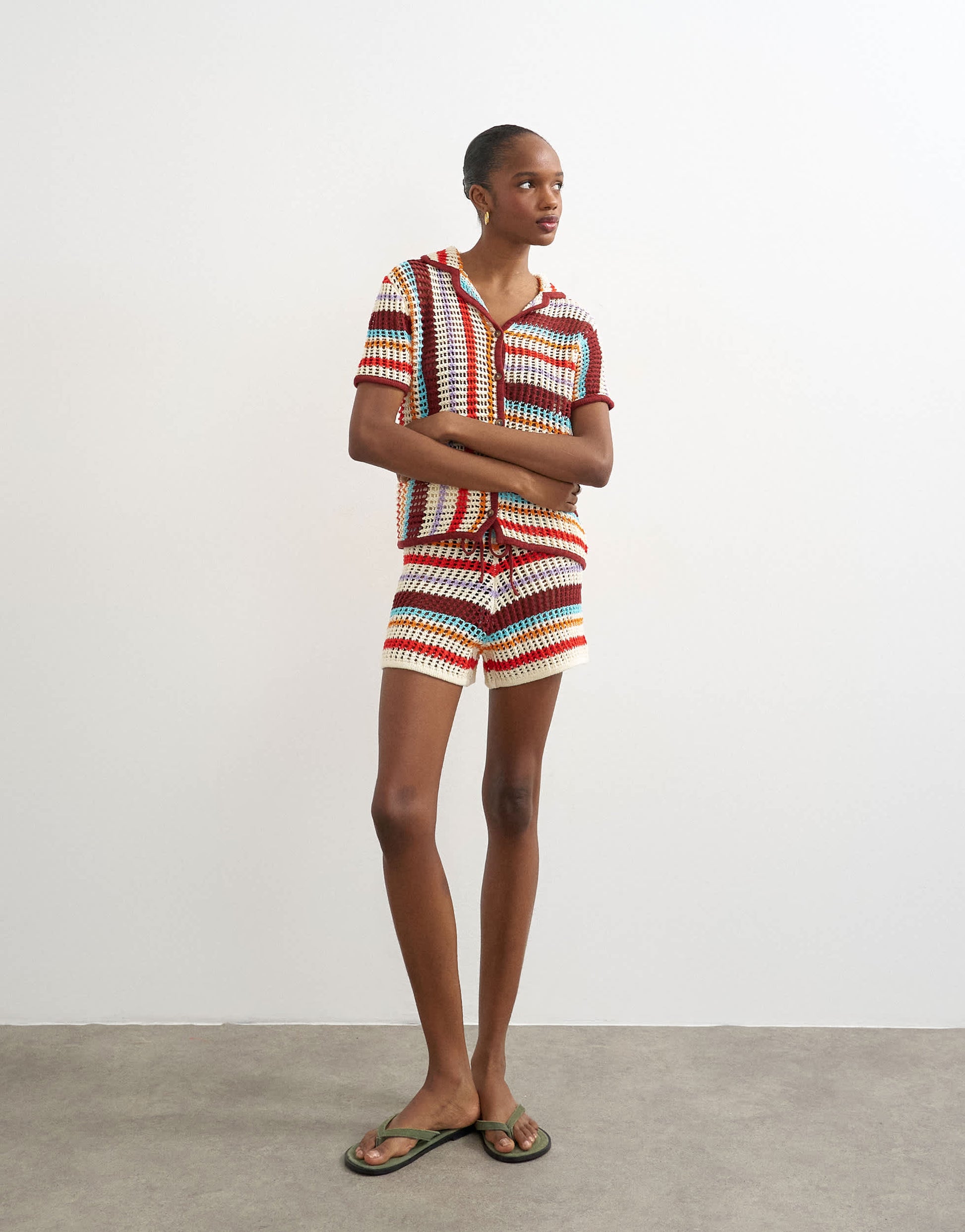 Tops by TopshopThis shirt is crafted from a mid-weight knit in a crochet-style design. It features a striped pattern, a revere collar, button placket and short sleeves on a regular fit.
