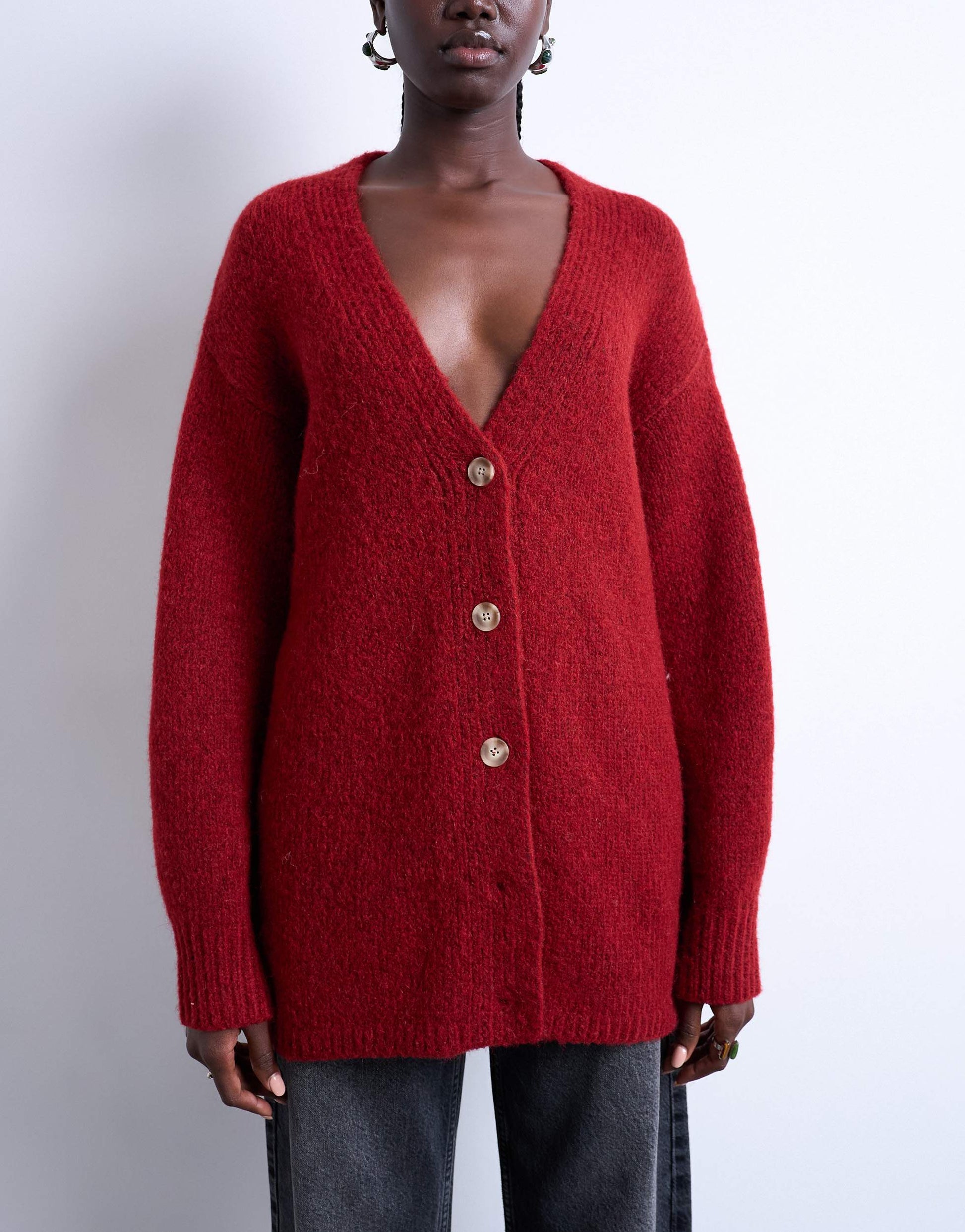 Jumpers & Cardigans by TopshopIn a vibrant red hue, this knitted cardigan features a V-neck, a button placket and a relaxed, longline cut.