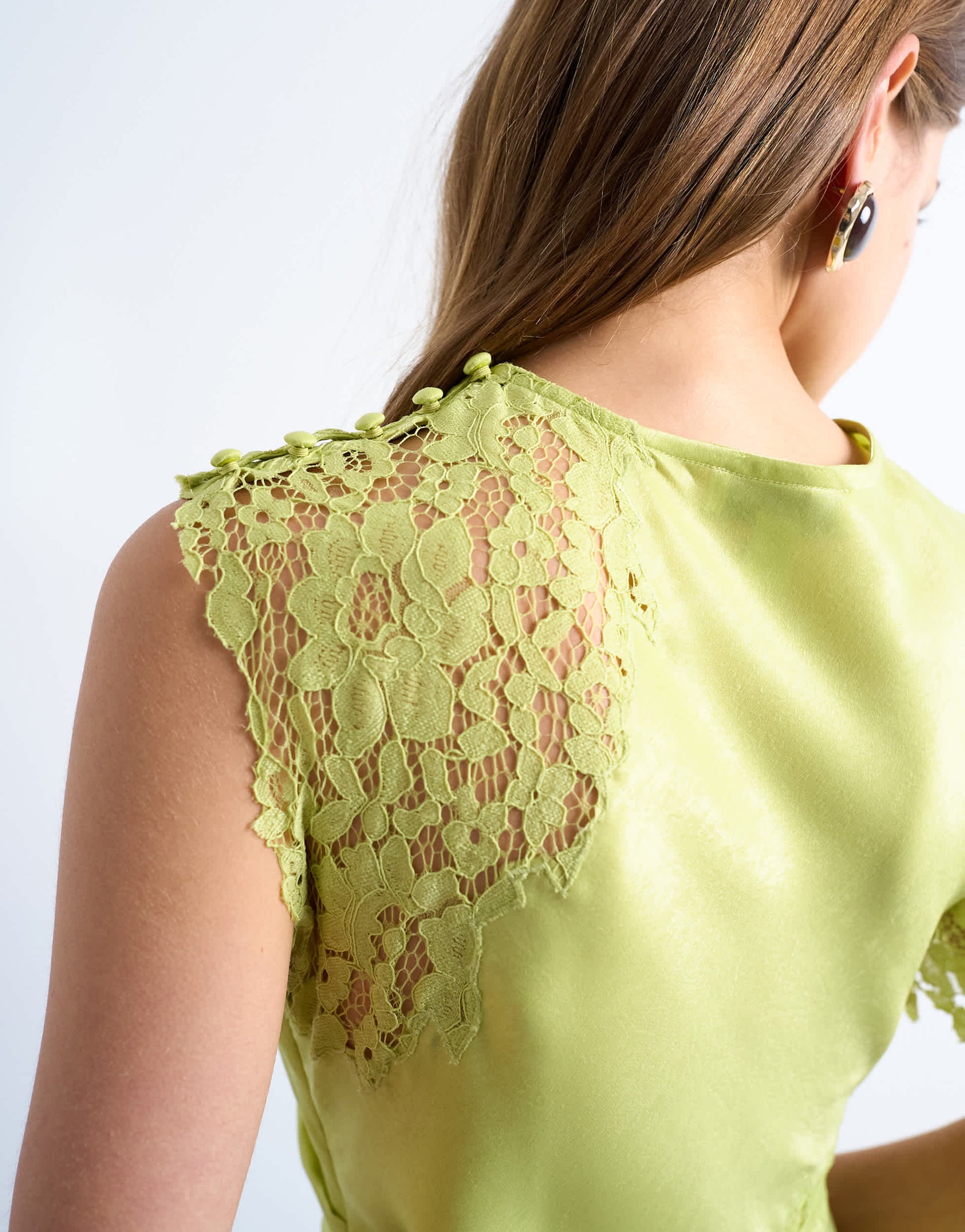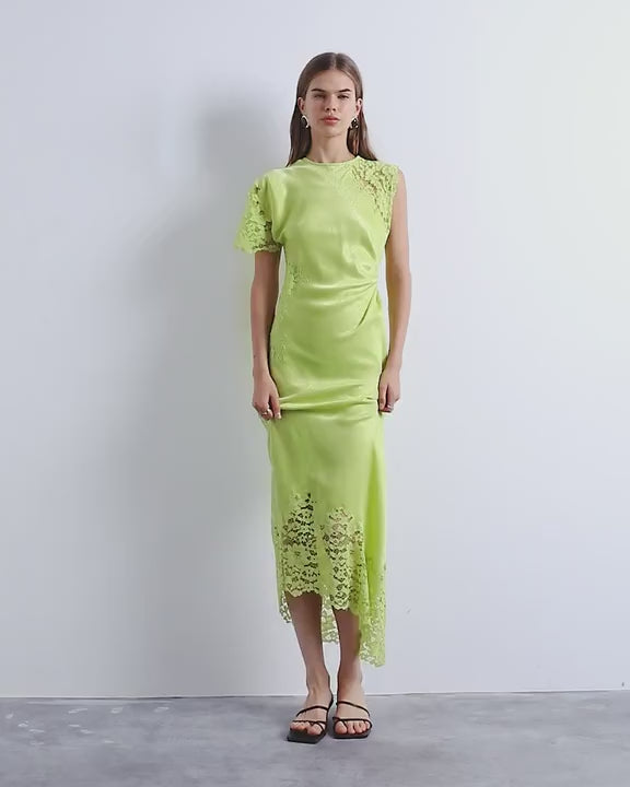 Dresses by TopshopThis dress is crafted from satin-style fabric in a lime green shade. Cut to a midi length, this style features a round neck, asymmetric sleeves and lace inserts.