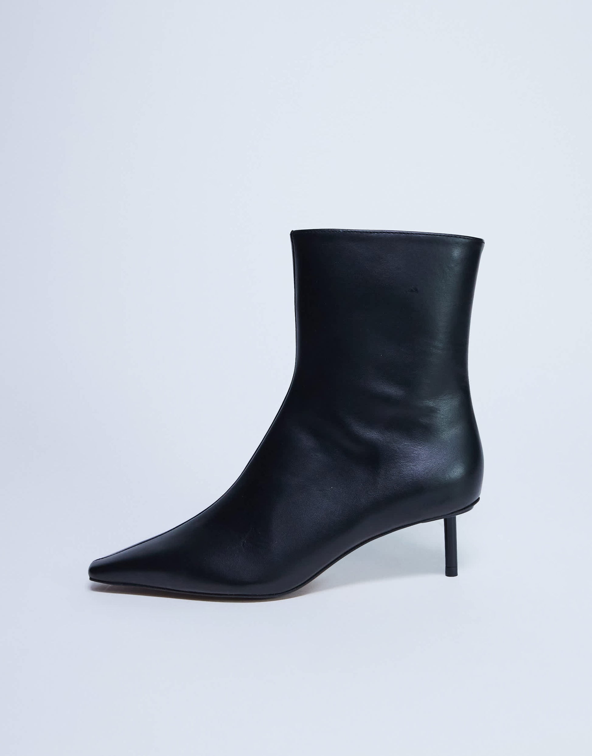 The Narla boots feature a mid-cut design that fastens via a zip to the side. They feature a pointed toe and a pin heel for a sleek feel. This style is crafted from soft, matte fabric in a timeless black shade.